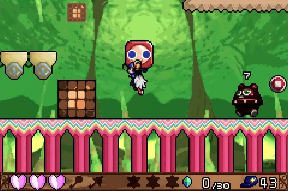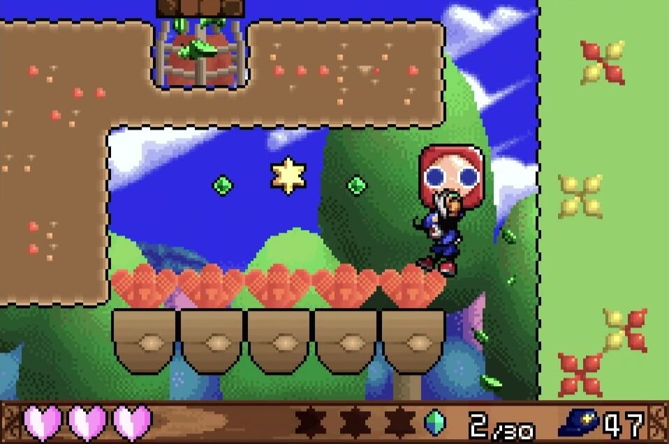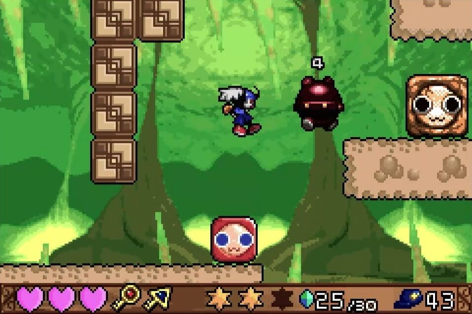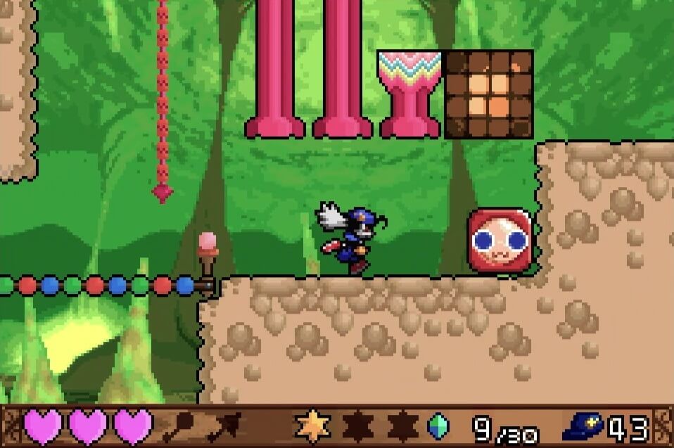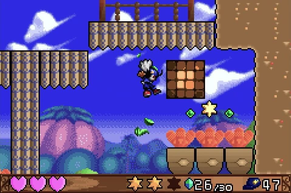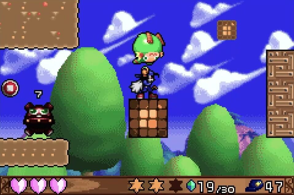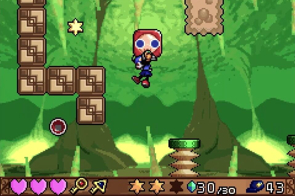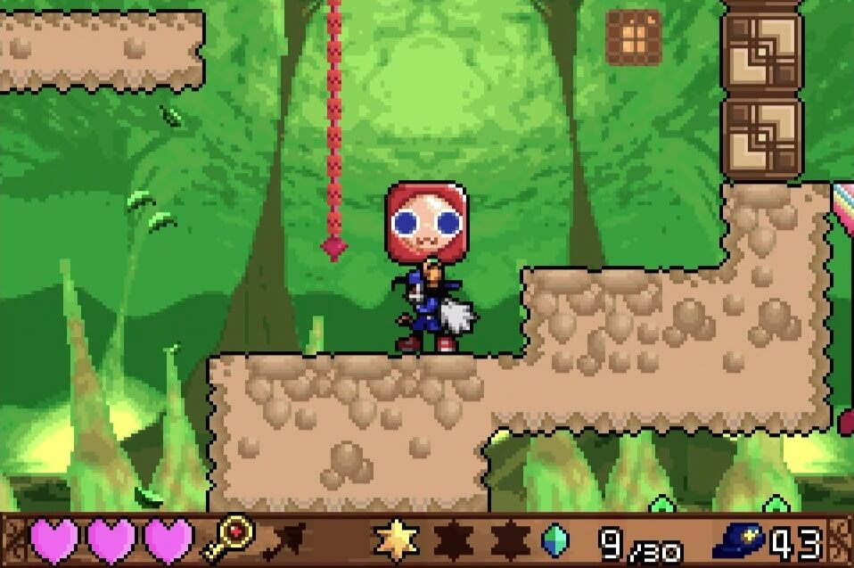 高い地点にある「夢のかけら」は、取るのは簡単だが着地に注意が必要。この時点では「敵が左方向に歩いている」のが見えるが、飛ぶと見えなくなるので注視してしておこう!