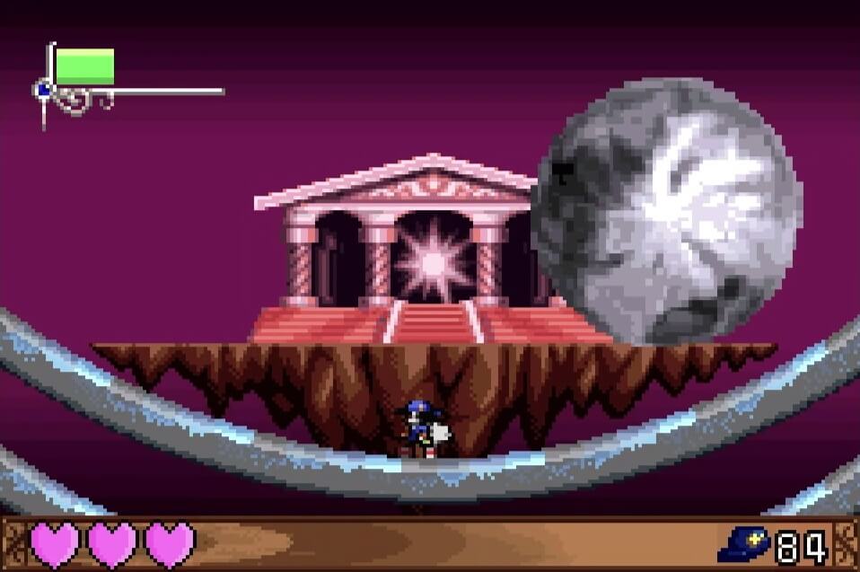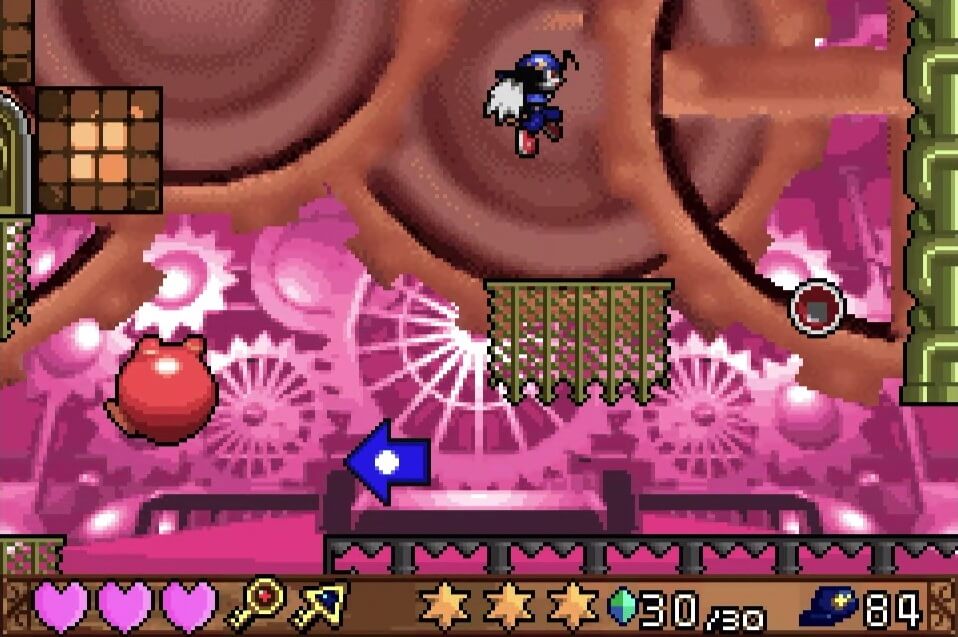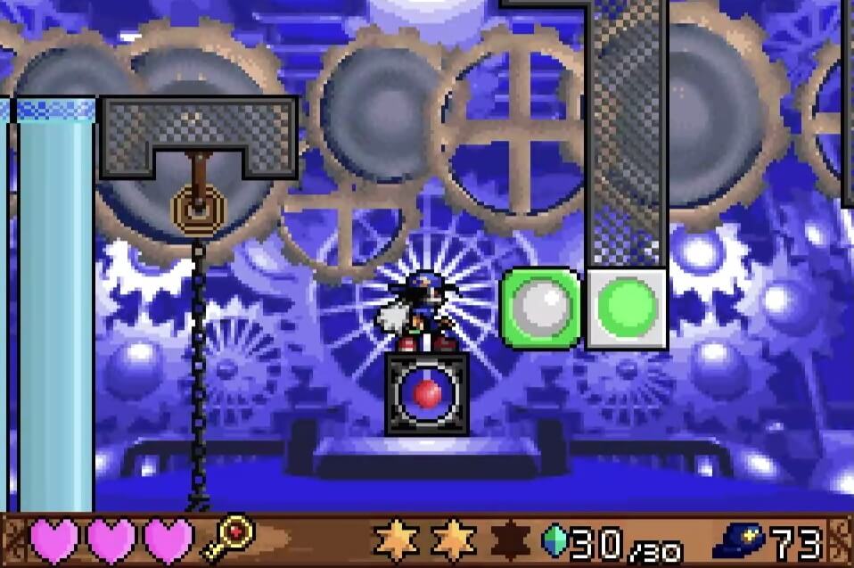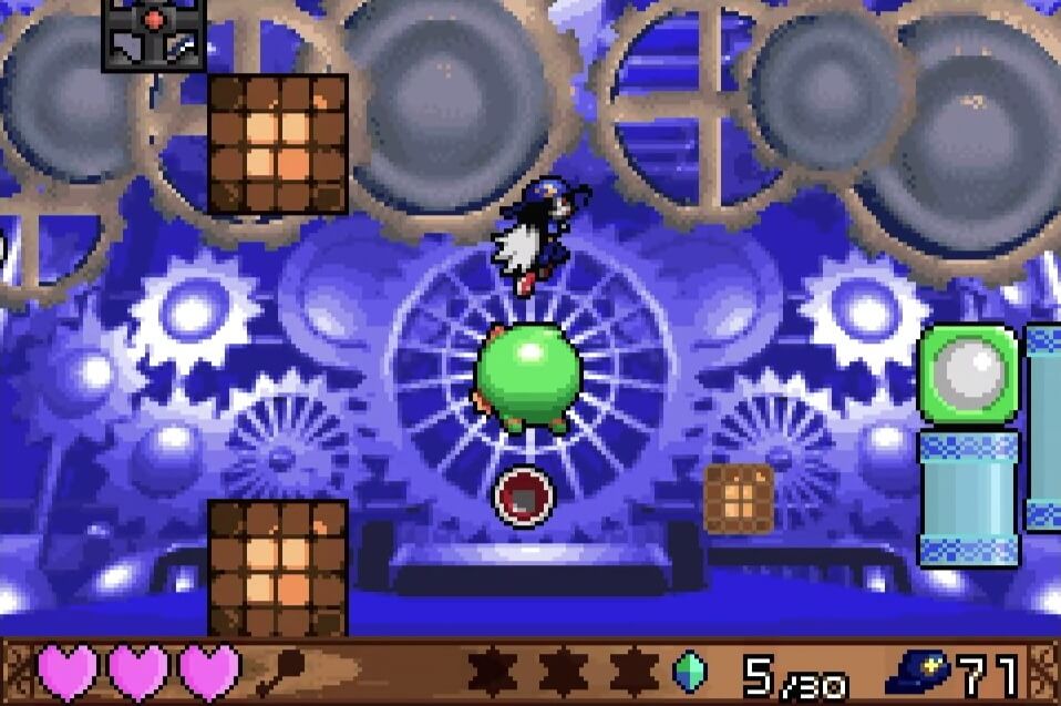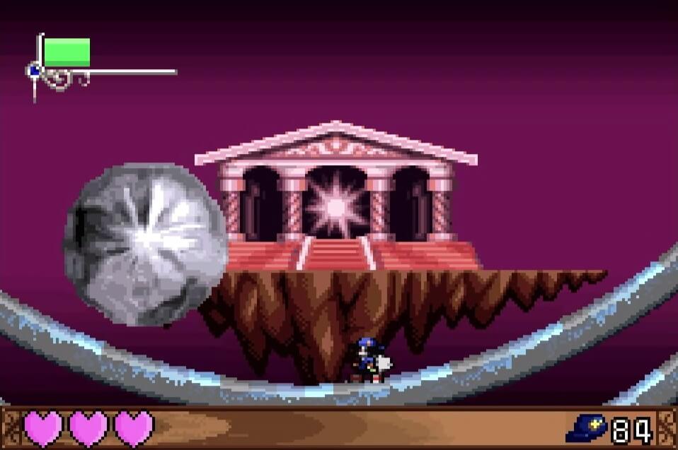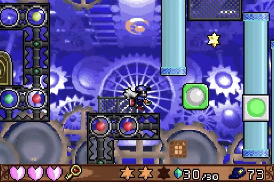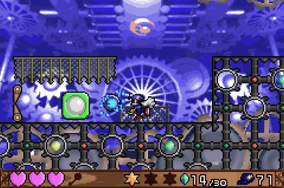 月のかけらを入手後、落ちる際に「磁石ブロック」を落としておくこと。忘れたらハコに密着して「風玉+方向キー」で抜けられるので、ハコを窪みに落とさない限り詰みはない。