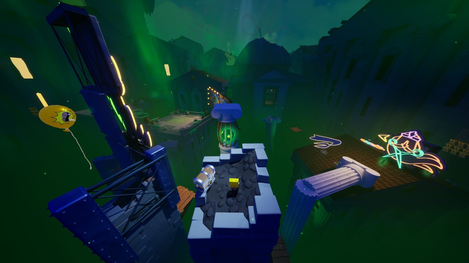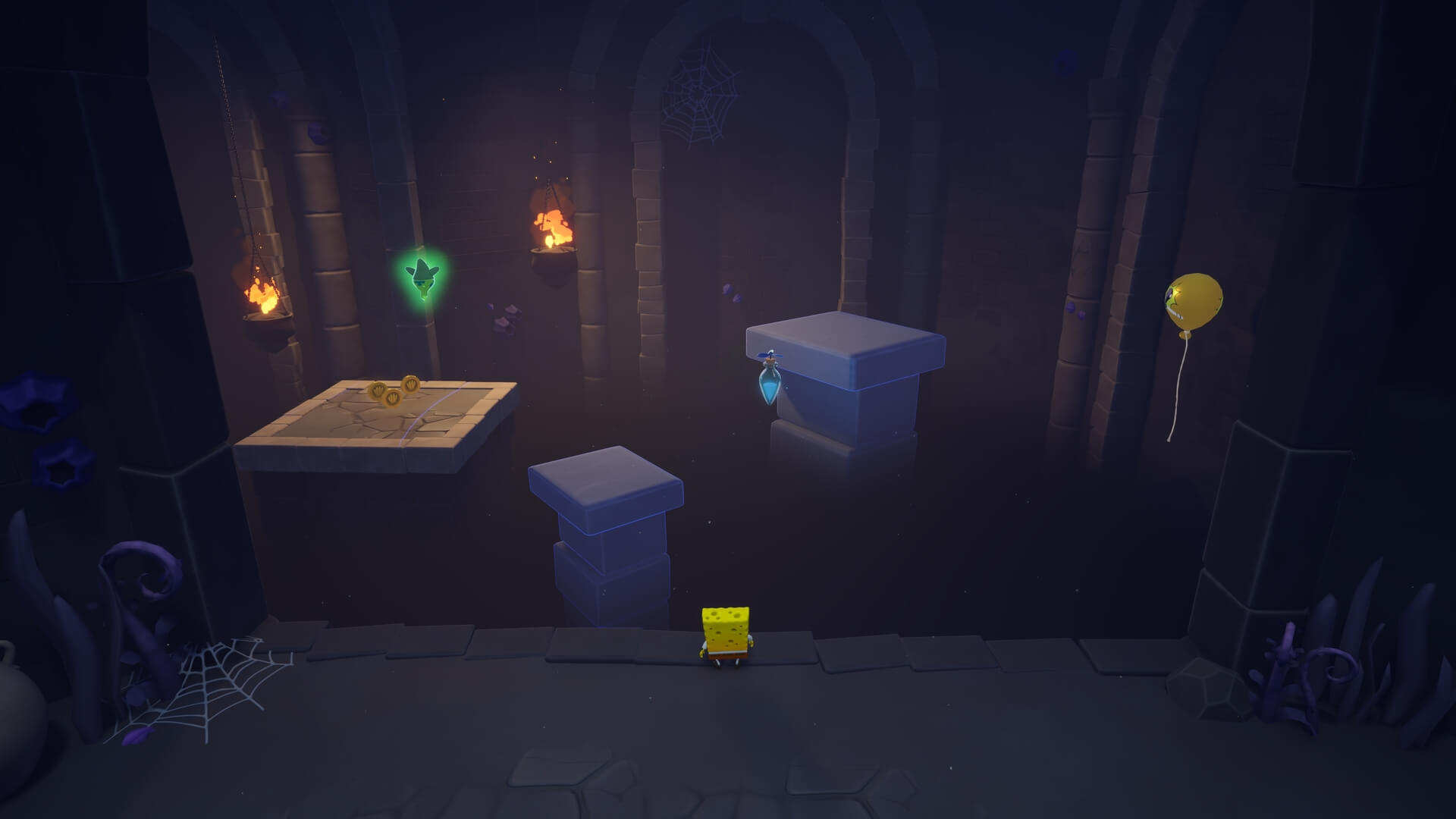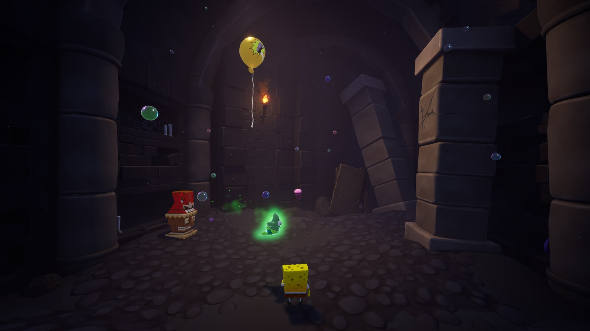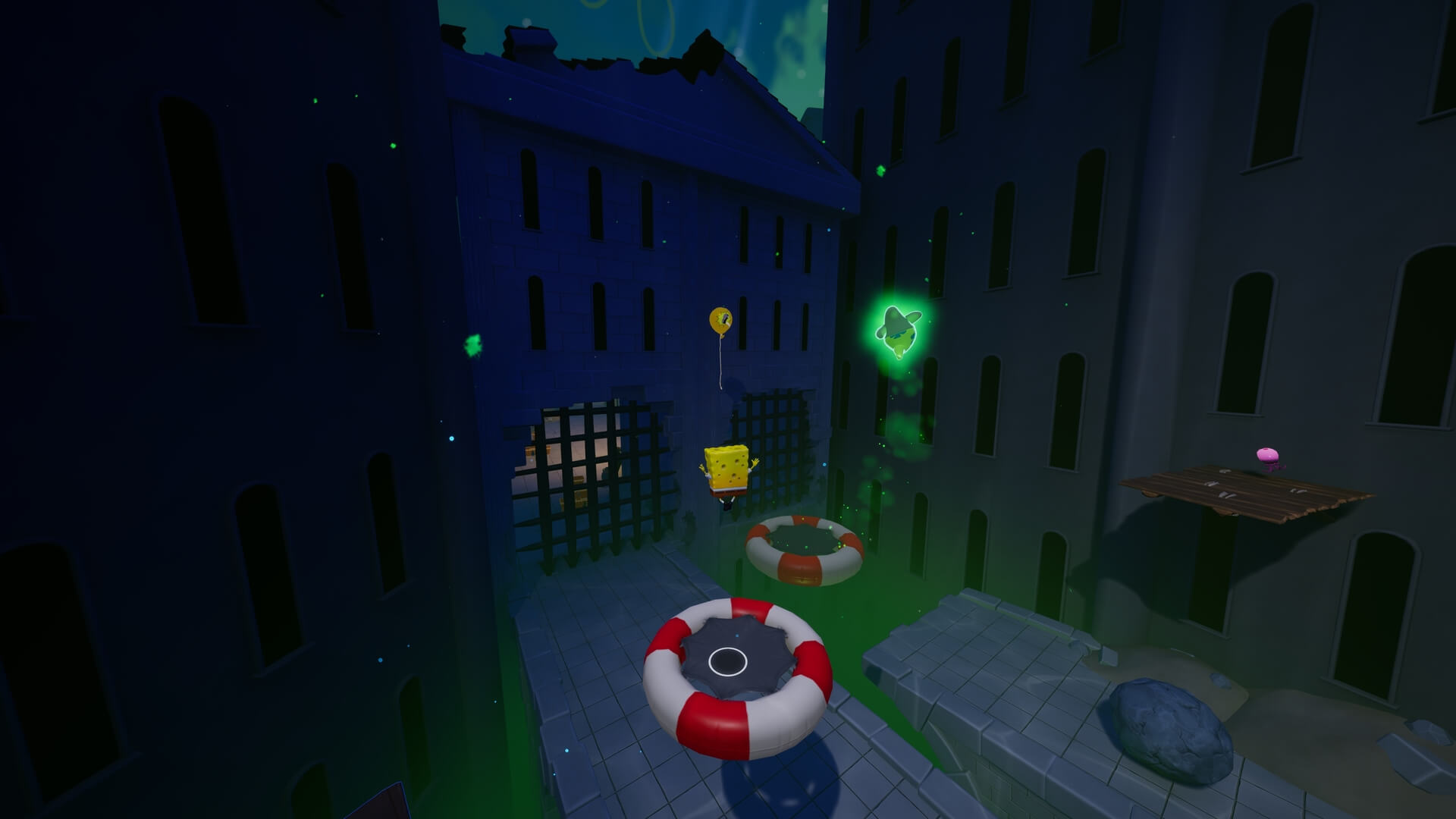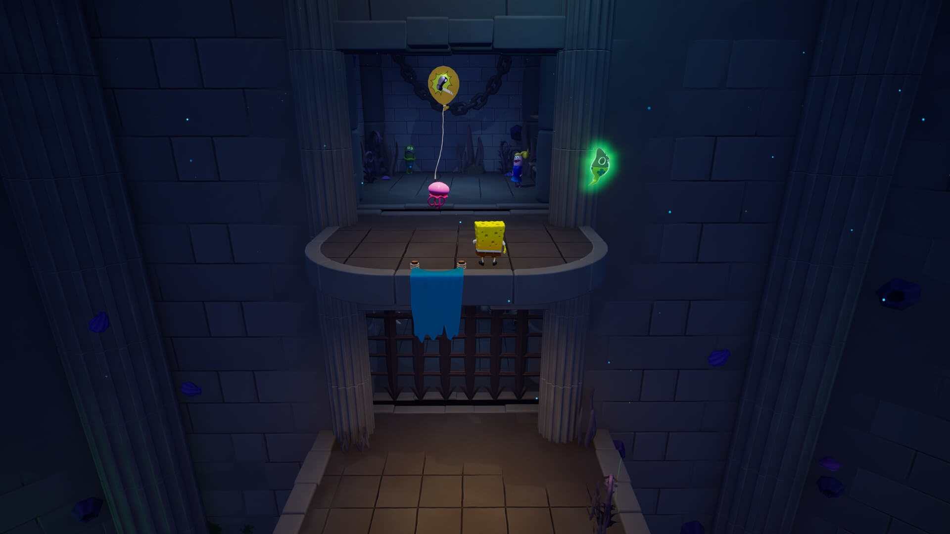パトリックで足場を作るだけでOK。重りは左右にあるので、これだけでは鉄格子は開かない。右側の重りも破壊しよう!