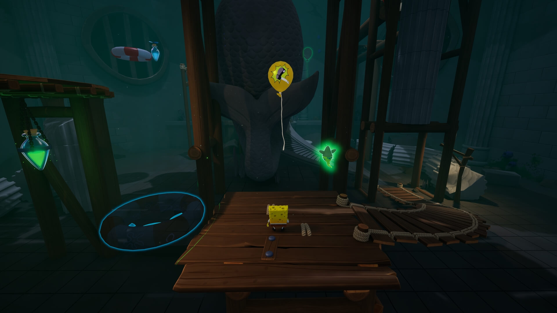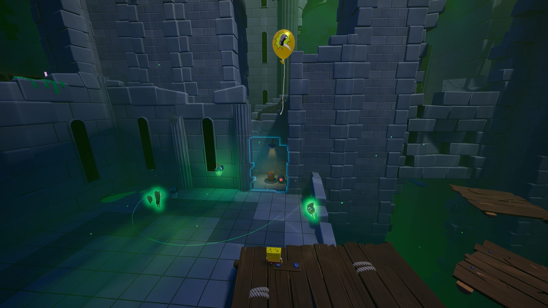 魔法のランタンに付いて進む場所では、終了時は「青色」になっているのが基本。橋の下に爆弾が隠されているので、ランタンを「緑に変えて橋を透過させる」必要がある。透過と同時に落下しないように注意!