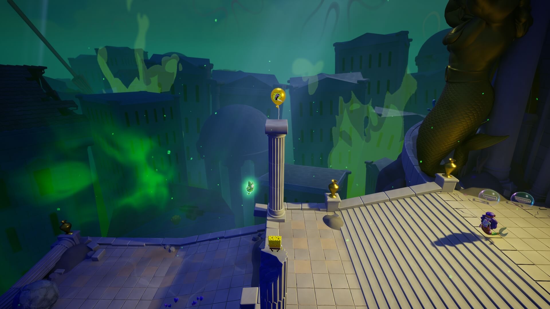 ぶら下がったランタンを「緑に変える」だけで気絶させられるが。像が青く変色しているので、ランタンを「青に変えて」実体化させよう!