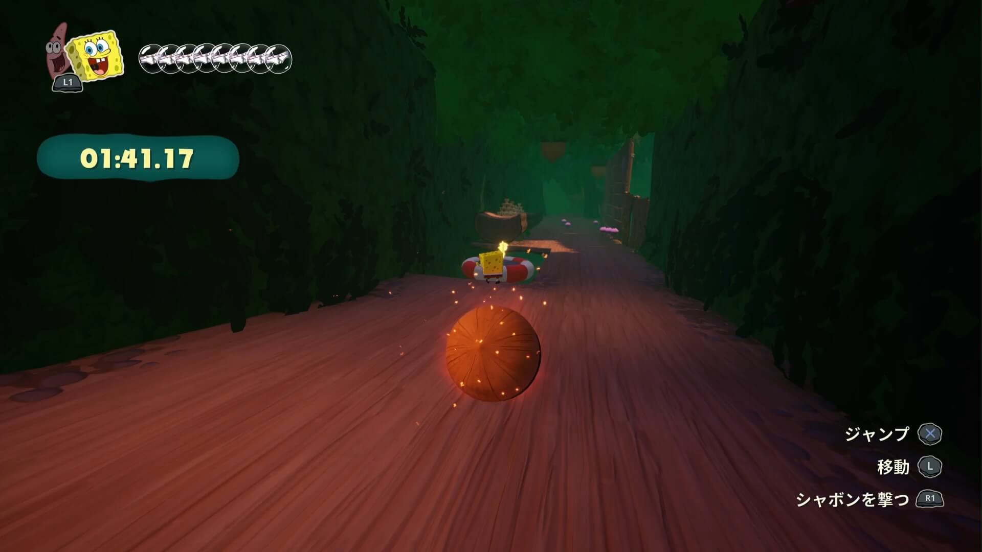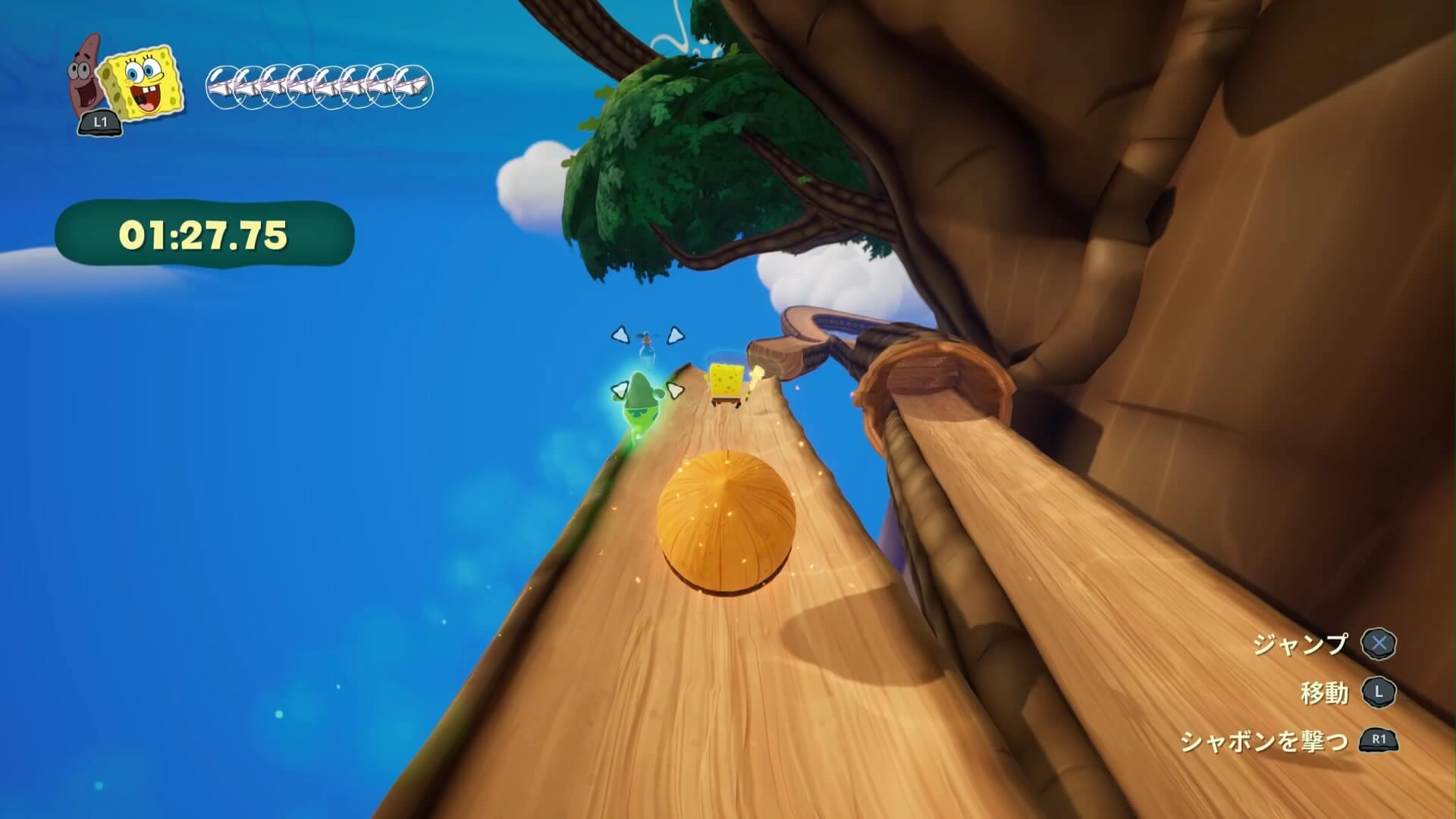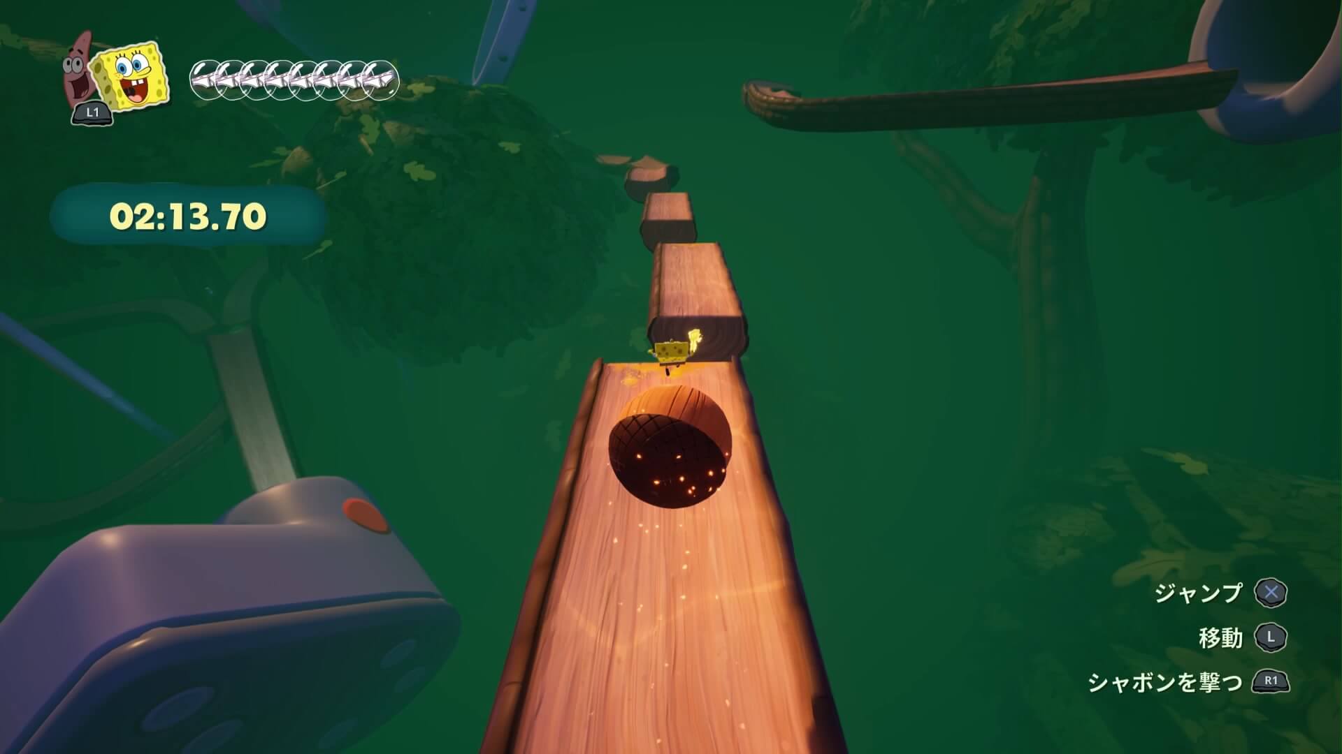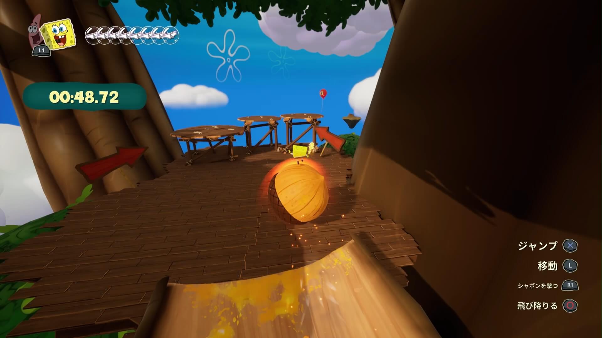 3つの足場があるが「一番右の足場」に向かって転がり、ドングリから降りる。風船への「空手キックは照準表示後すぐ」に行うのが理想。