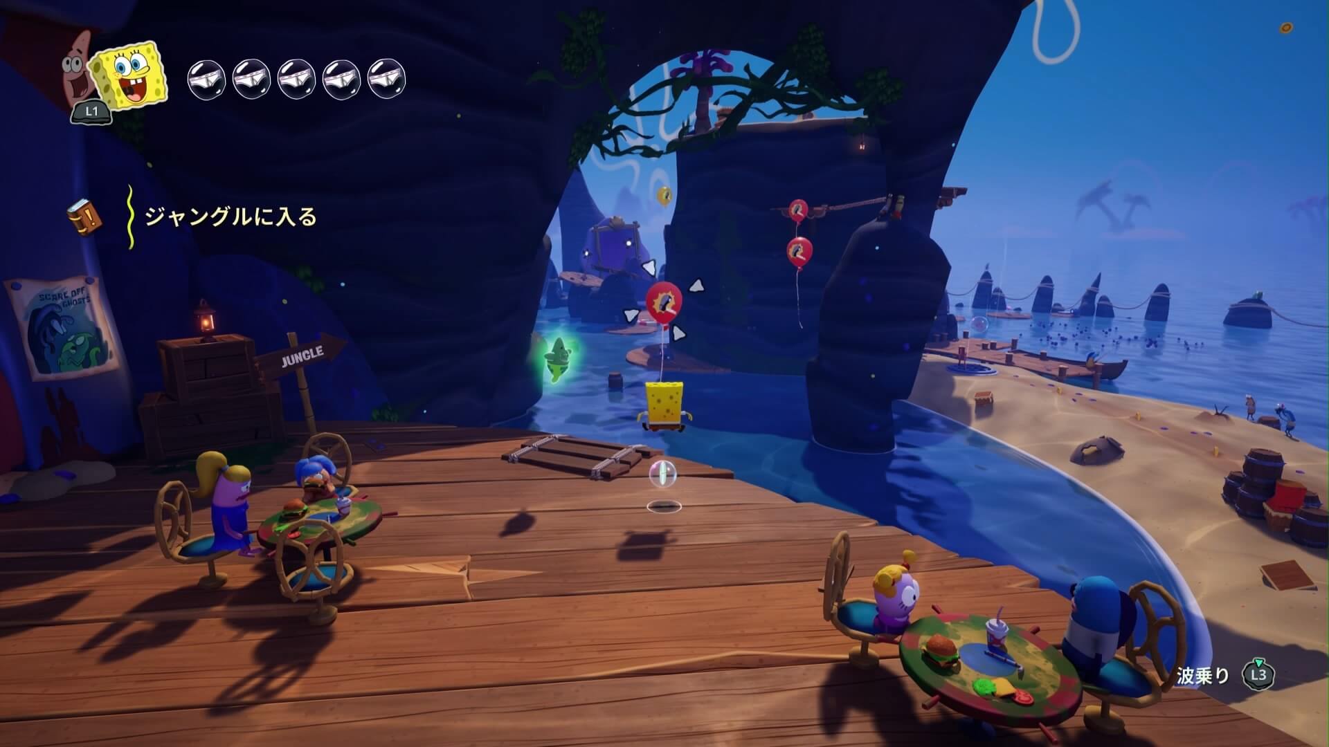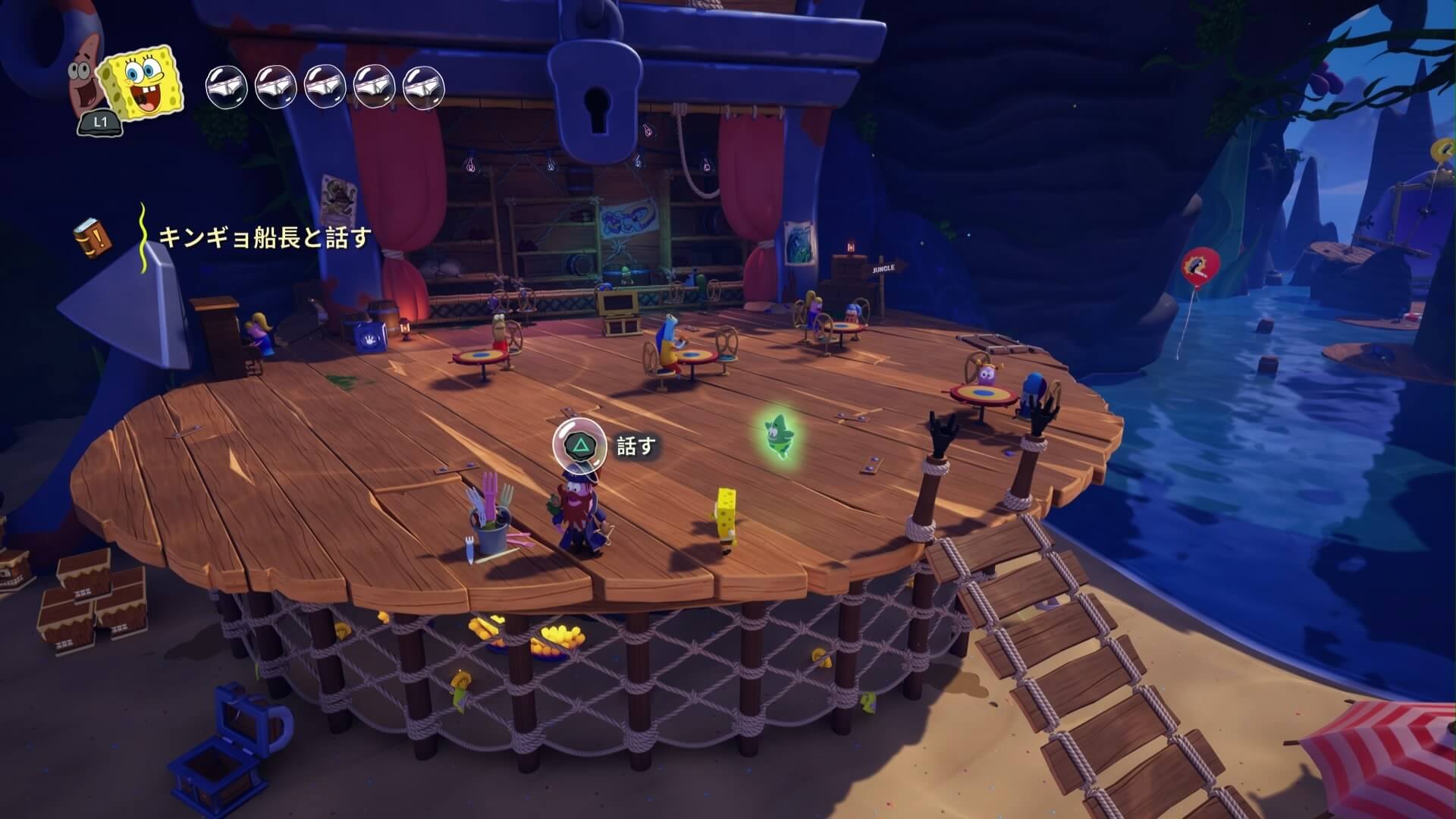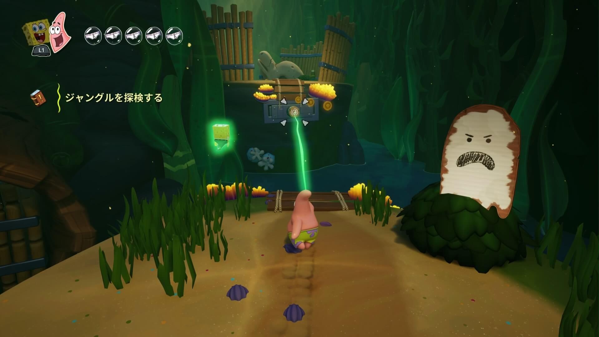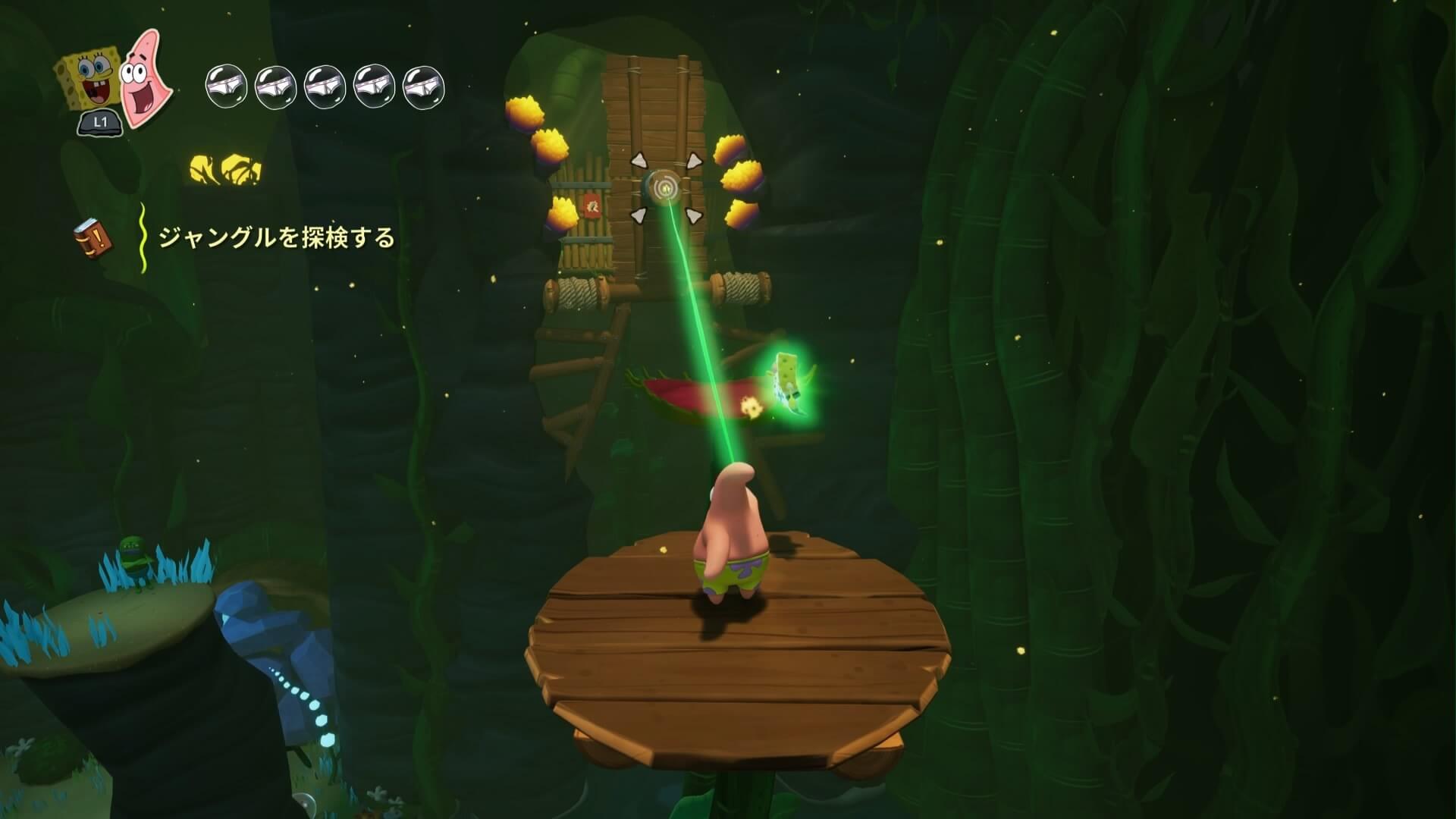 ジャングルへは「ビーチの東側」より。キンギョ船長から「ジャングルのカギ」を貰い、風船をターゲットに「空手キック」で崖の上へ。カギ=パトリックの「遠くの物を掴む」の習得。この技で扉を開けよう!