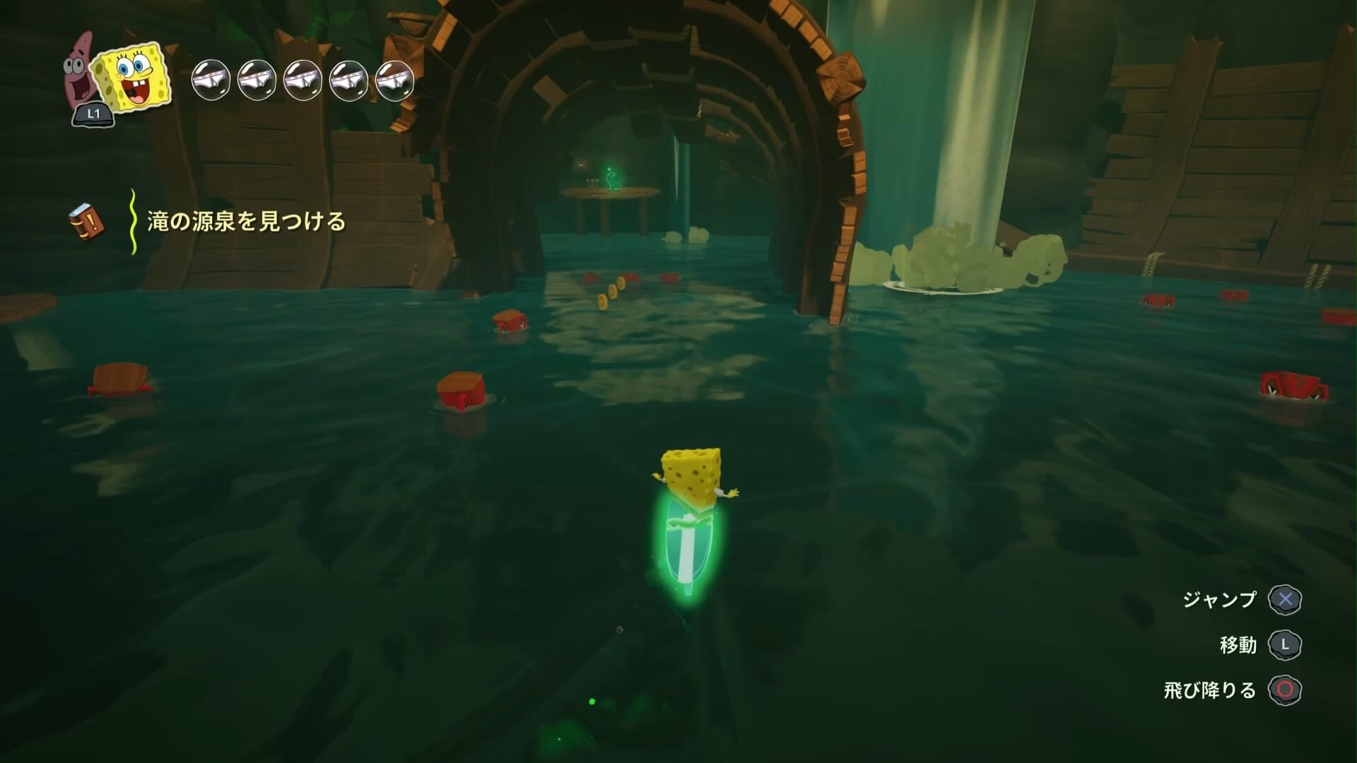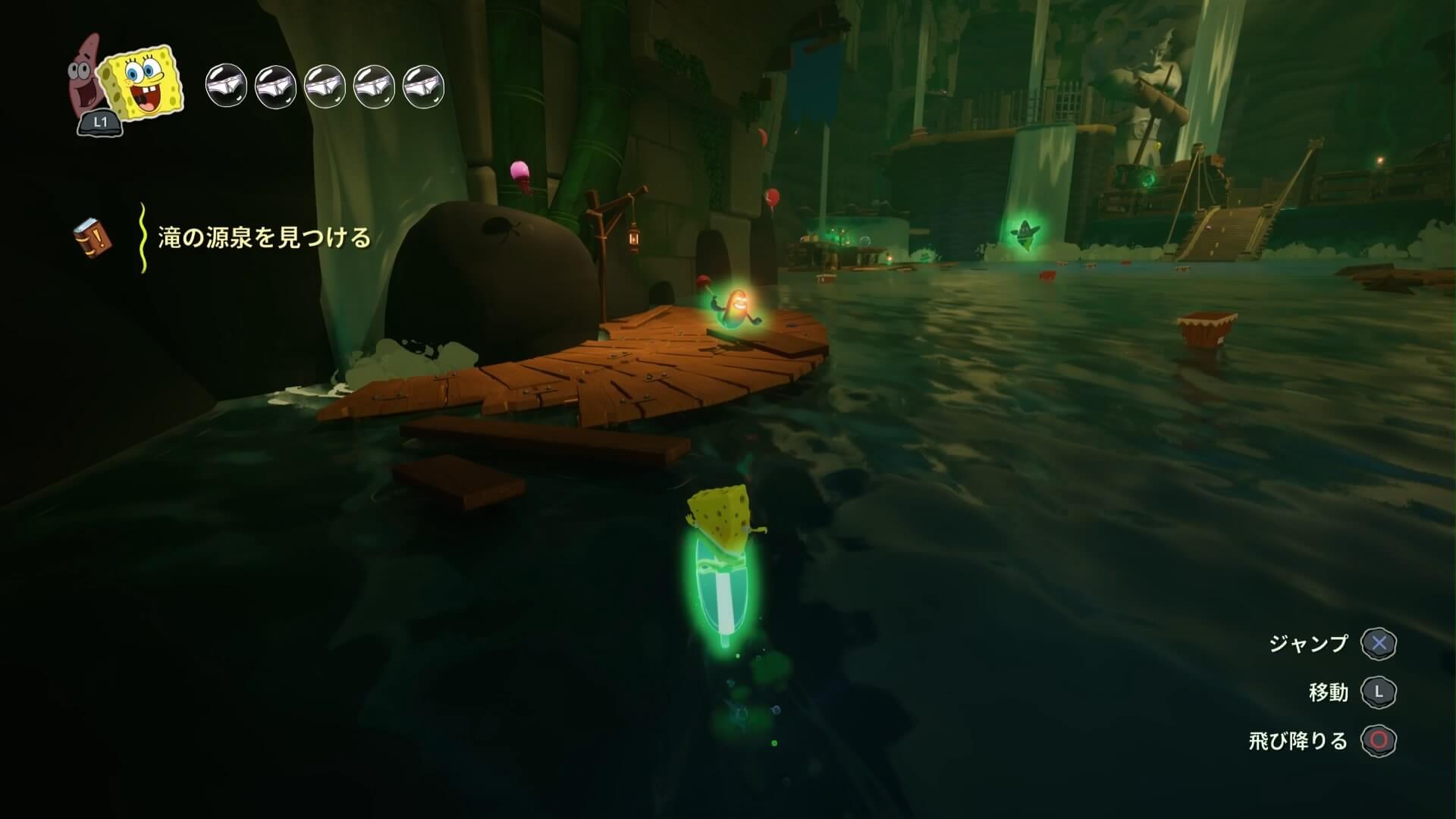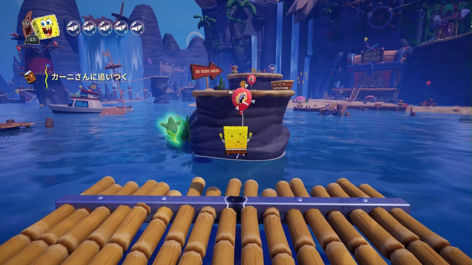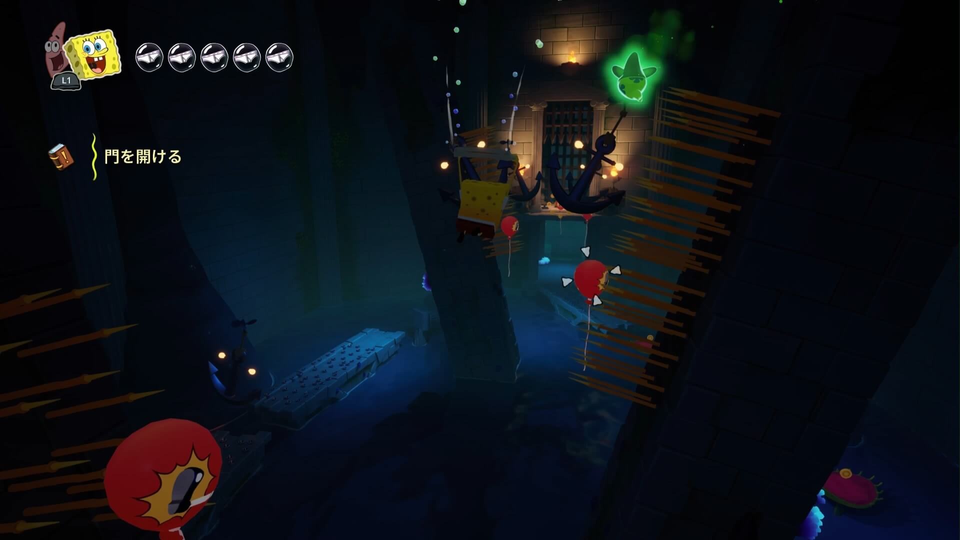 ジャングルへは「ビーチの東側」より。キンギョ船長から「ジャングルのカギ」を貰い、風船をターゲットに「空手キック」で崖の上へ。カギ=パトリックの「遠くの物を掴む」の習得。この技で扉を開けよう!