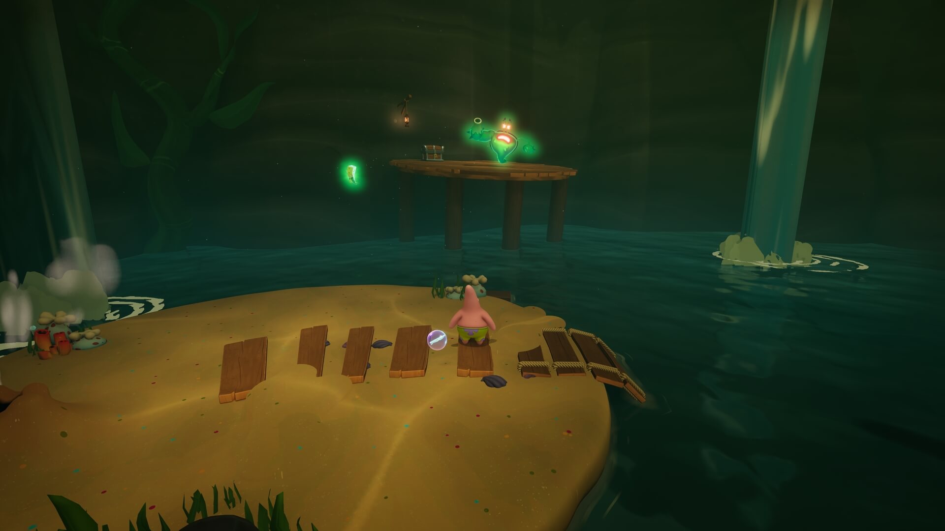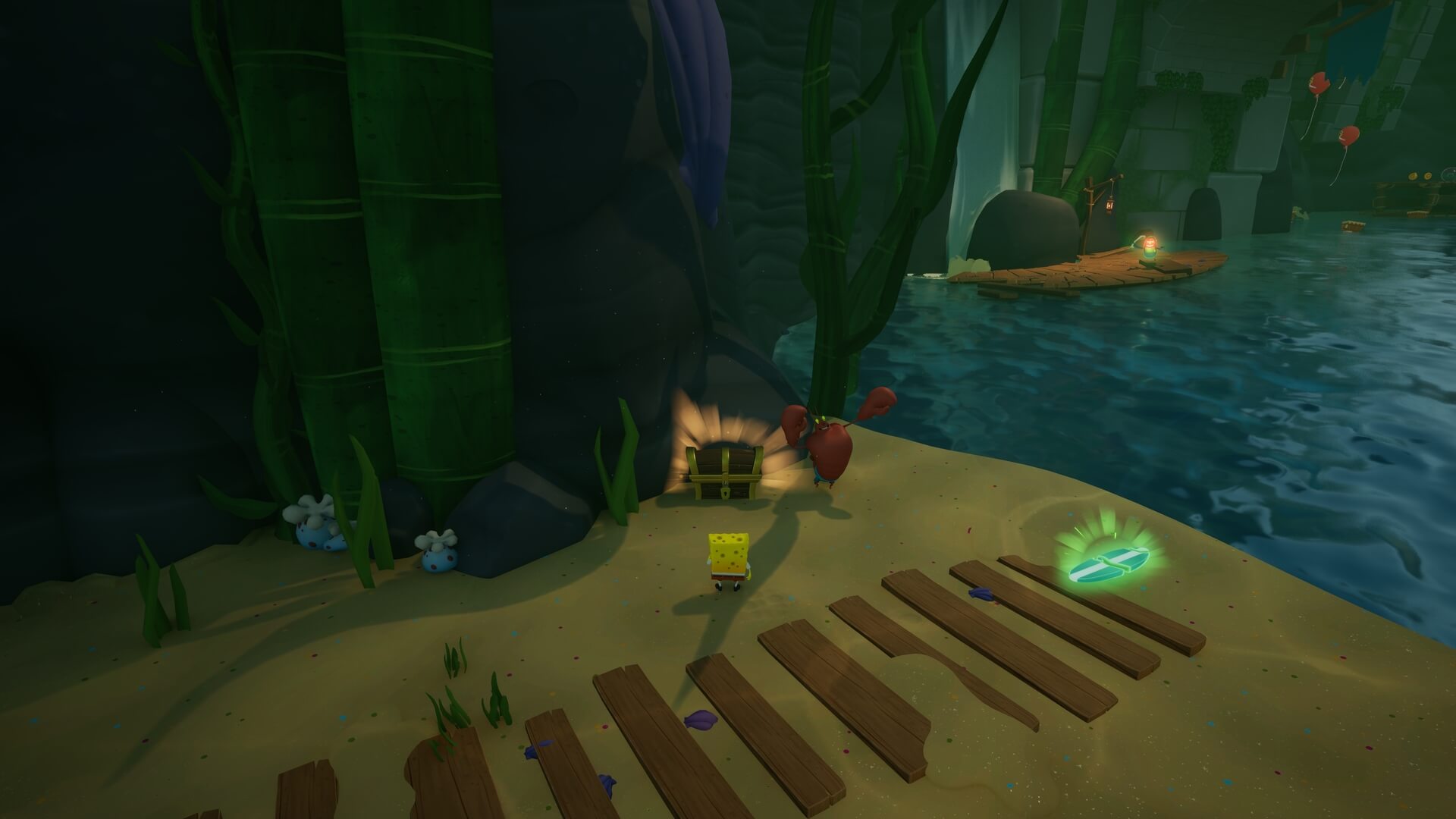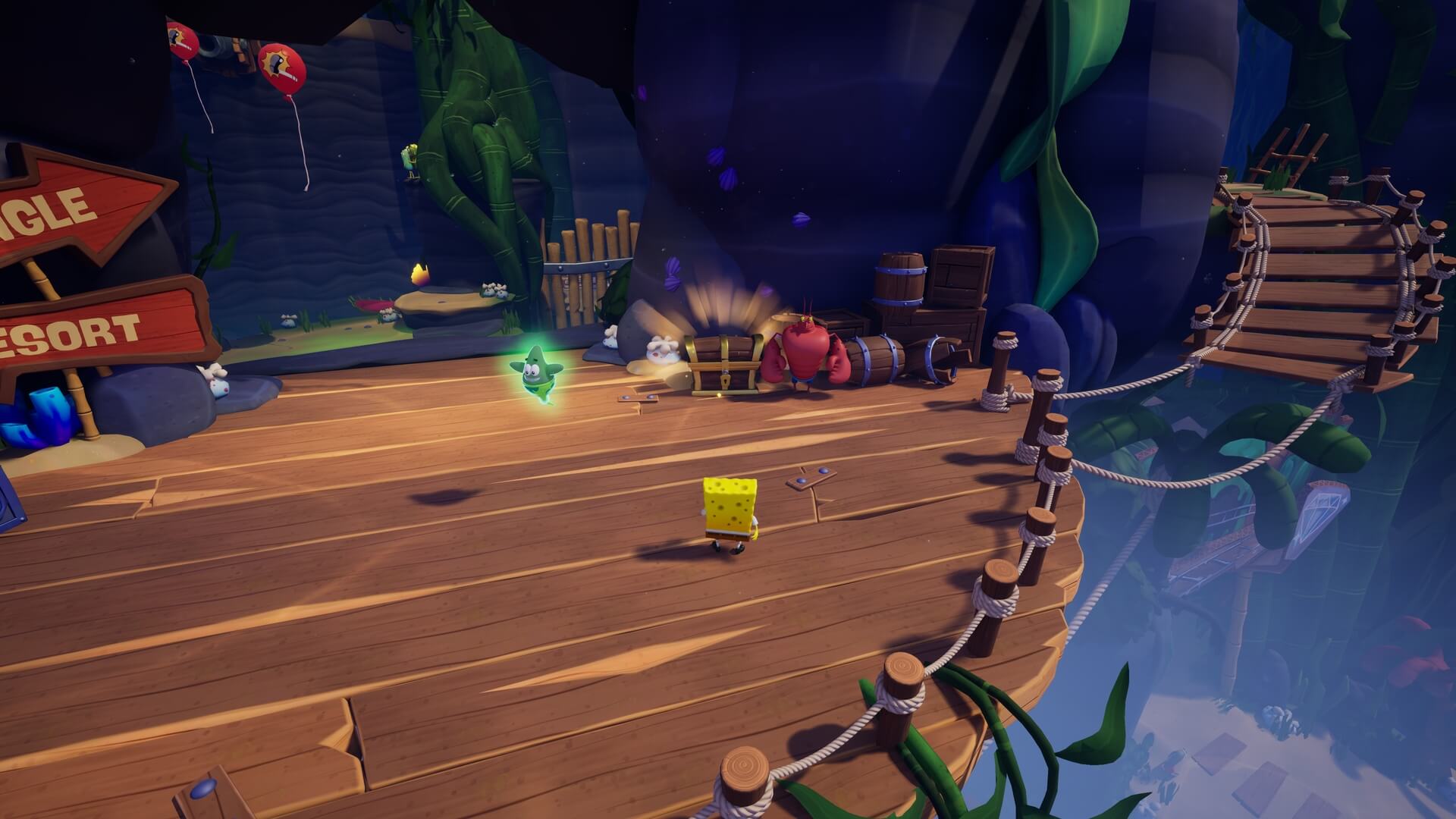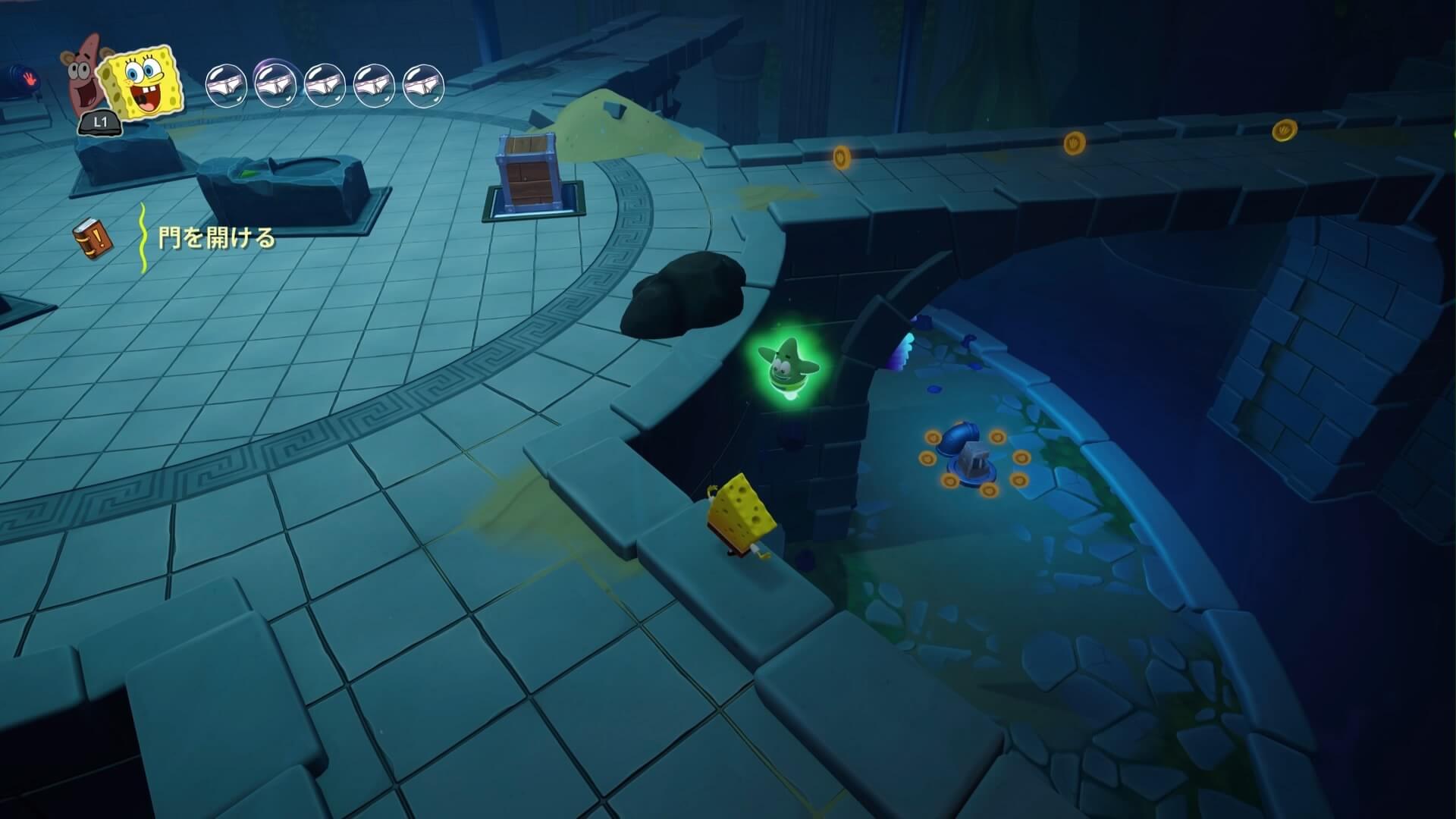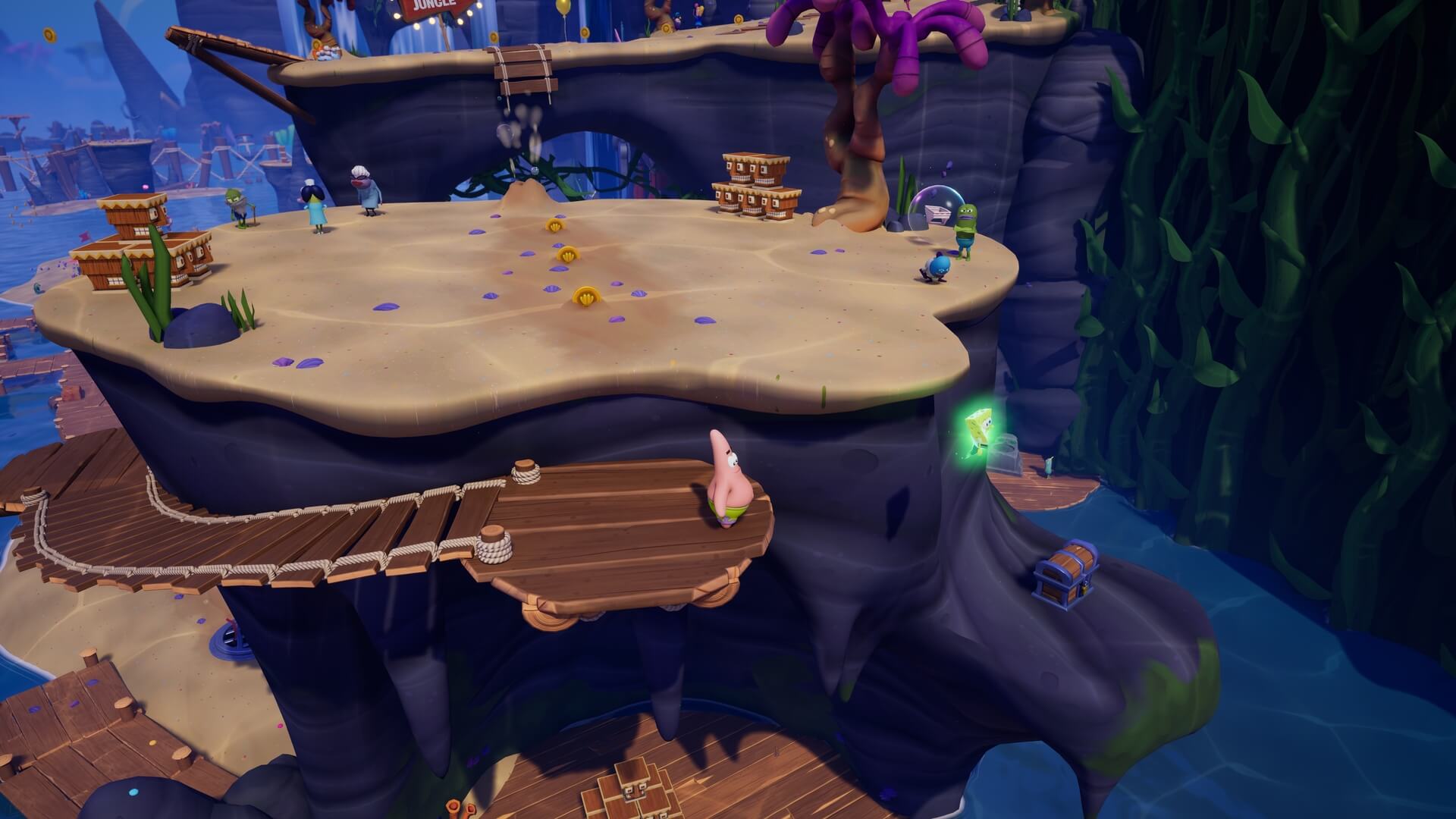 ジャングルへは「ビーチの東側」より。キンギョ船長から「ジャングルのカギ」を貰い、風船をターゲットに「空手キック」で崖の上へ。カギ=パトリックの「遠くの物を掴む」の習得。この技で扉を開けよう!