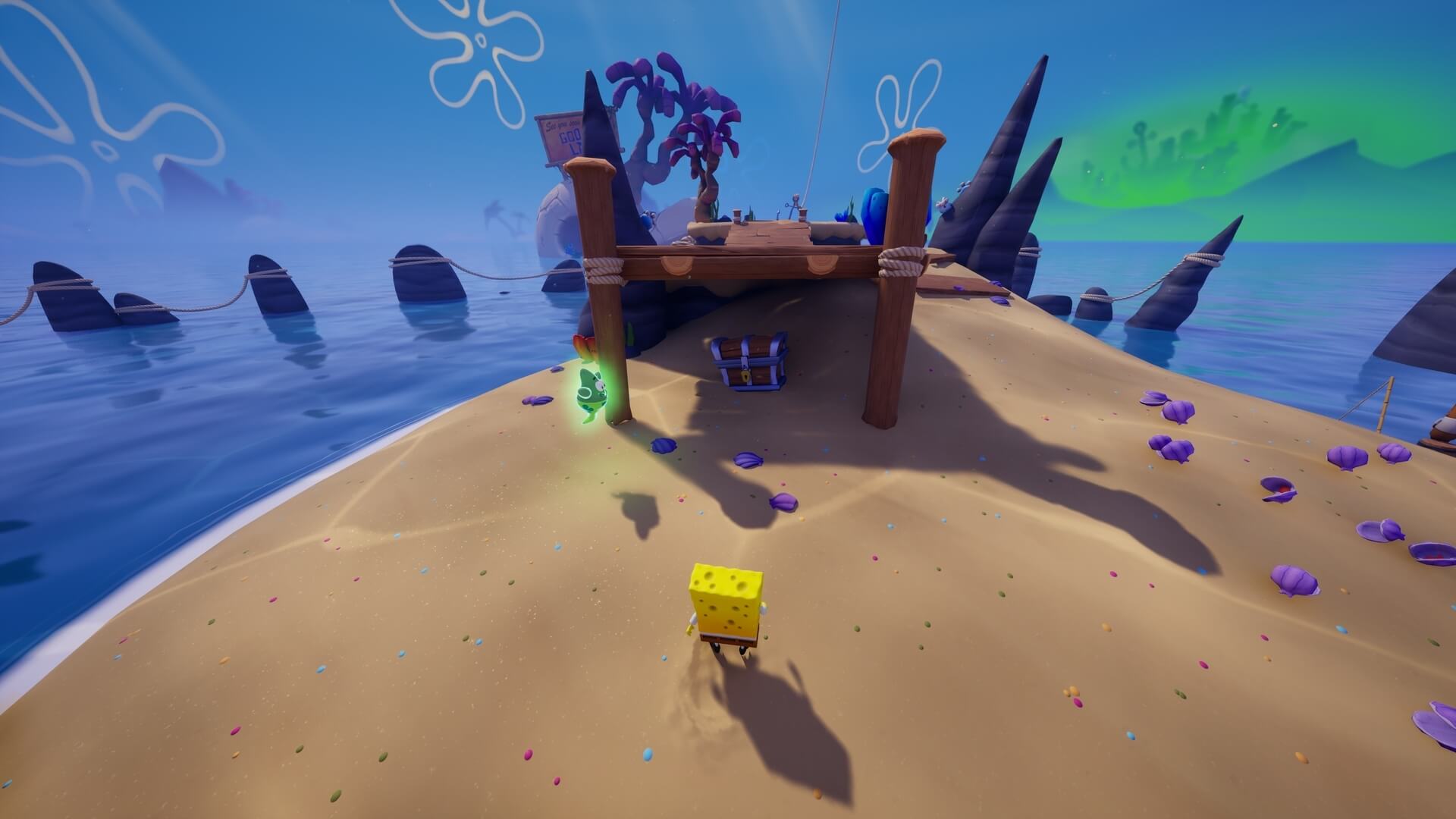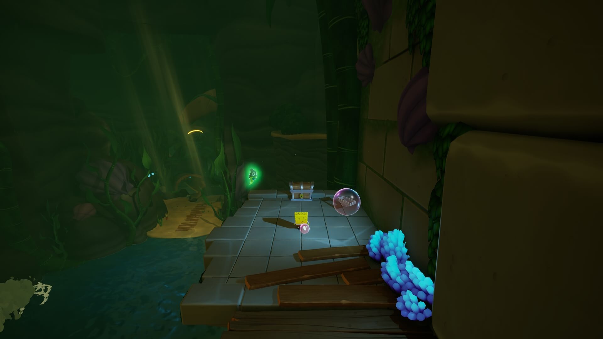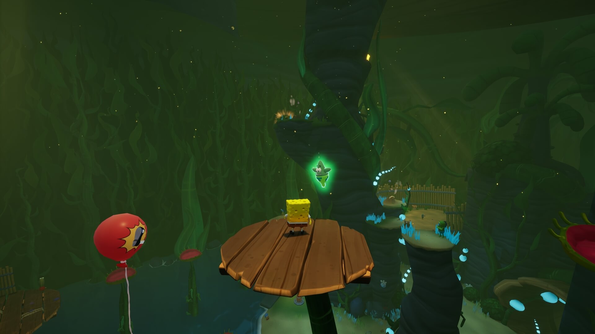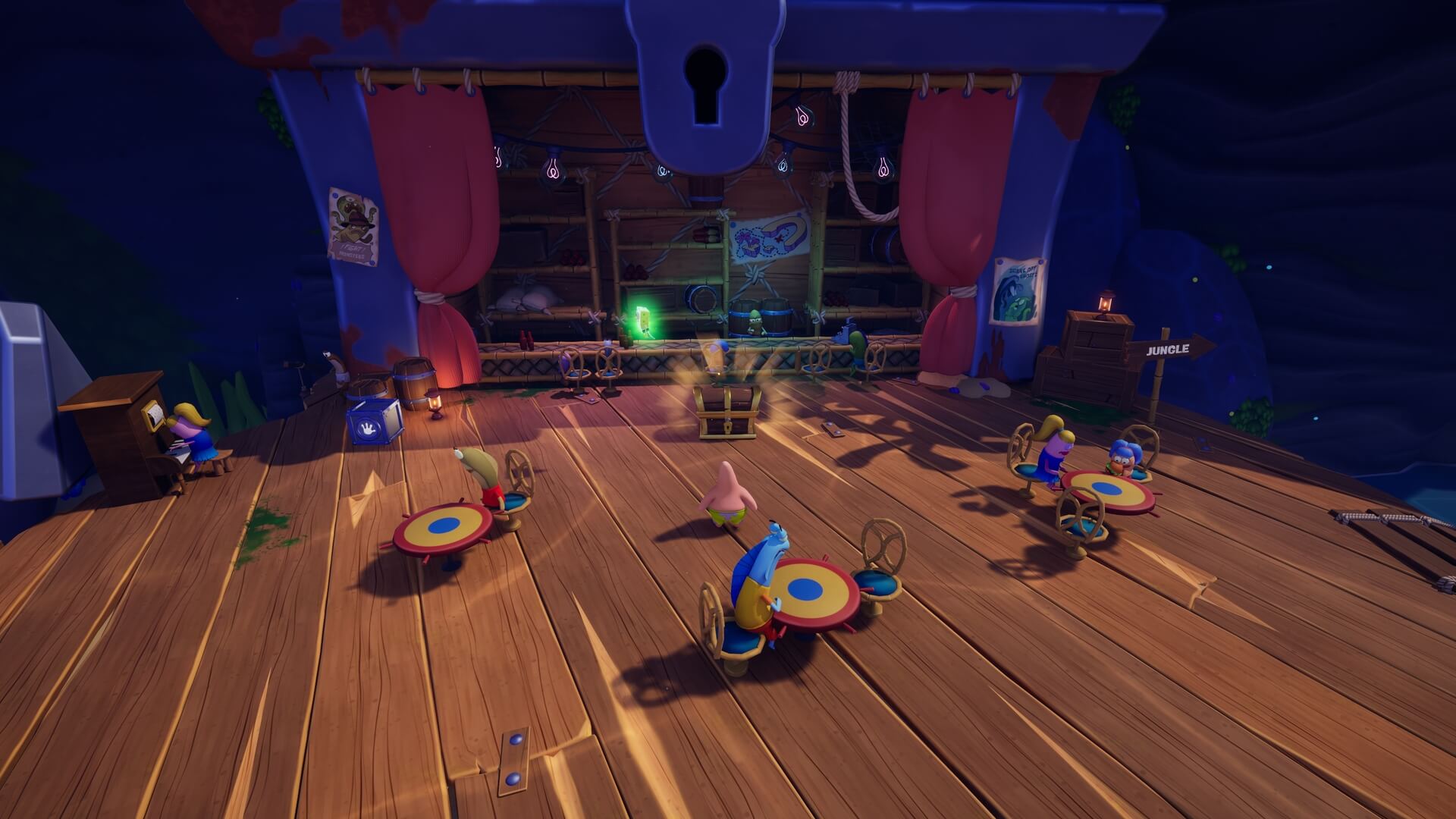 ジャングルへは「ビーチの東側」より。キンギョ船長から「ジャングルのカギ」を貰い、風船をターゲットに「空手キック」で崖の上へ。カギ=パトリックの「遠くの物を掴む」の習得。この技で扉を開けよう!