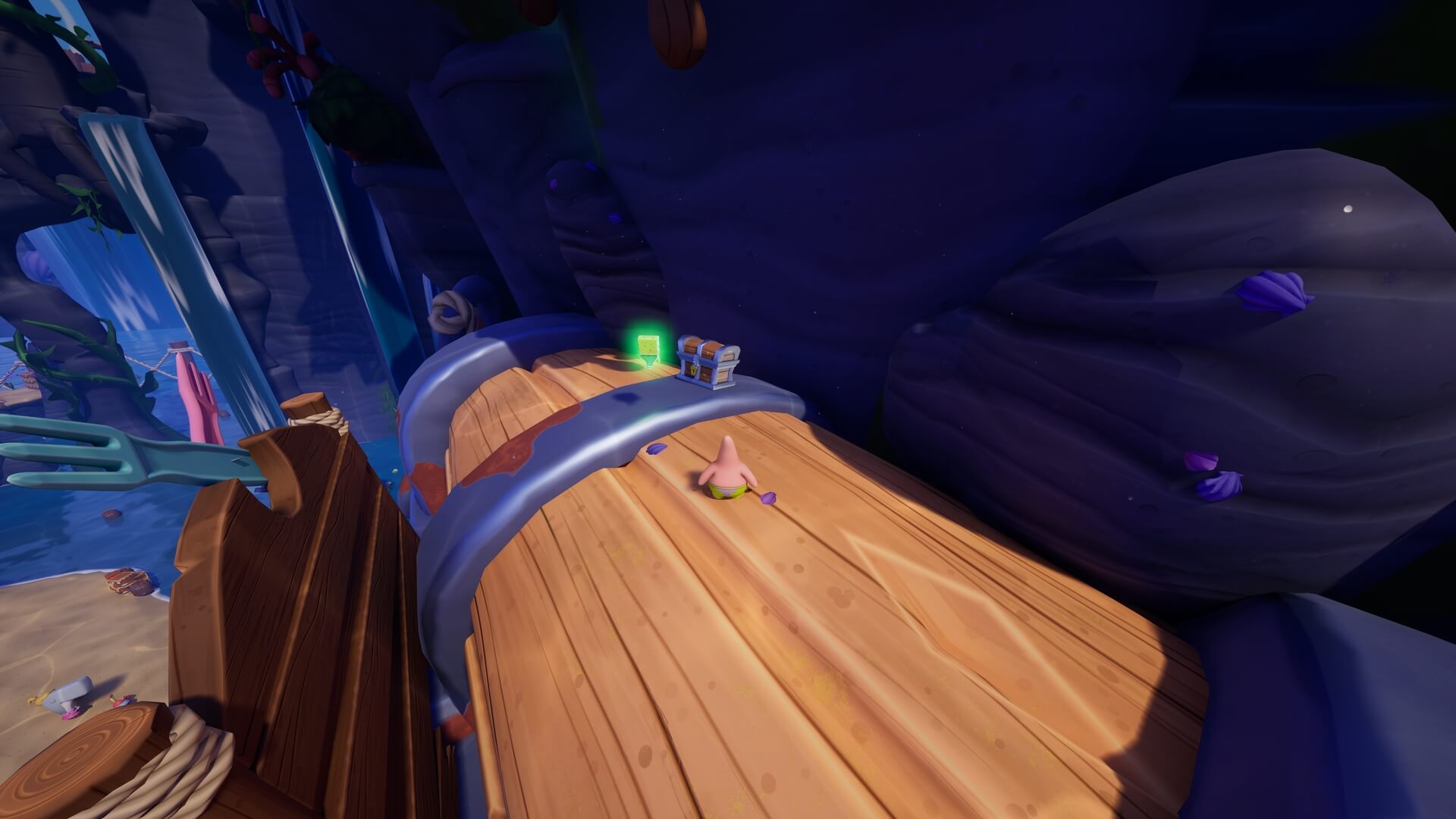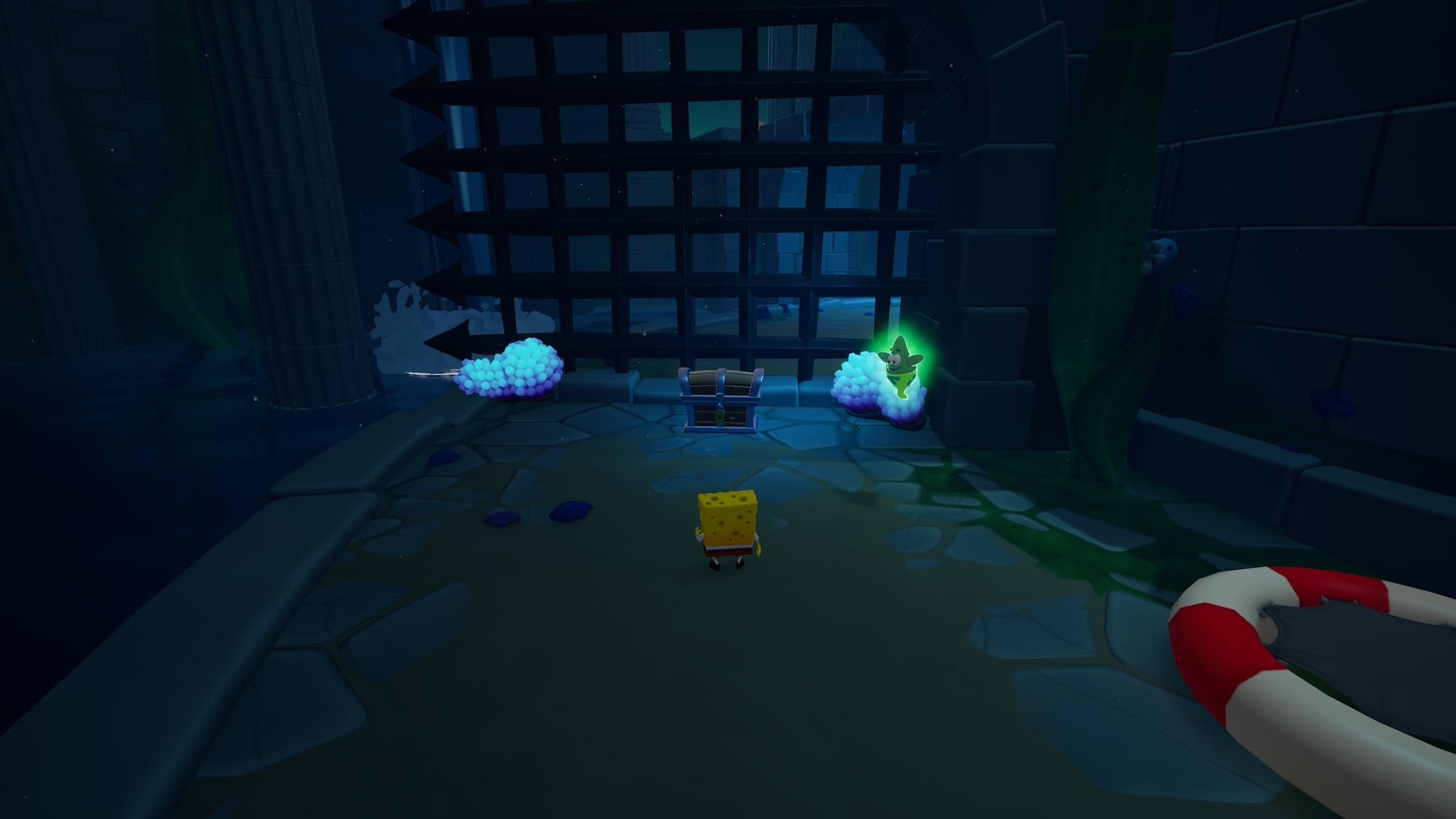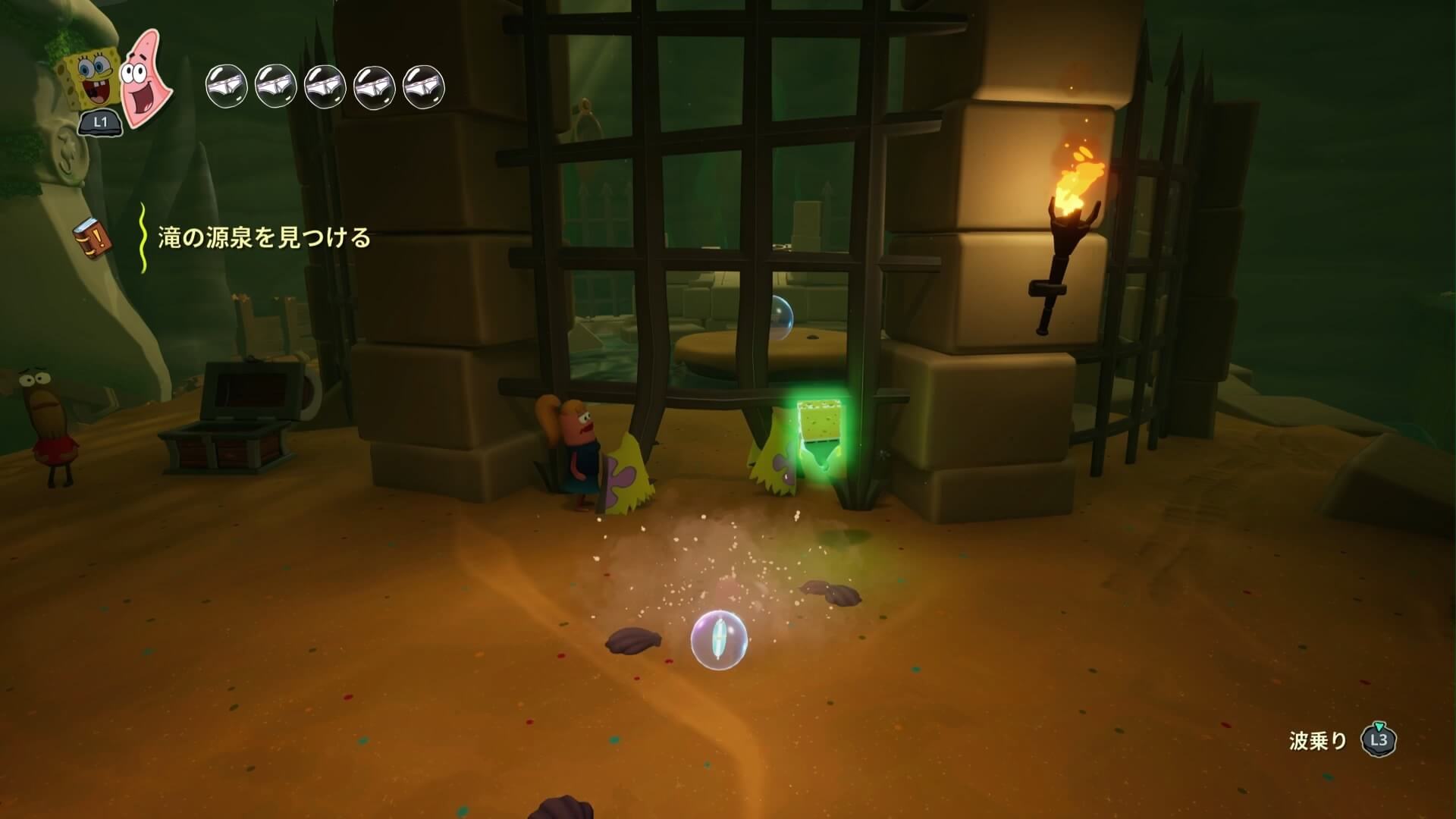 鉄格子がある場所まで登ったら「パトリック」で地面に潜り、鉄格子の奥にある「舵輪」を回そう!これで、さらに登るための足場が現れる。
