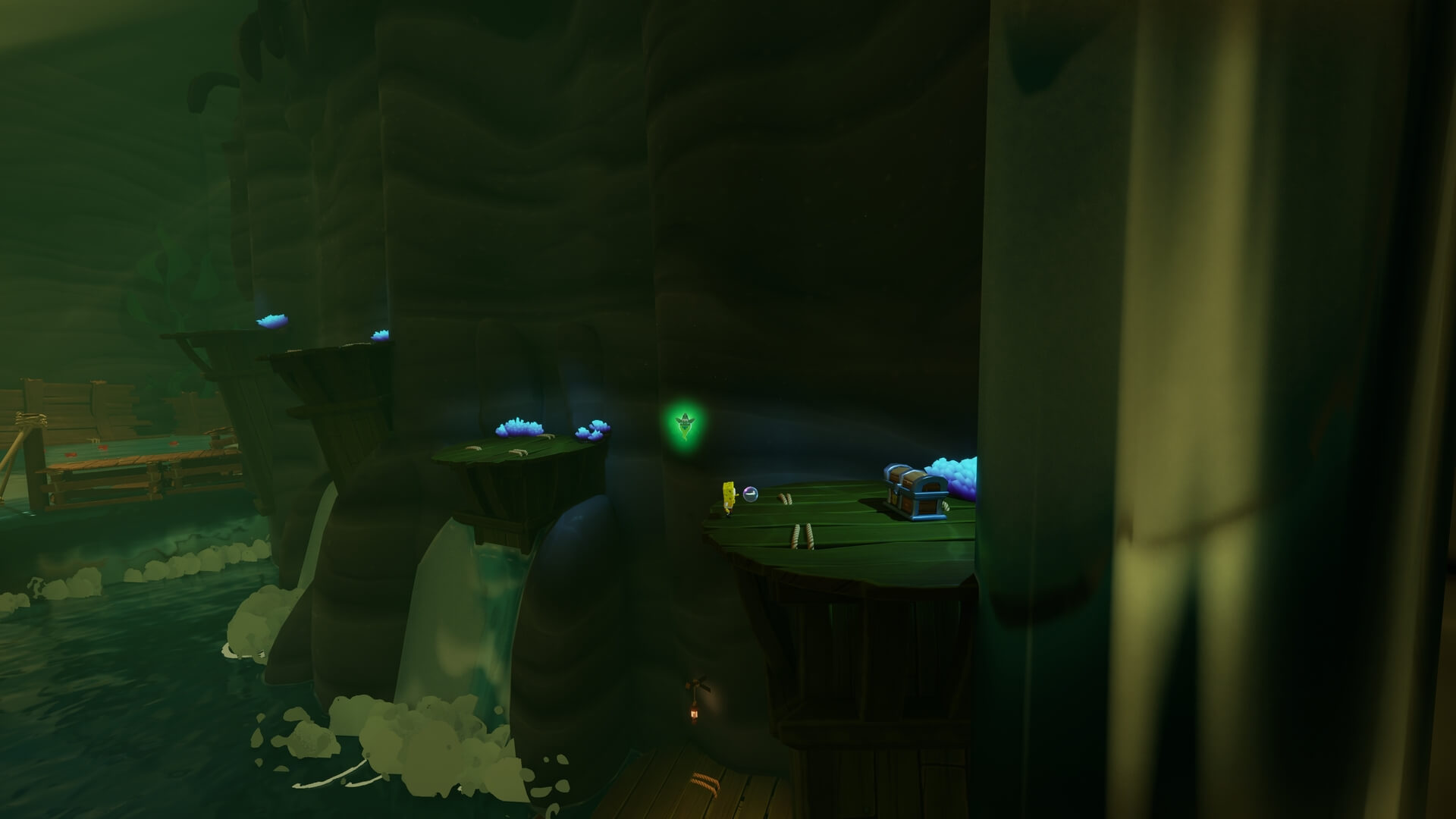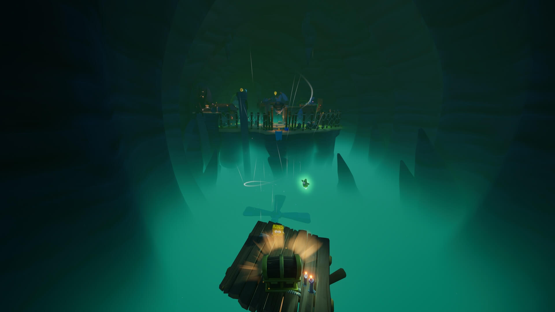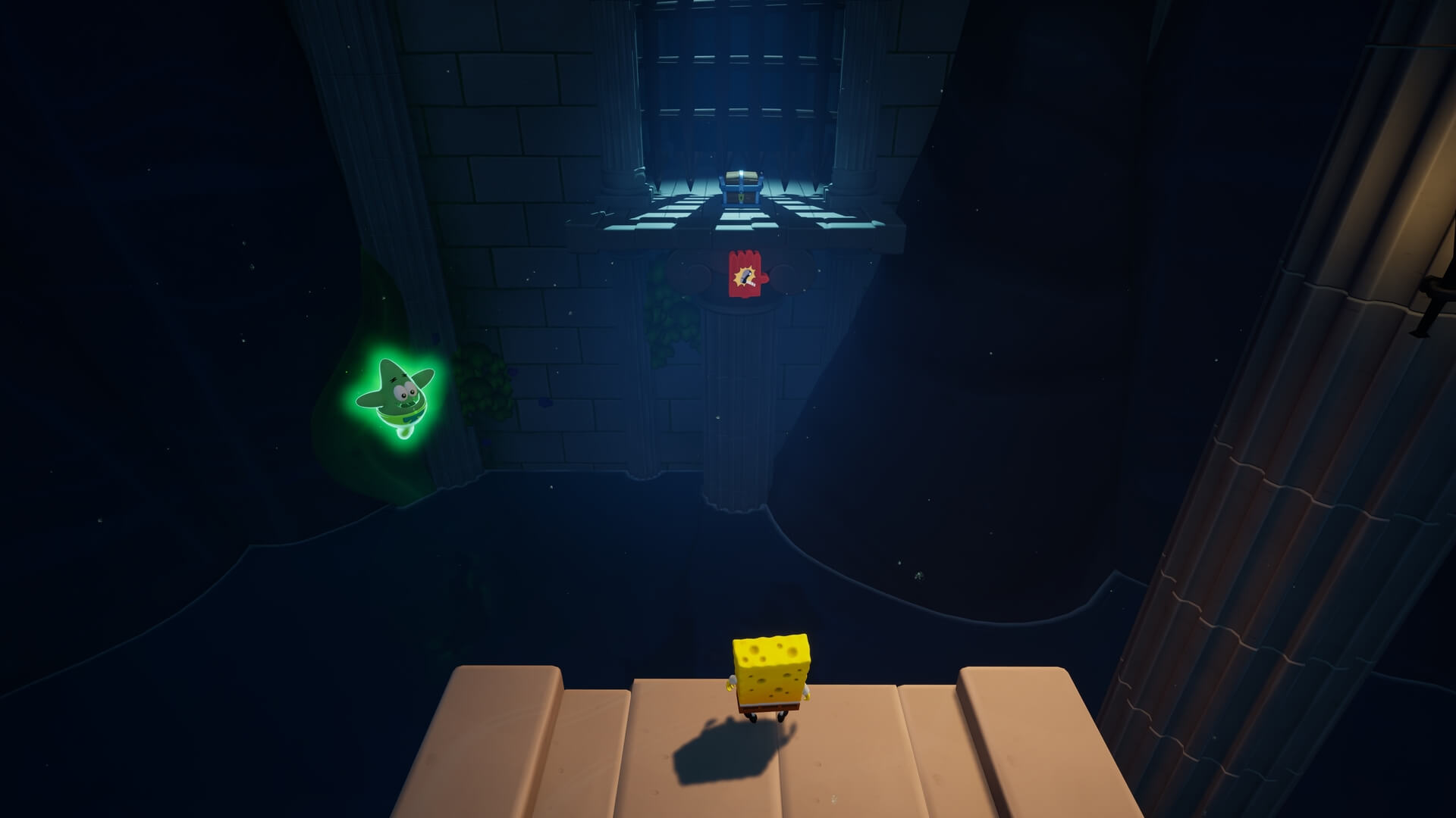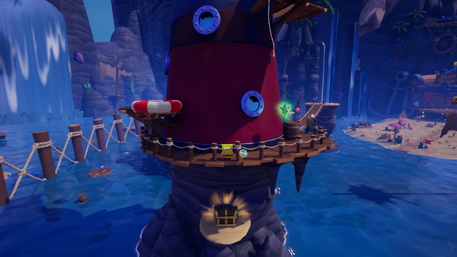 鉄格子がある場所まで登ったら「パトリック」で地面に潜り、鉄格子の奥にある「舵輪」を回そう!これで、さらに登るための足場が現れる。