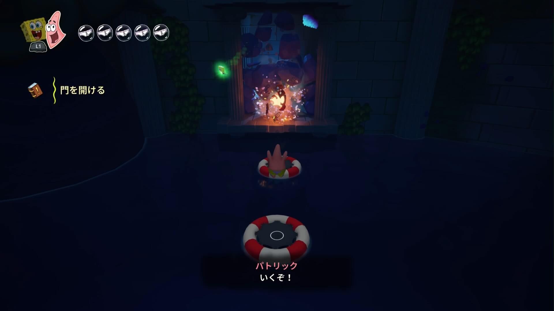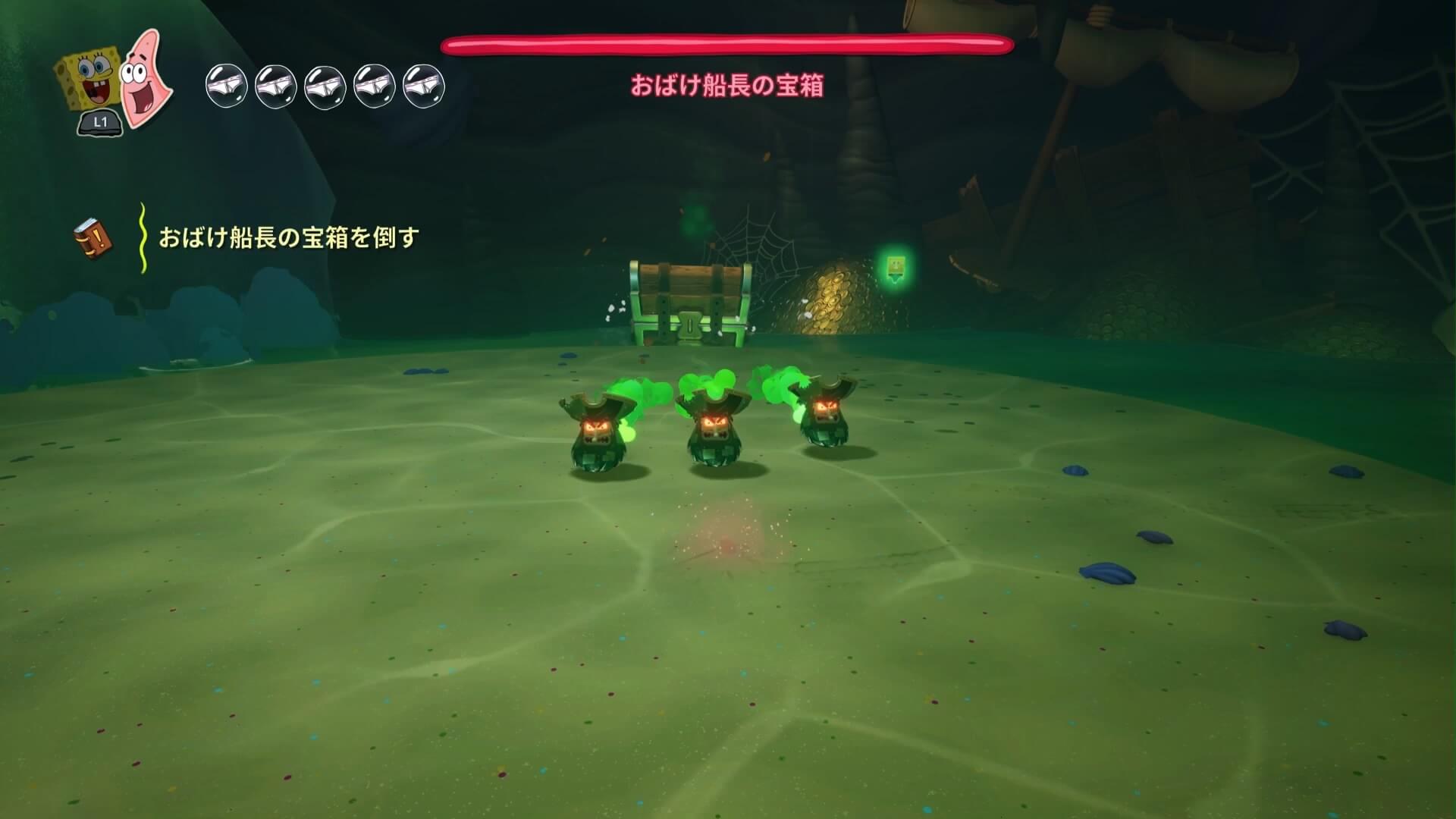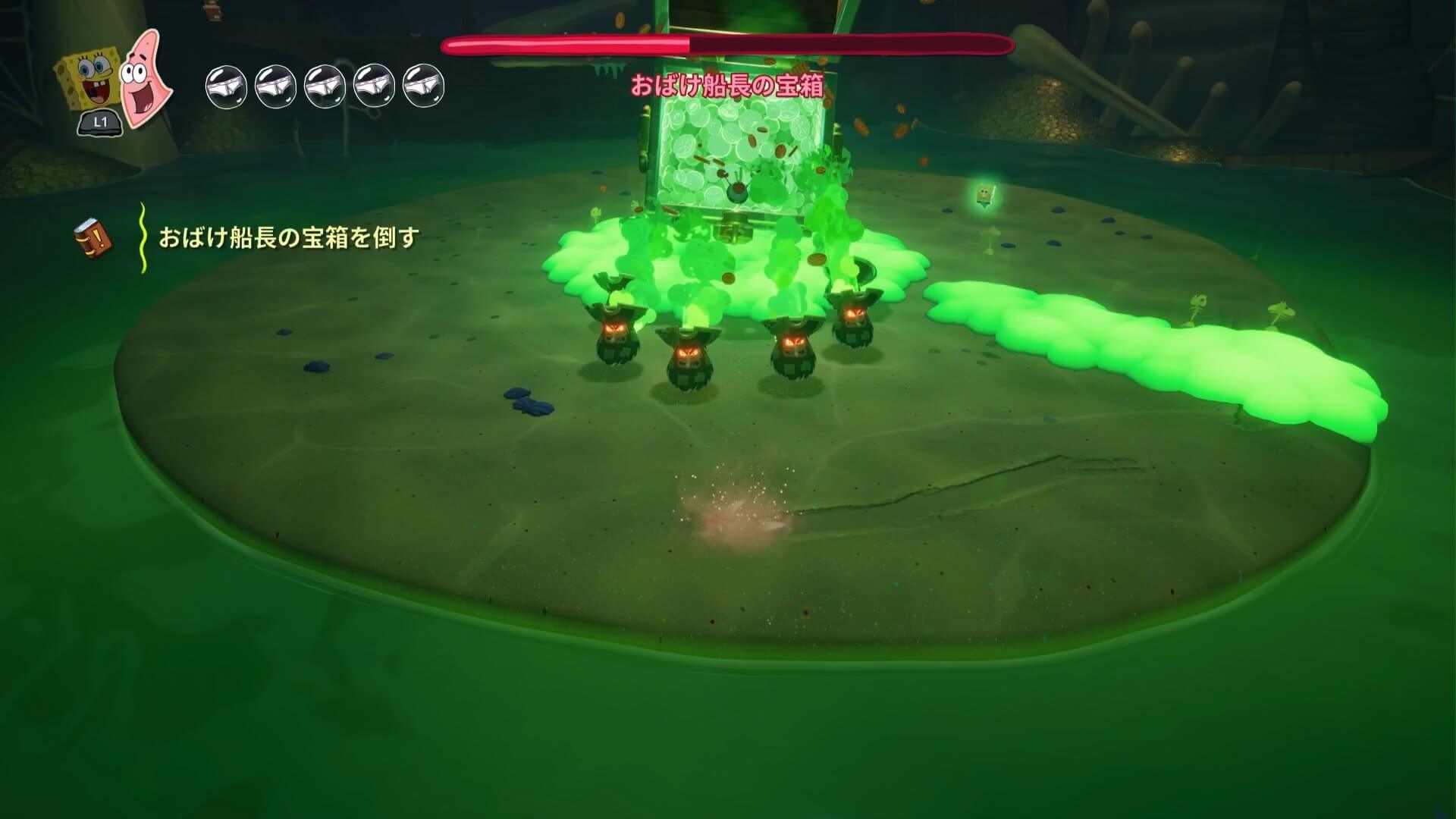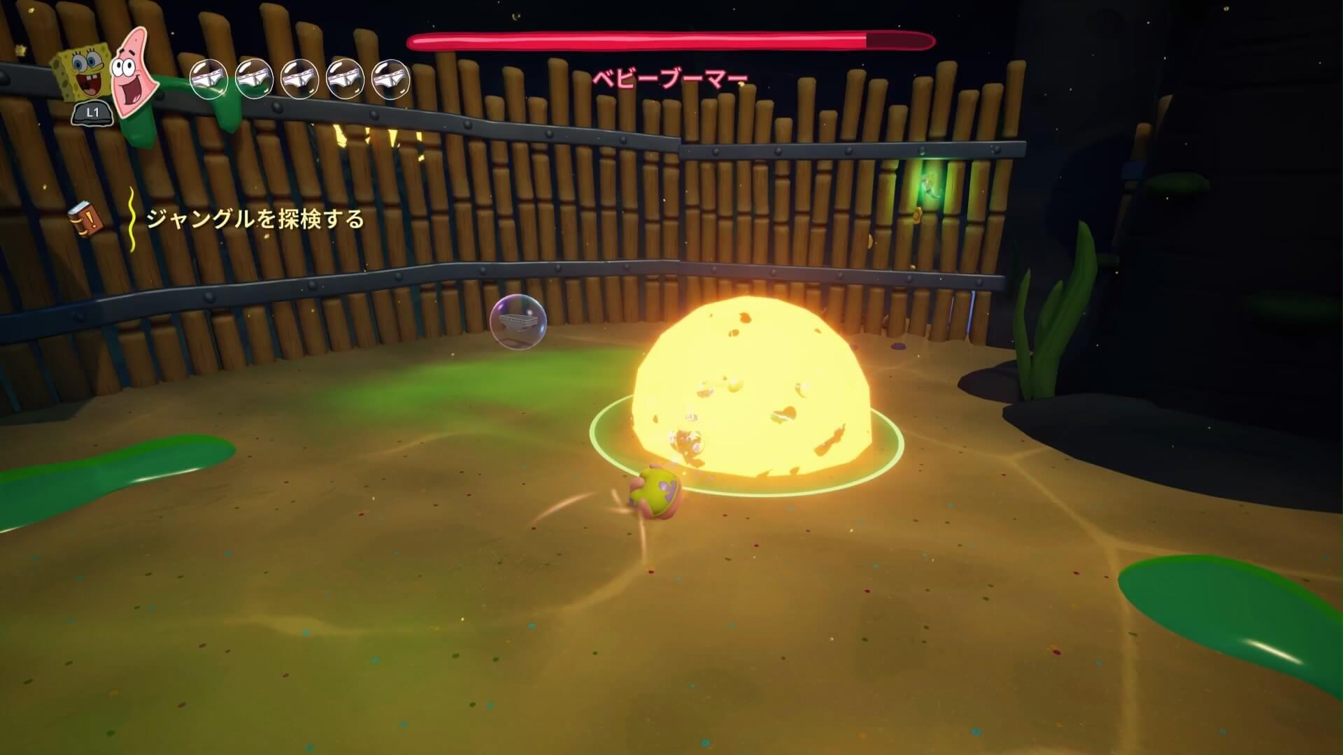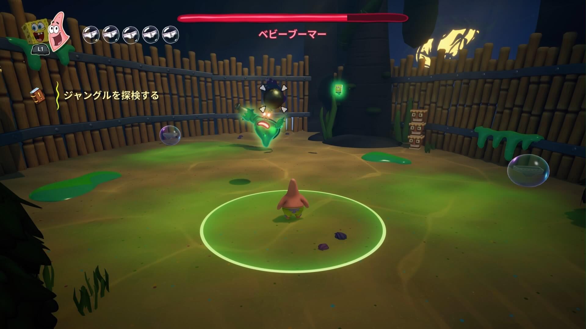 パトリックの専用技「掴むで砲弾をキャッチ」し、それを投げ返すことでダメージを与えます。周囲のティキ・おばけも投げ付けられ、慌てずに距離を取って戦えるのが利点で、砲弾キャッチも決して難しくない。