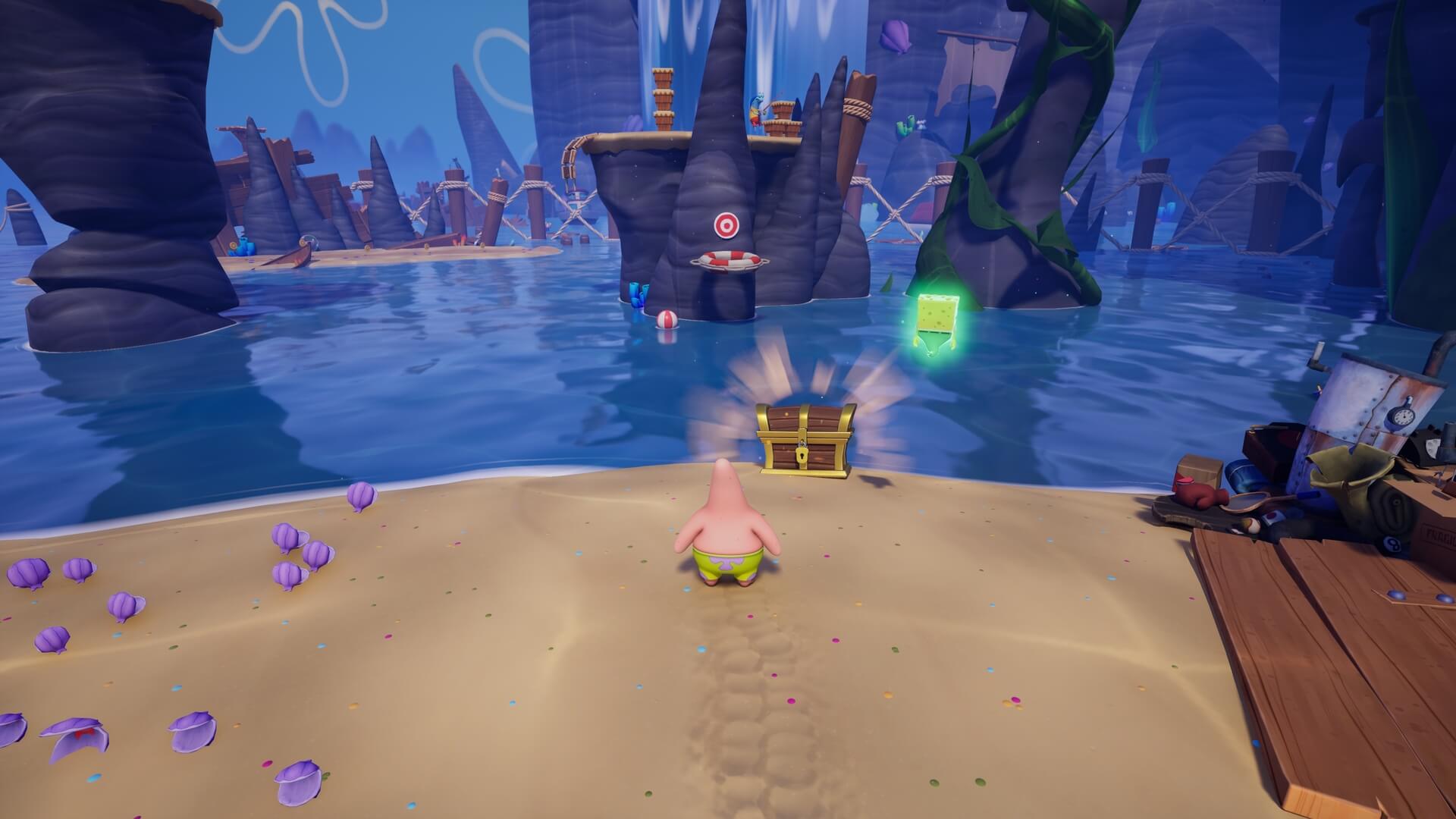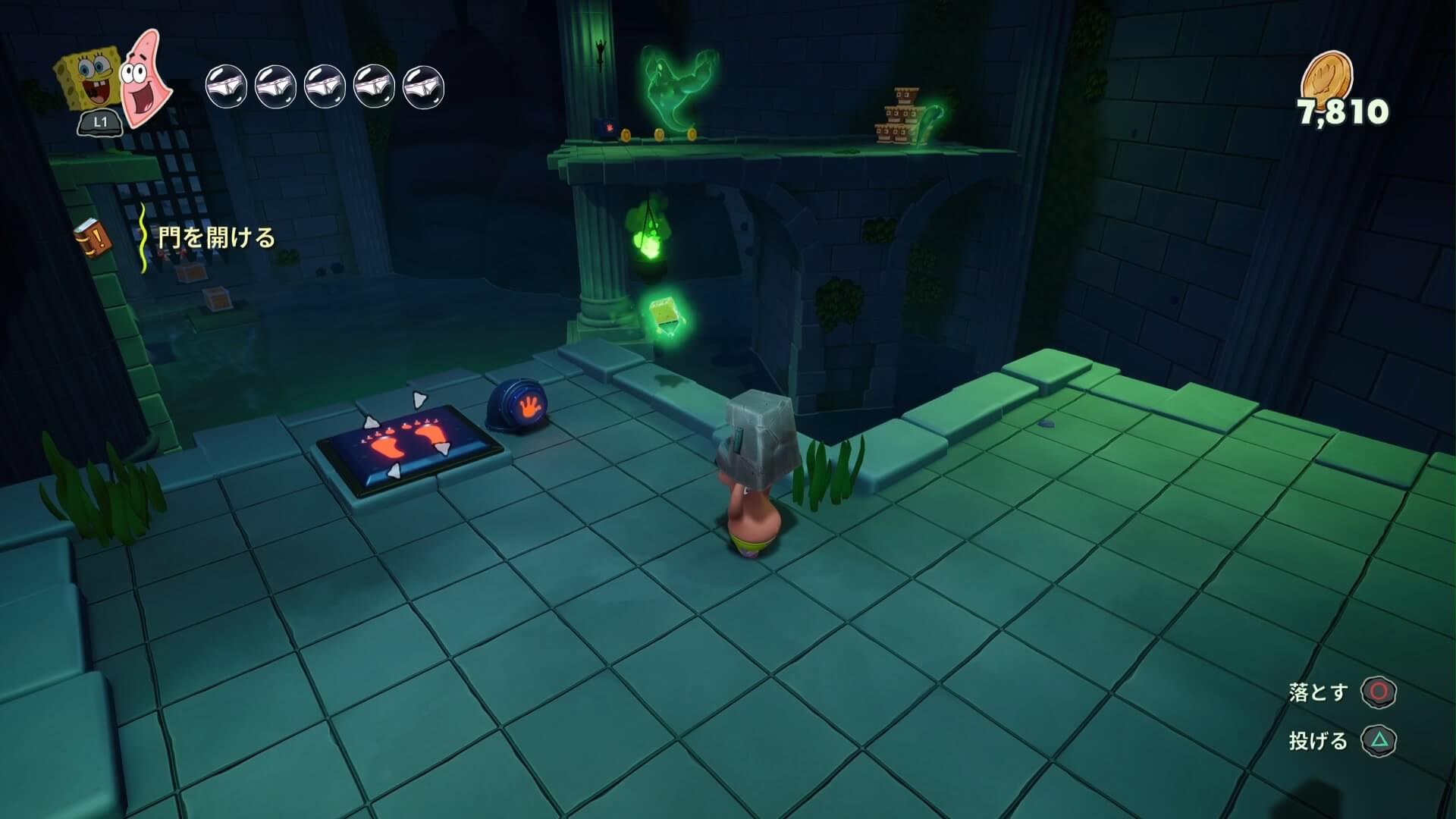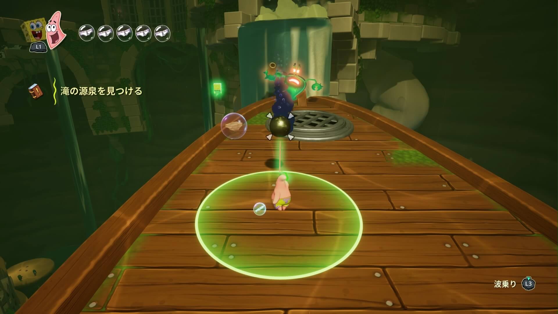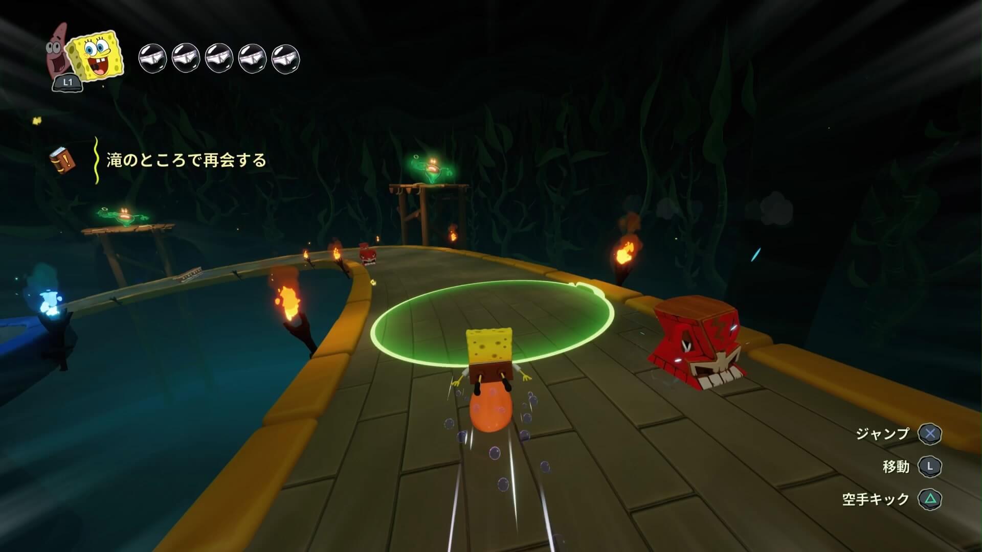 パトリックの専用技「掴むで砲弾をキャッチ」し、それを投げ返すことでダメージを与えます。周囲のティキ・おばけも投げ付けられ、慌てずに距離を取って戦えるのが利点で、砲弾キャッチも決して難しくない。