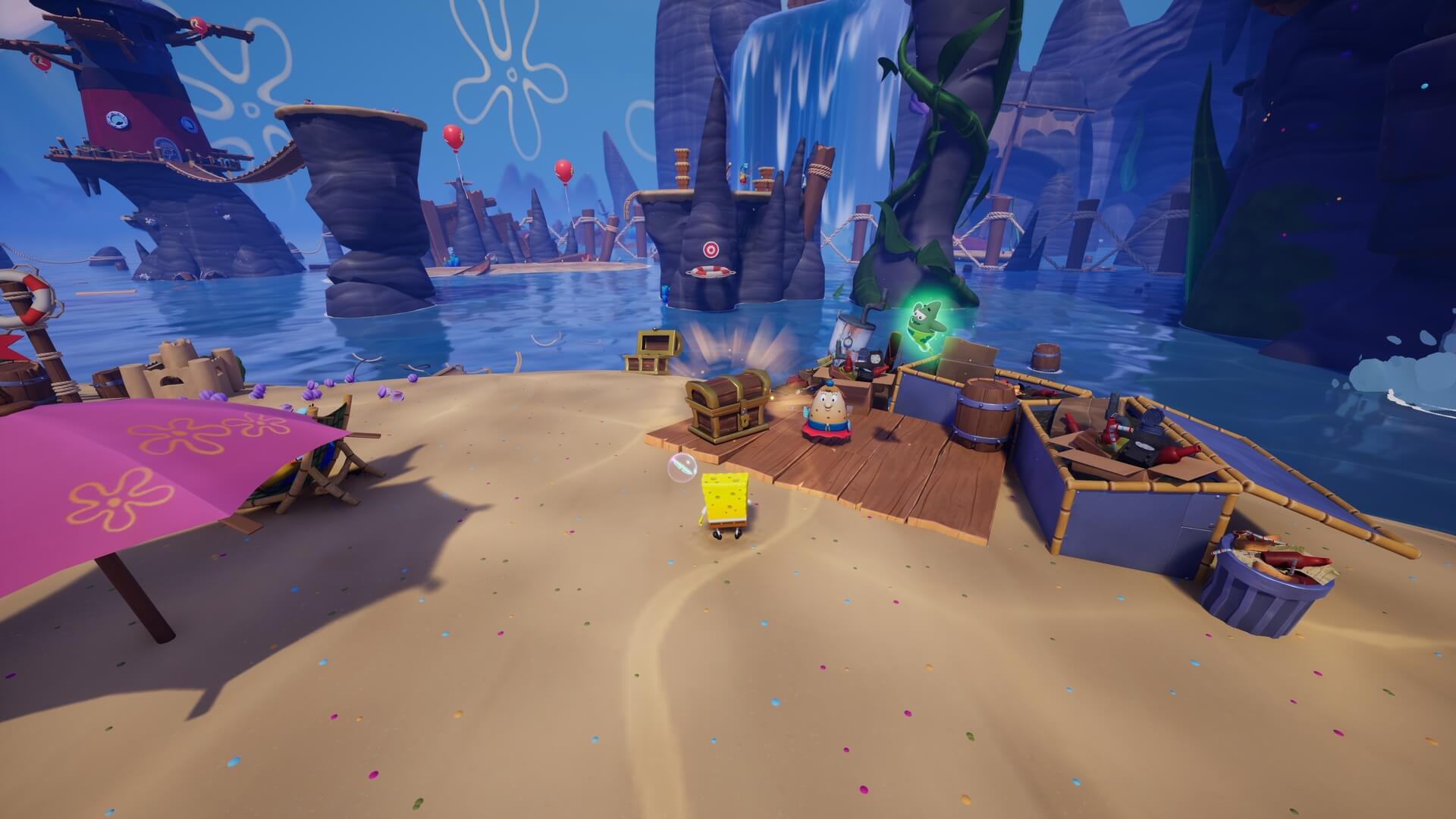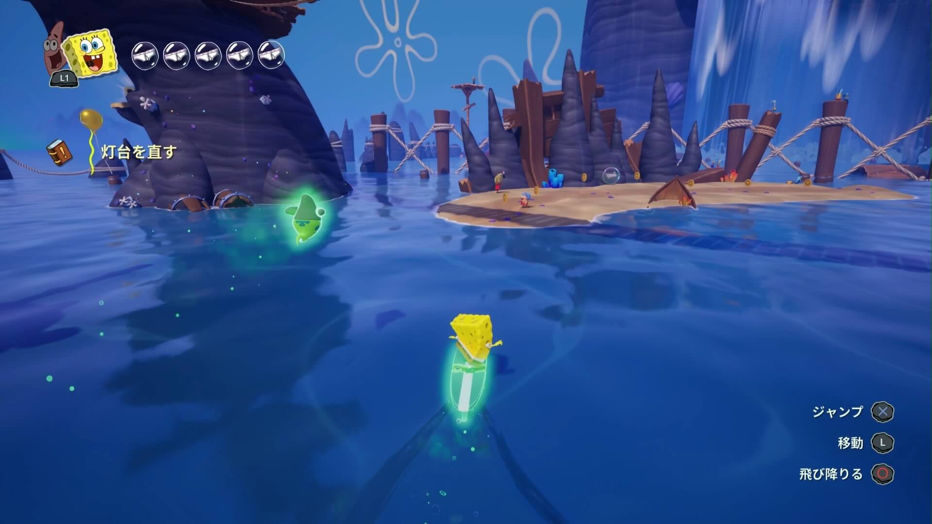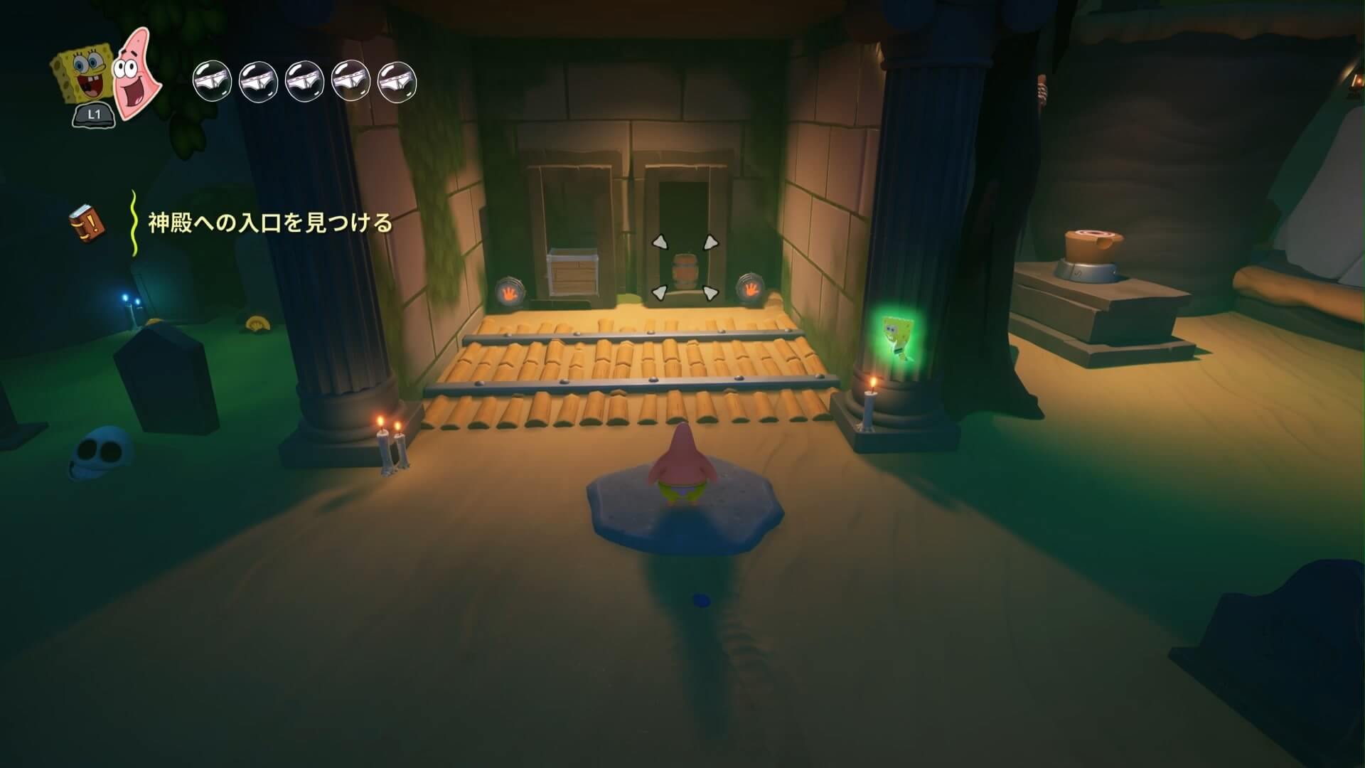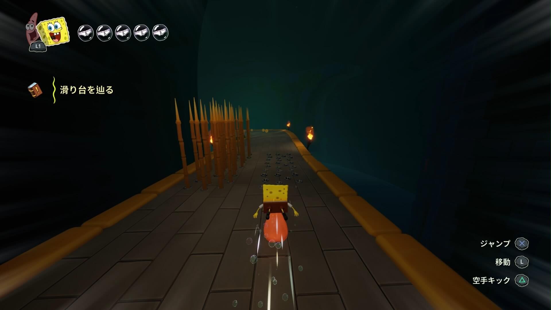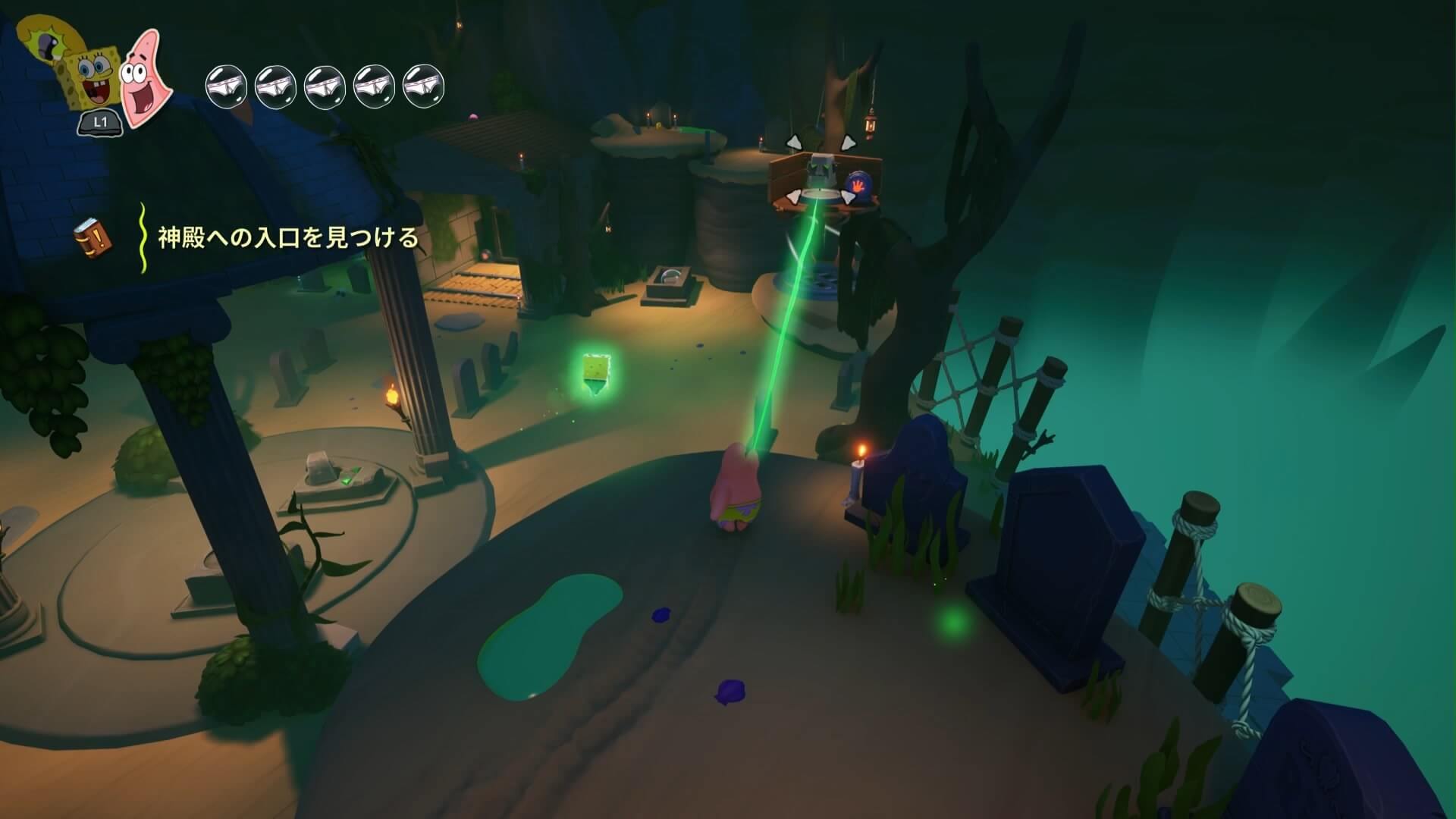 パトリックの専用技「掴むで砲弾をキャッチ」し、それを投げ返すことでダメージを与えます。周囲のティキ・おばけも投げ付けられ、慌てずに距離を取って戦えるのが利点で、砲弾キャッチも決して難しくない。