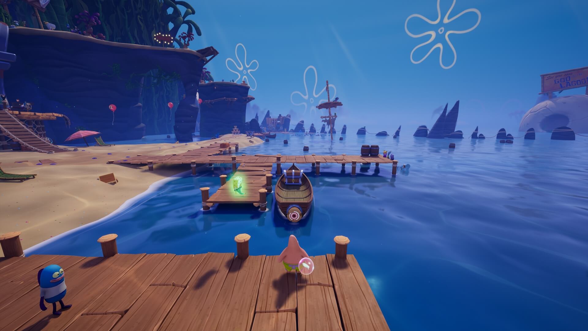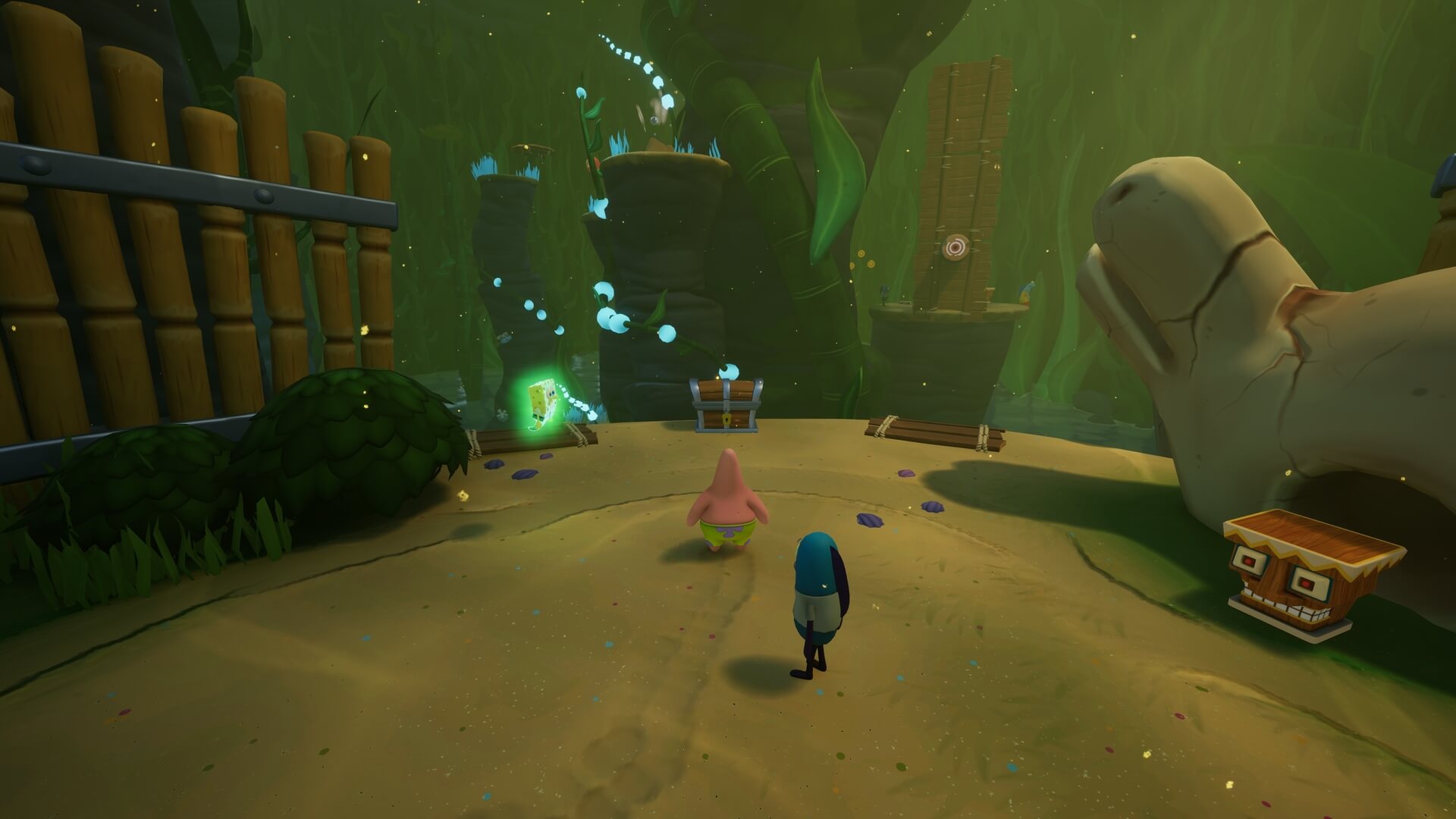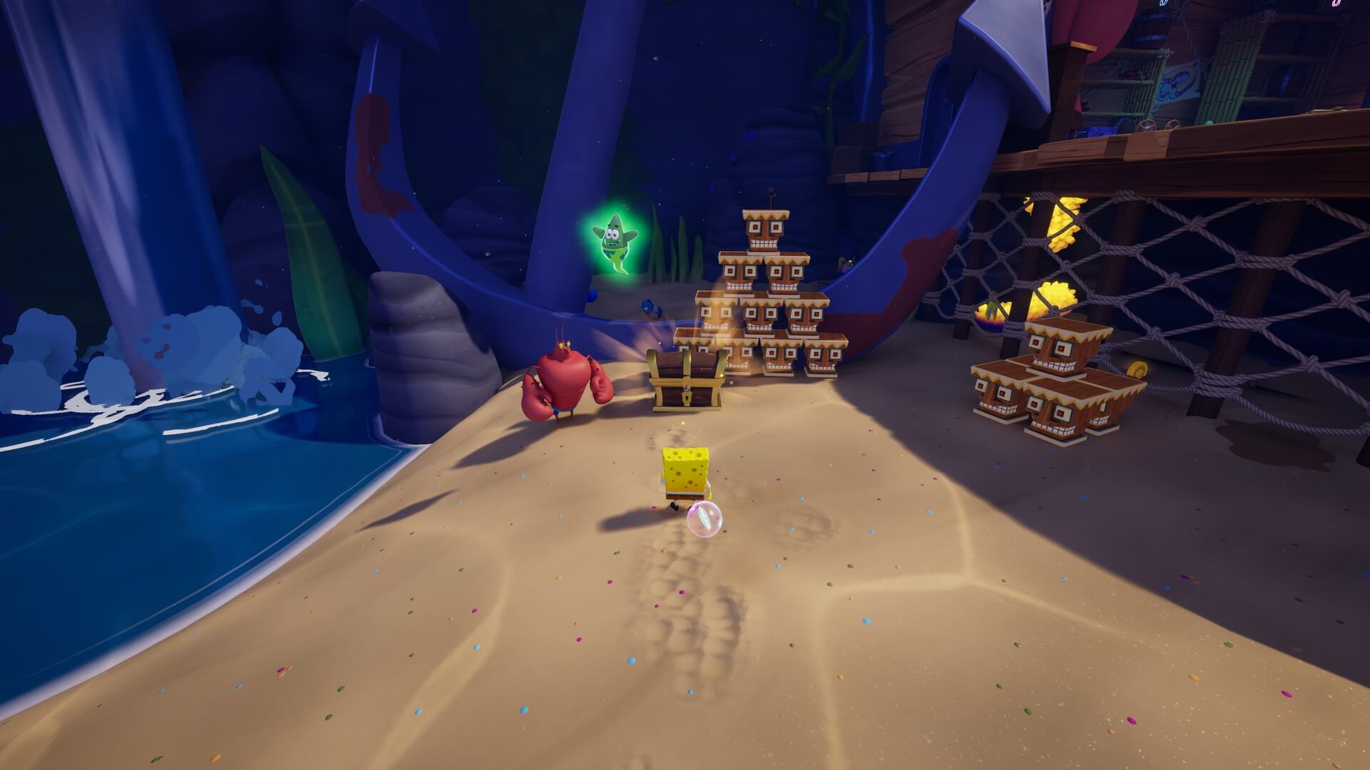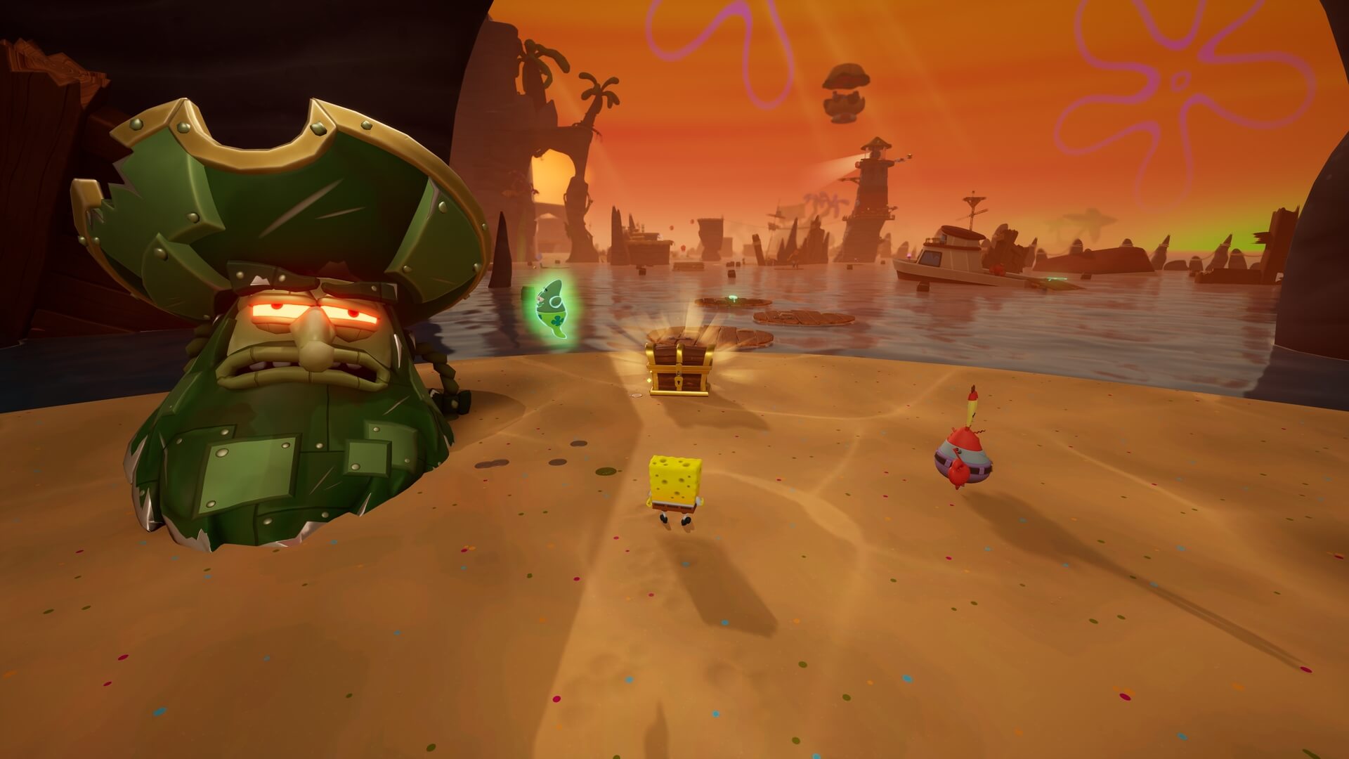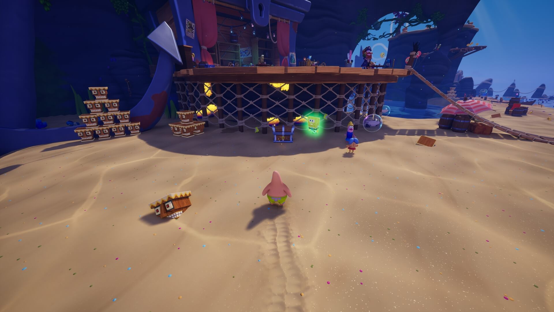 パトリックの専用技「掴むで砲弾をキャッチ」し、それを投げ返すことでダメージを与えます。周囲のティキ・おばけも投げ付けられ、慌てずに距離を取って戦えるのが利点で、砲弾キャッチも決して難しくない。