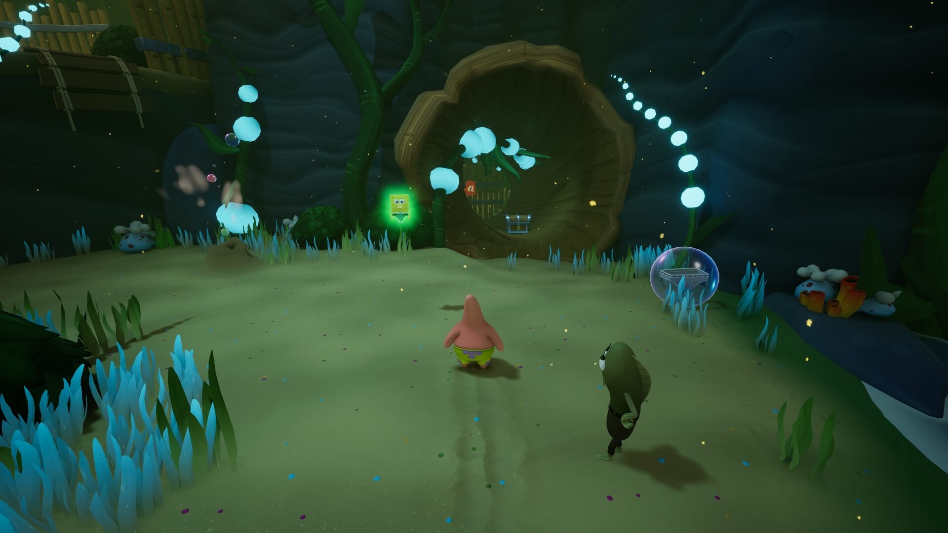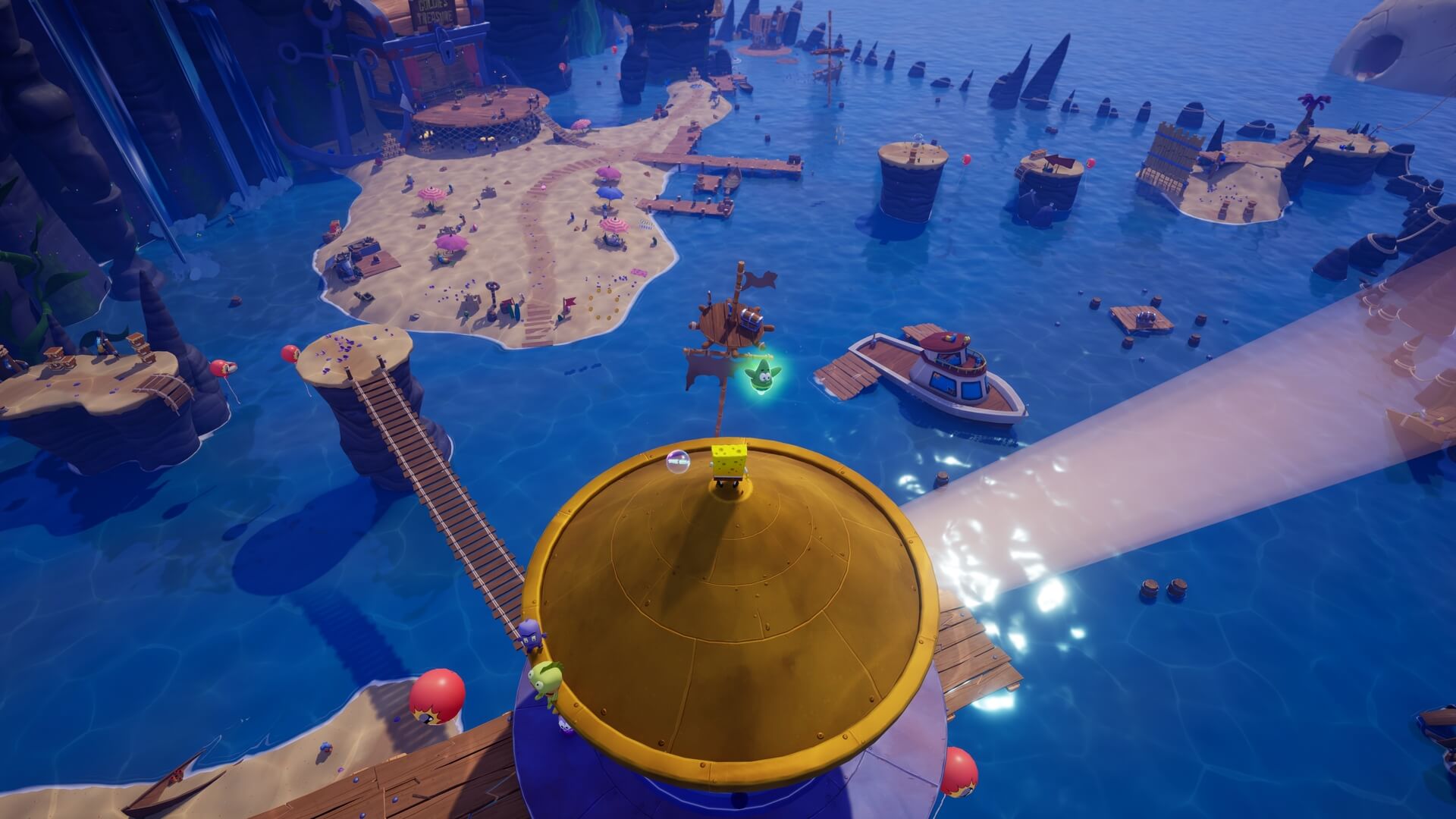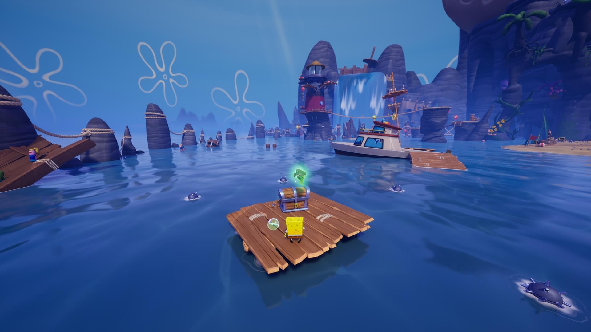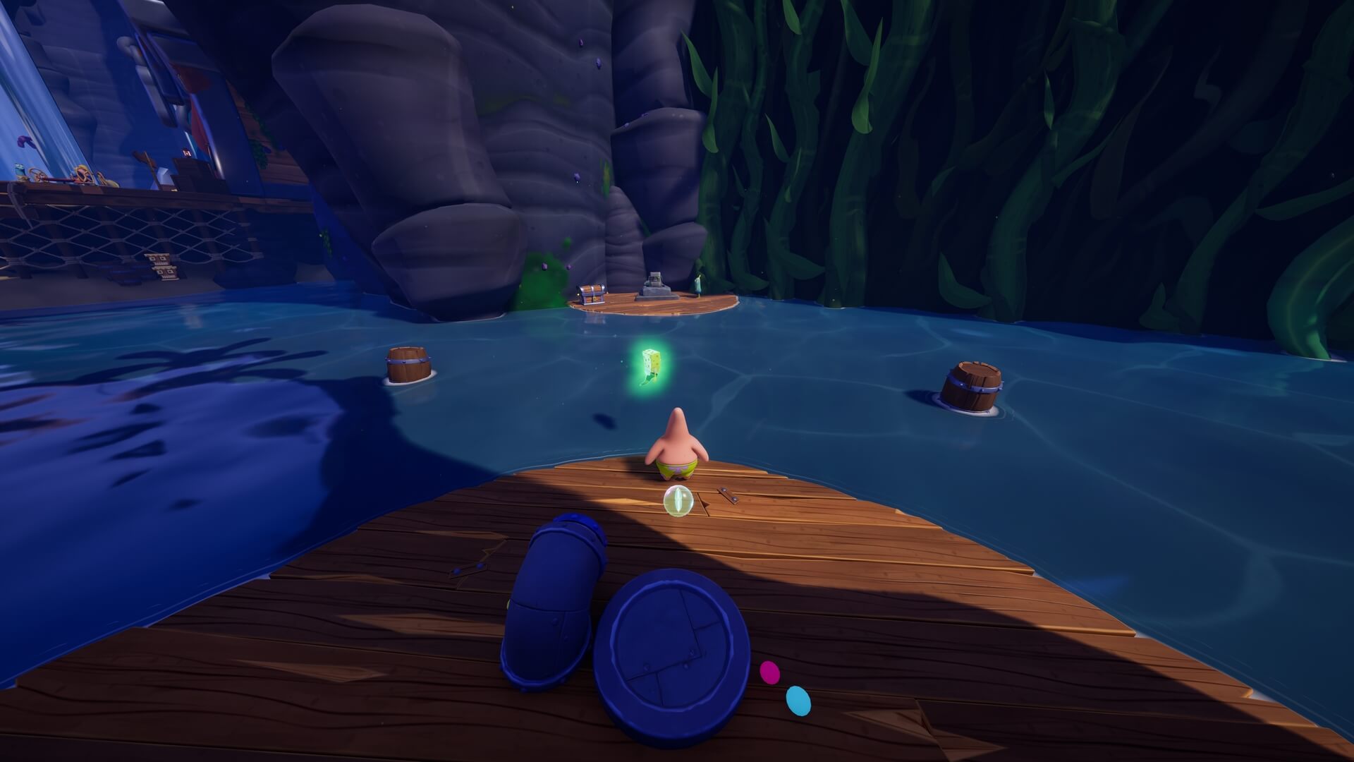 パトリックの専用技「掴むで砲弾をキャッチ」し、それを投げ返すことでダメージを与えます。周囲のティキ・おばけも投げ付けられ、慌てずに距離を取って戦えるのが利点で、砲弾キャッチも決して難しくない。