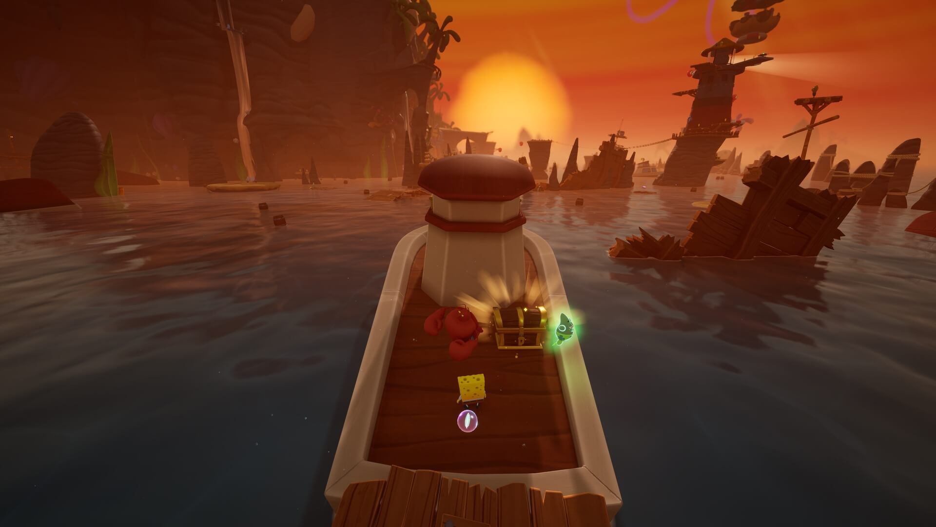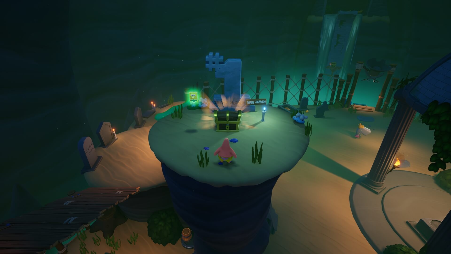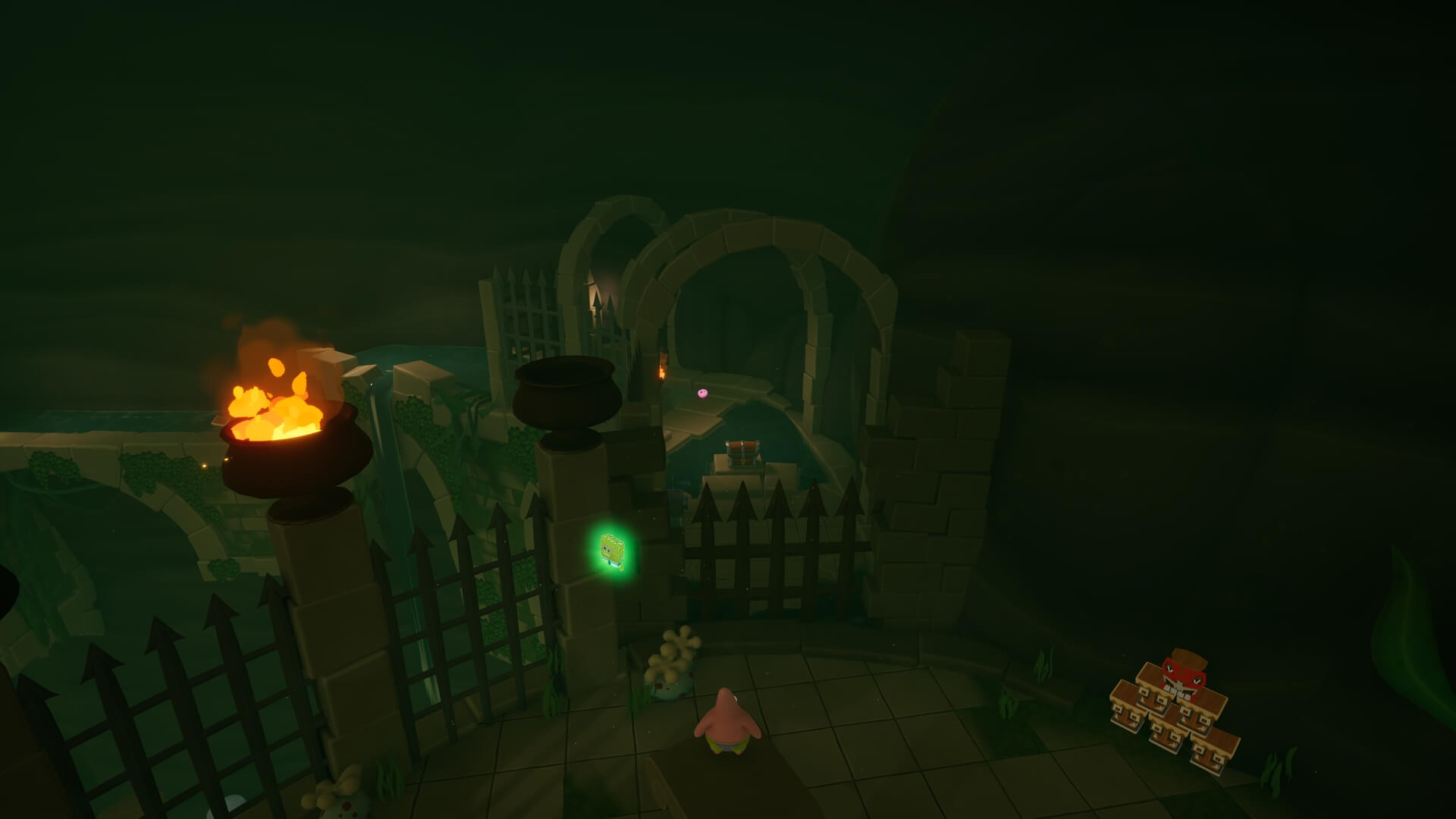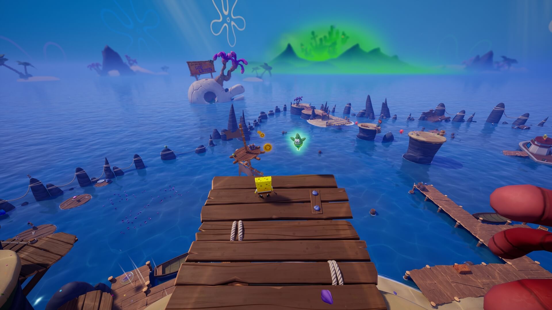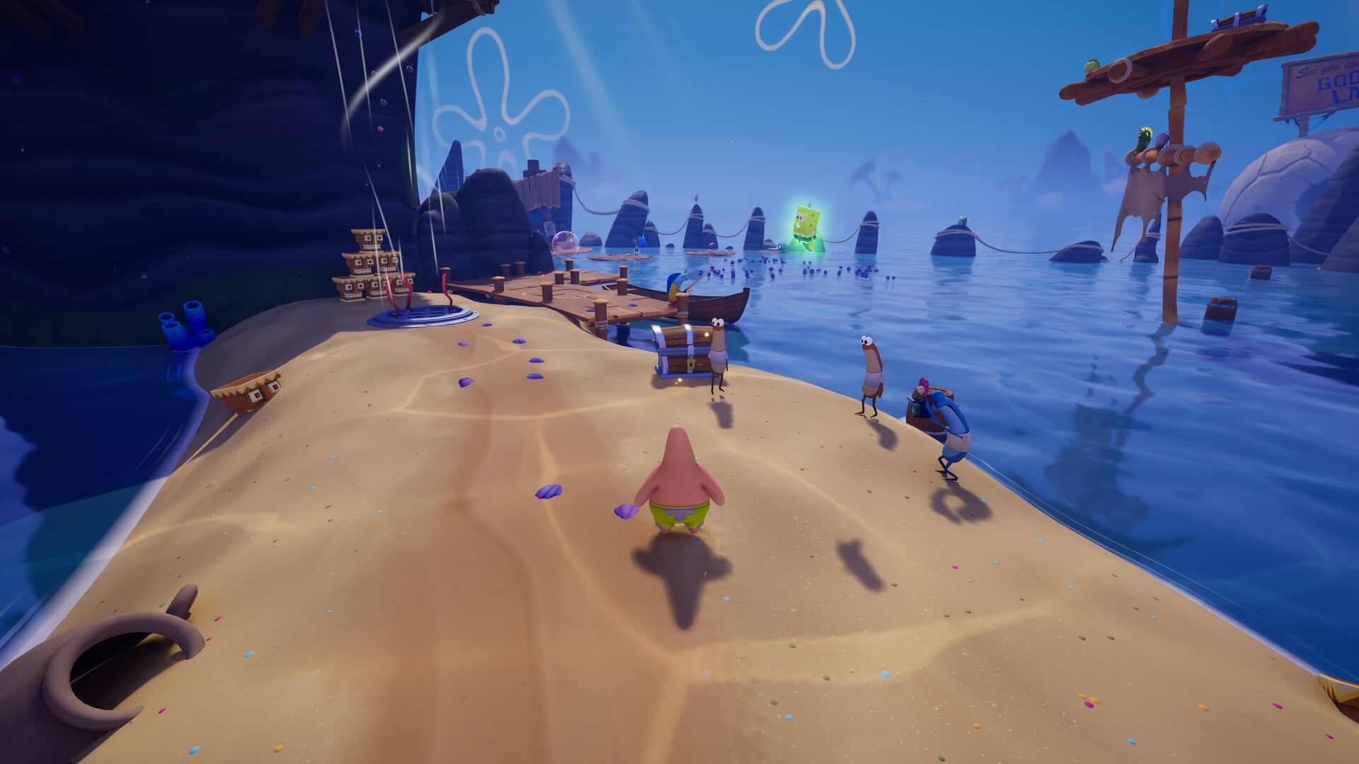 パトリックの専用技「掴むで砲弾をキャッチ」し、それを投げ返すことでダメージを与えます。周囲のティキ・おばけも投げ付けられ、慌てずに距離を取って戦えるのが利点で、砲弾キャッチも決して難しくない。