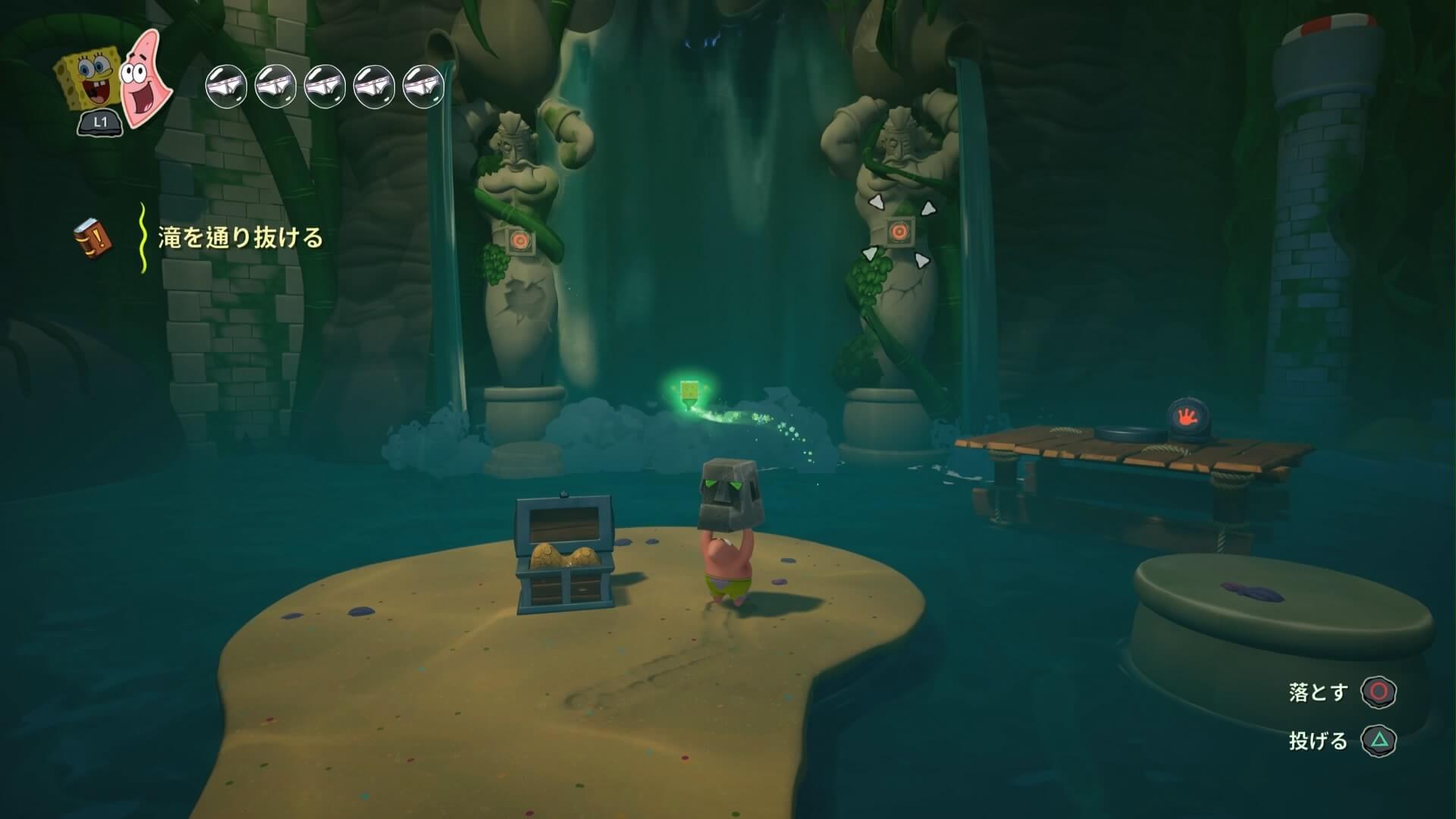滝の両側の石像に「スイッチ」があり、これに「ストーンティキ」をぶつけると、滝を登るための「石が噴き上げられる」仕掛け。使ったティキは「海に落ちた後に再生する」ので、使い回して順番にぶつけよう!