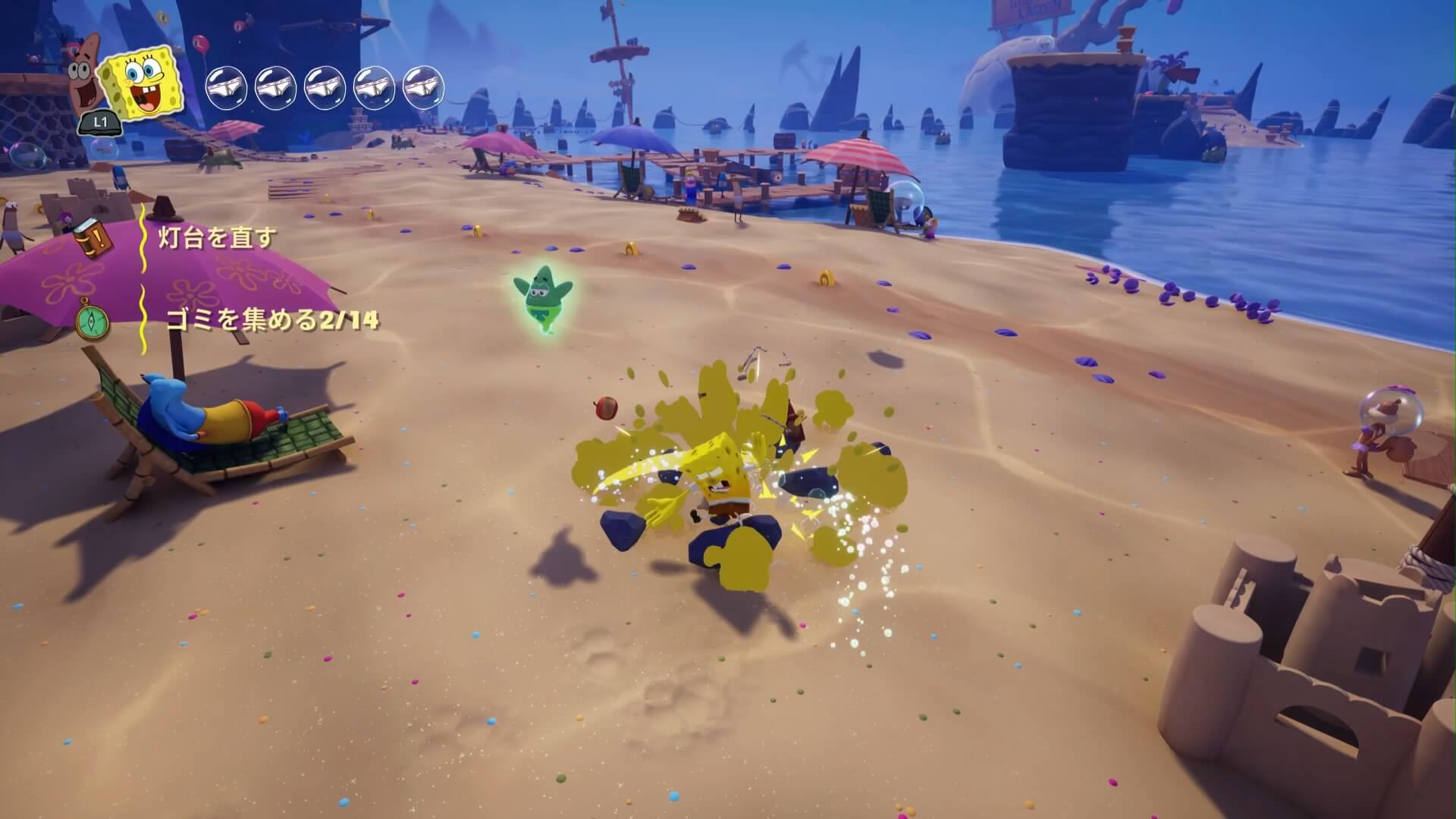 ビーチのゴミは7ヶ所。集める=攻撃して壊すでOK。