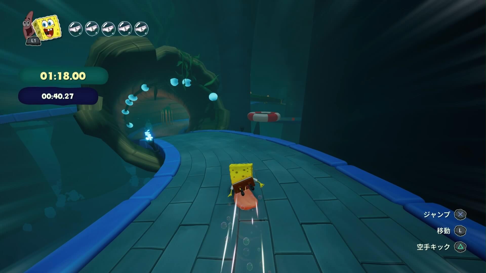 2カ所目のトゲの後、カーブ中に見える「浮き輪パッドから青い通路」に乗るのが最初のショートカット。(連続の始まり)