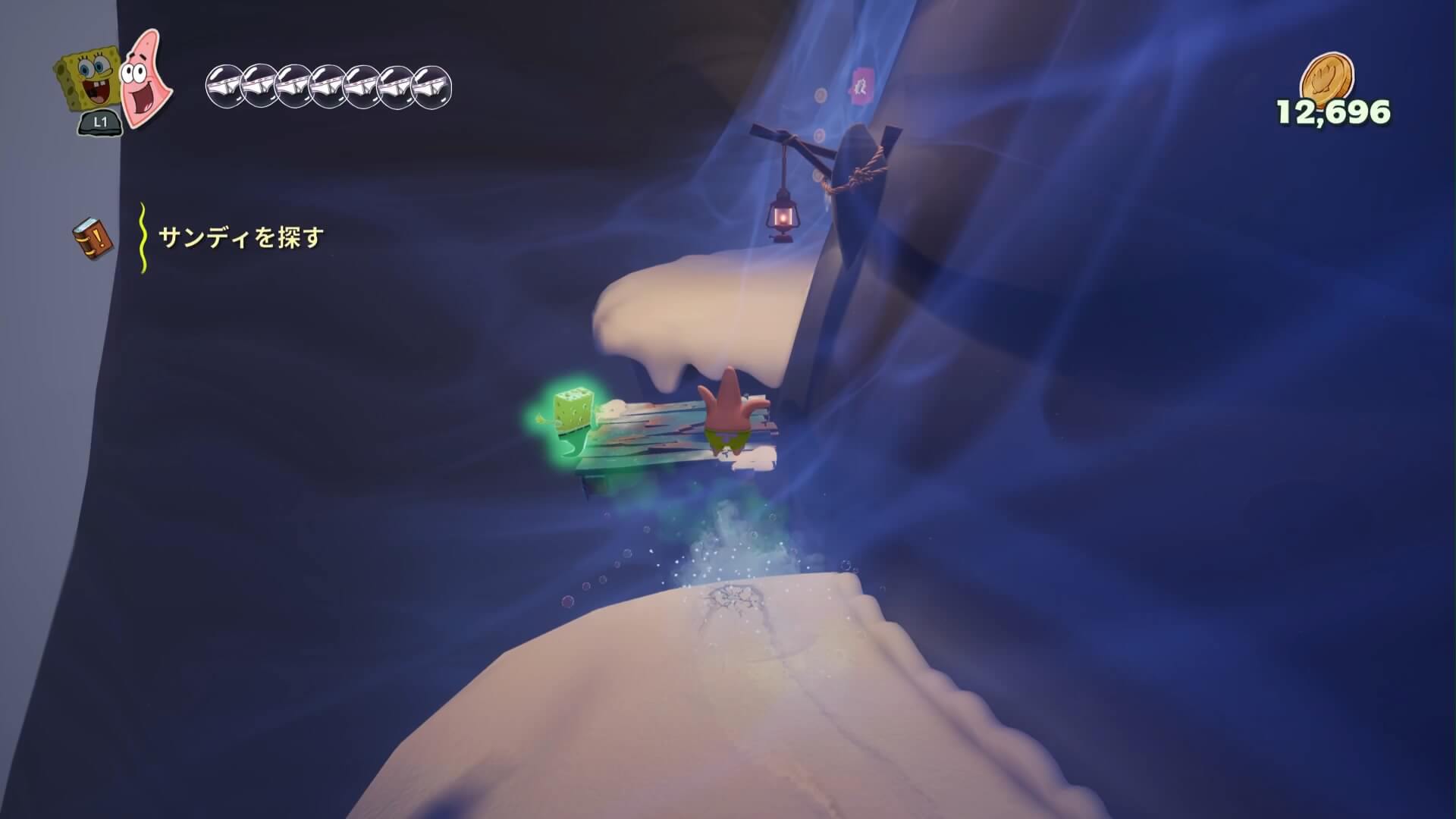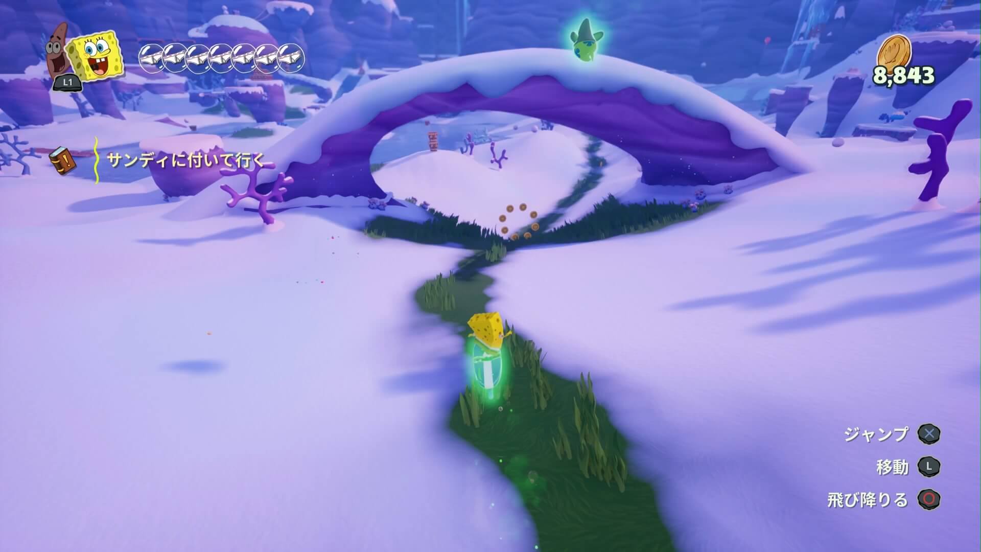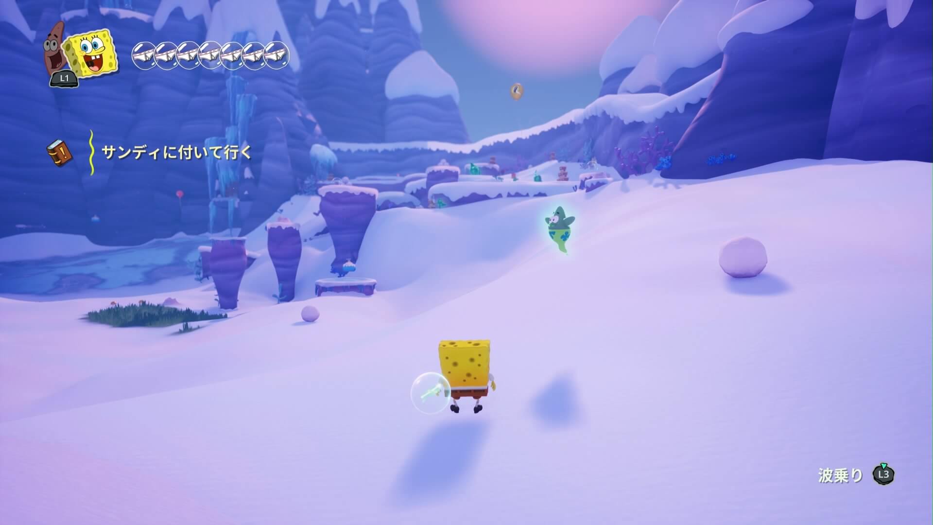 広い雪原を探索したくなるが、サンディに追い付いた後に発生する「ジャム集め」と同時に行うのが効率的。まずは下ってしまって問題ない。