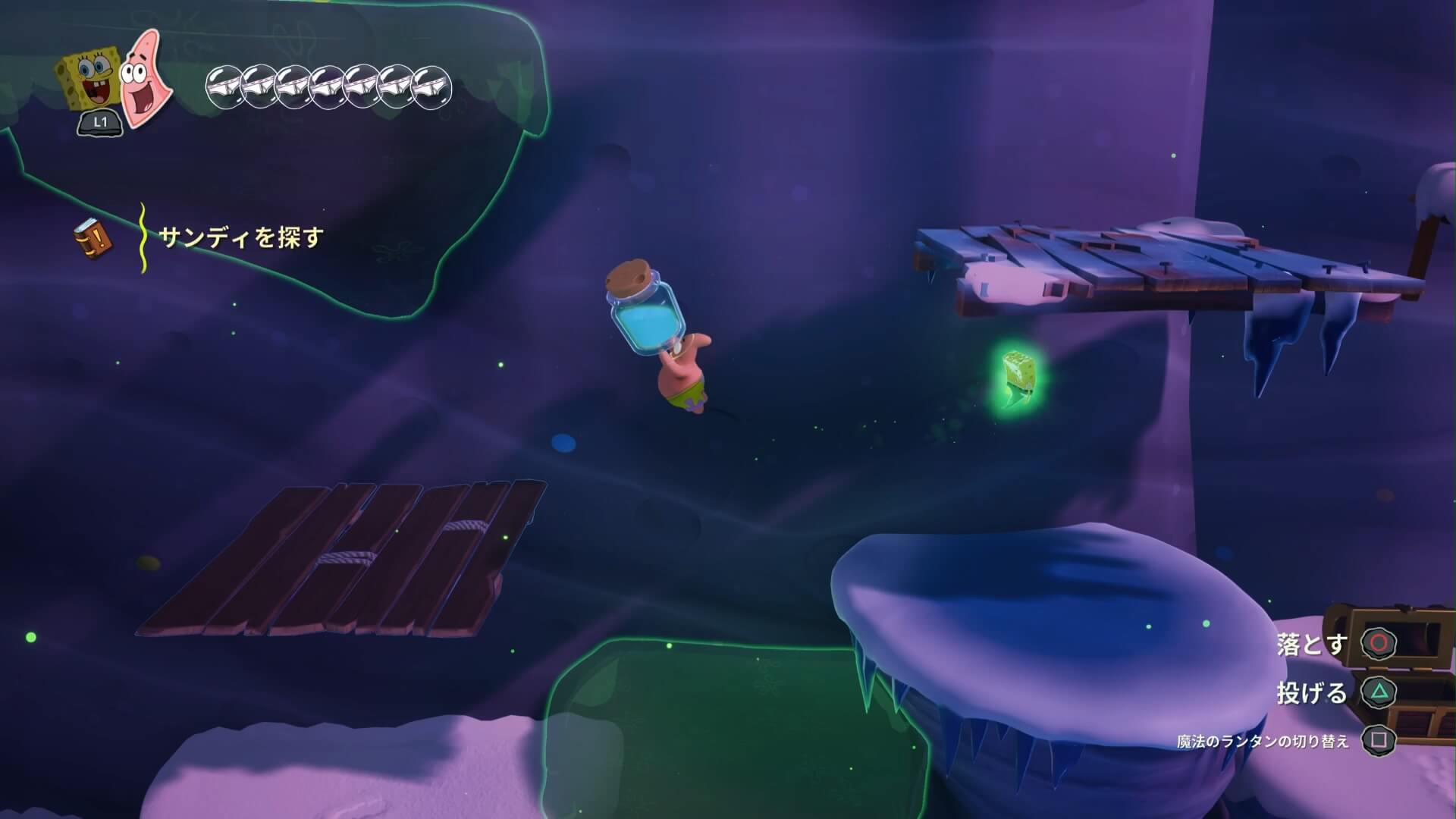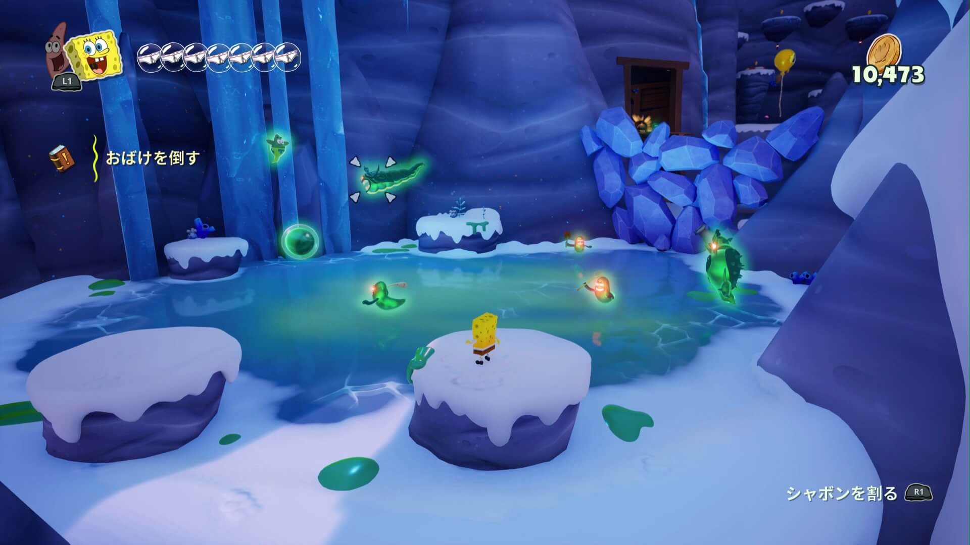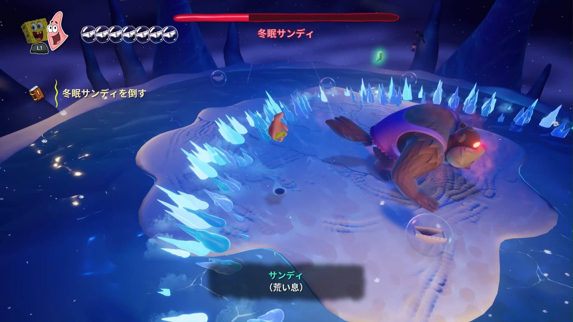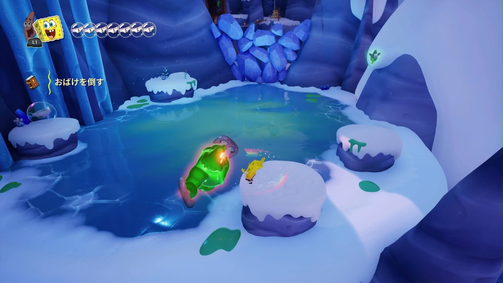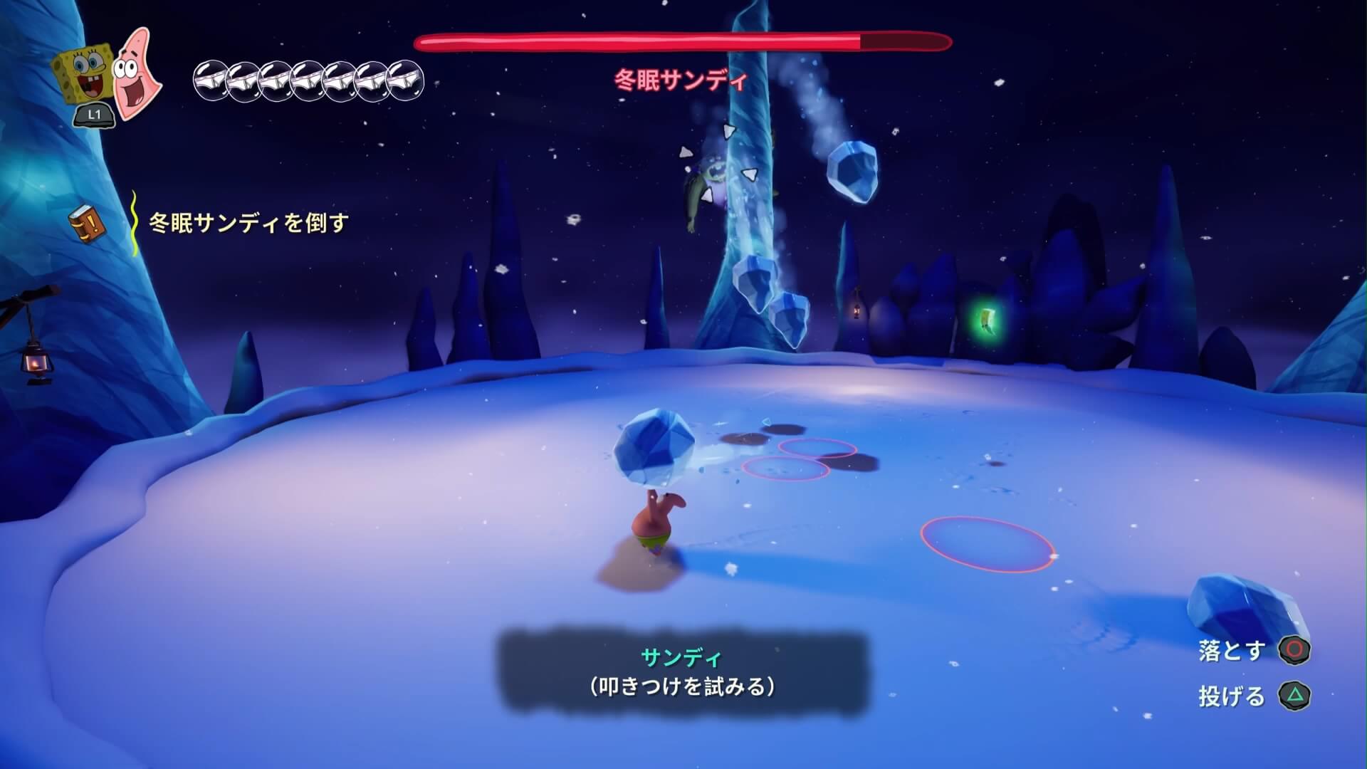 第2段階は「氷柱から氷塊」を投げ付ける攻撃。パトリックに交代して氷塊を一つ掴み、これを投げ返して気絶させます。投げてくる氷塊と相殺されないように、攻撃の手が止むのを待ち、落ち着いて投げ返そう!