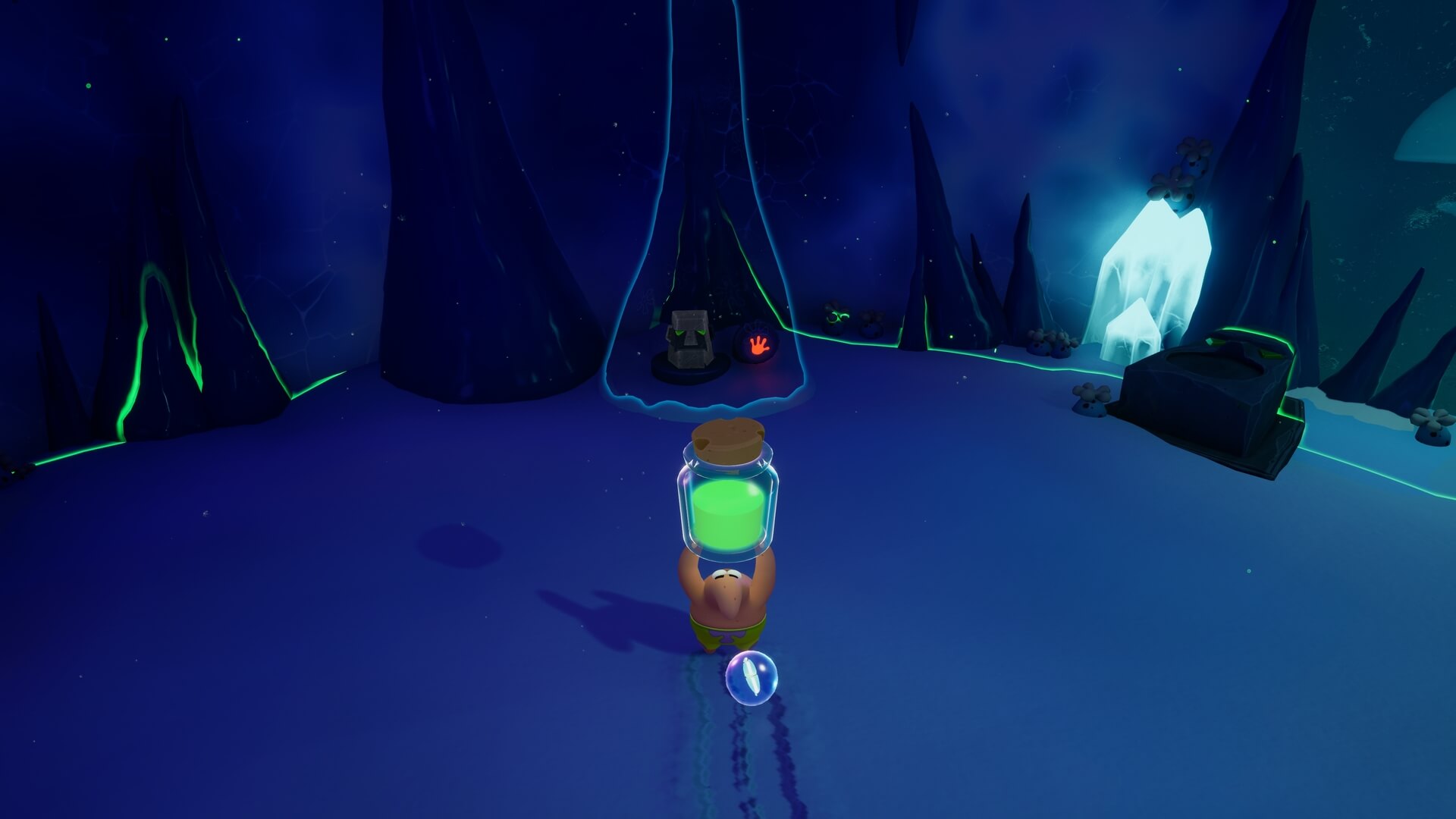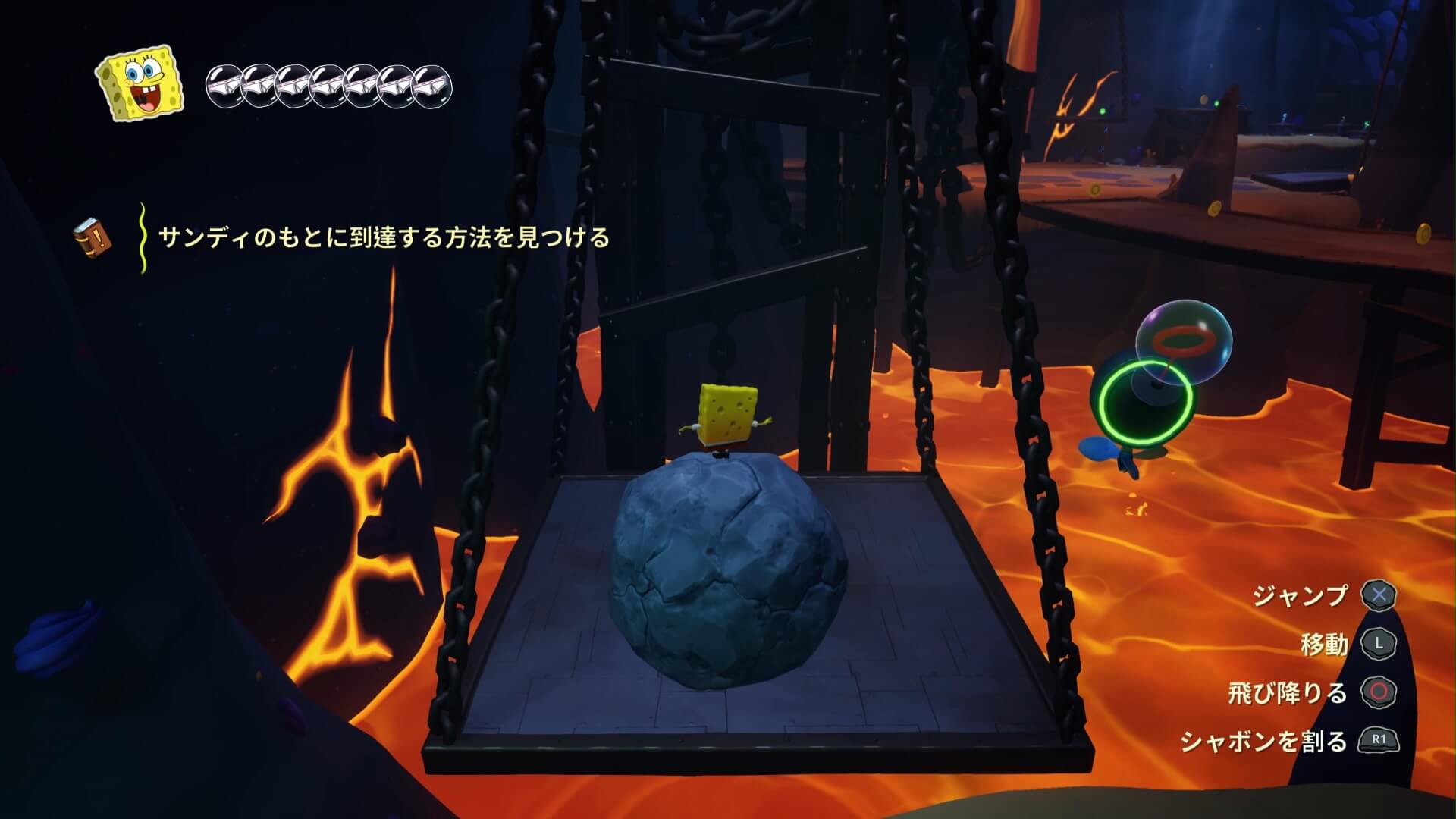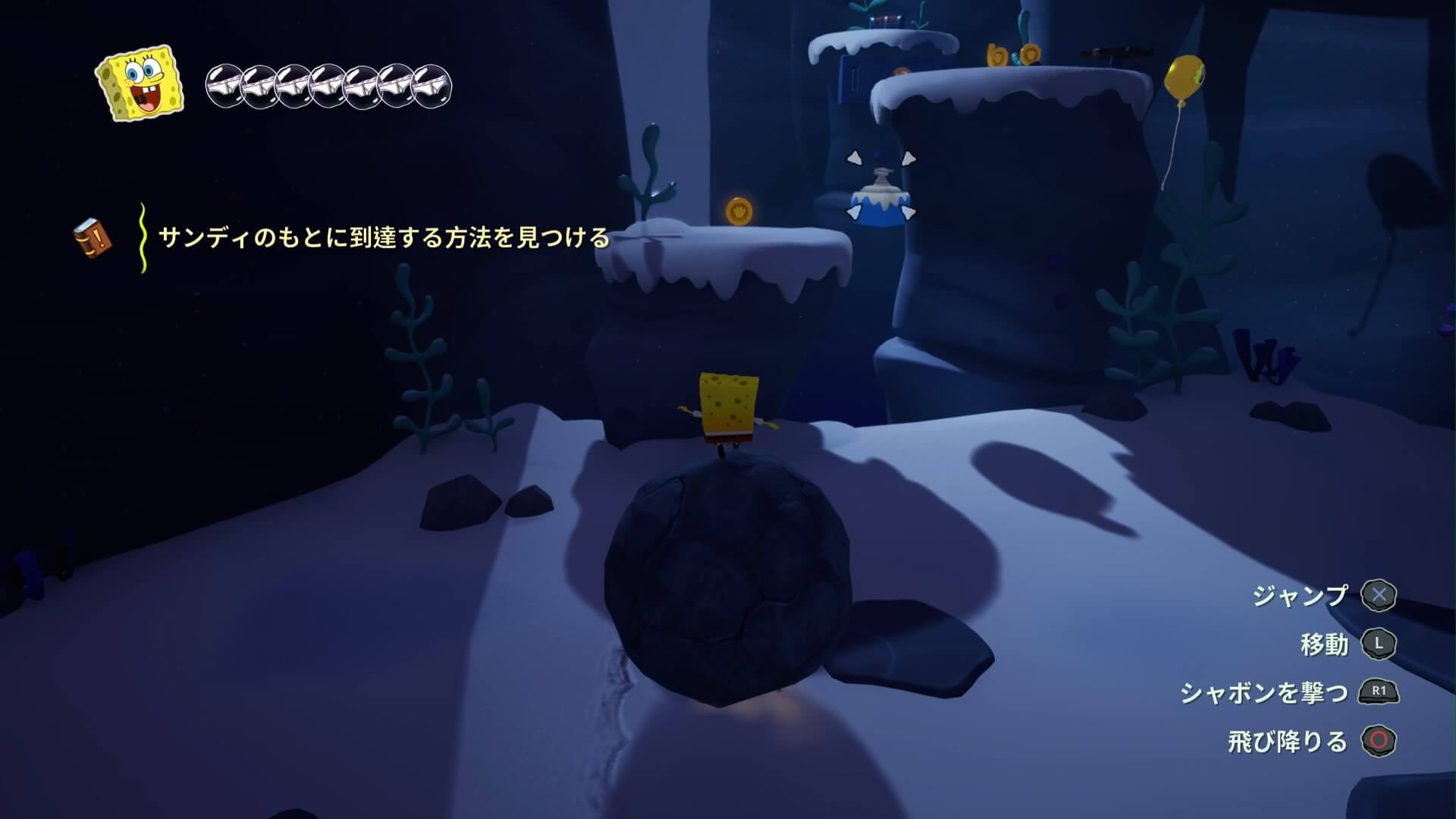 おばけ軍団を倒した後、岩の上から「シャボン」で足場を作り、岩に乗ったまま上へ。加速して重りを壊せば「青の電球」を点灯させられる。