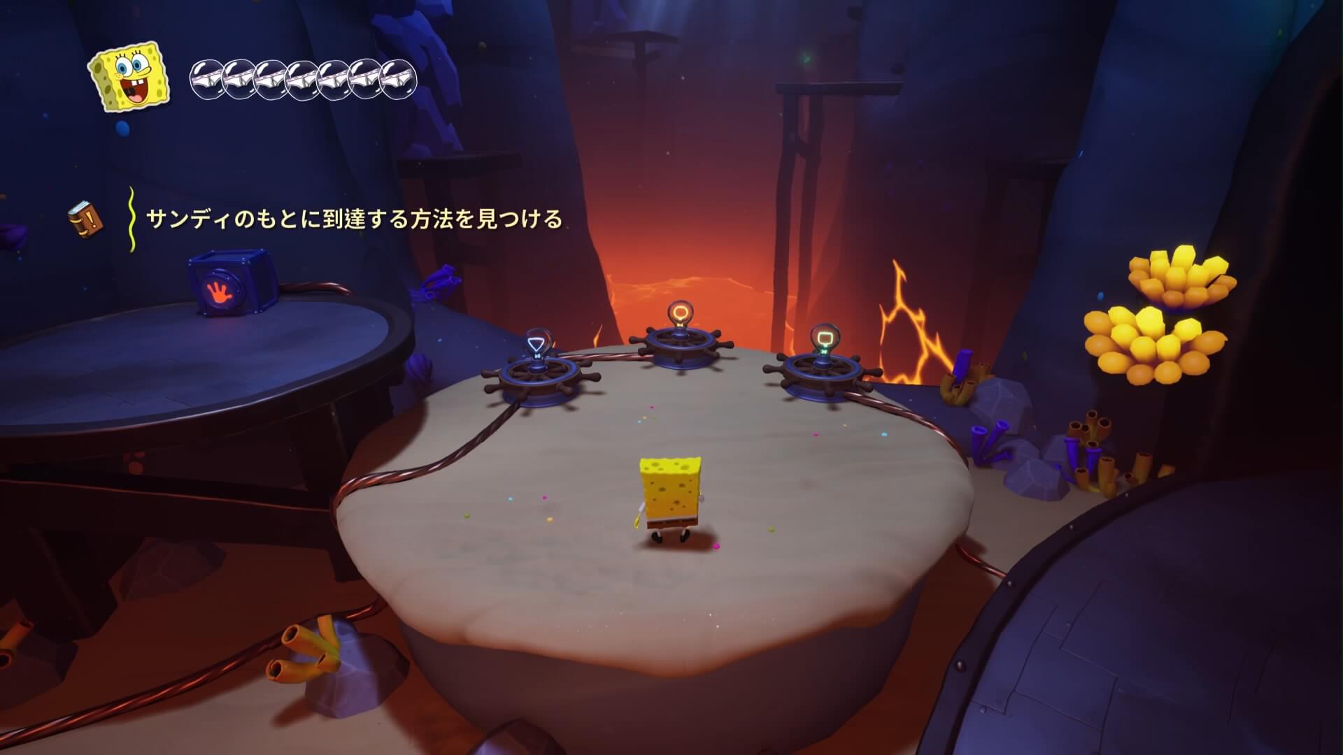 火口には「緑・青・黄」の電球があり、銅線の先のスイッチで全て点灯させると、先へ進むための門が開く。まずは「黄色」を点灯させよう!