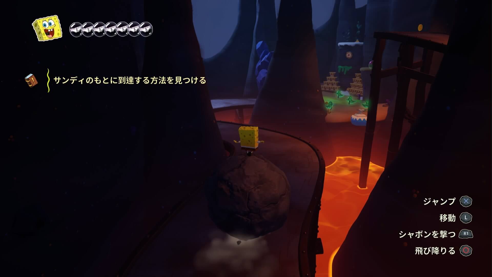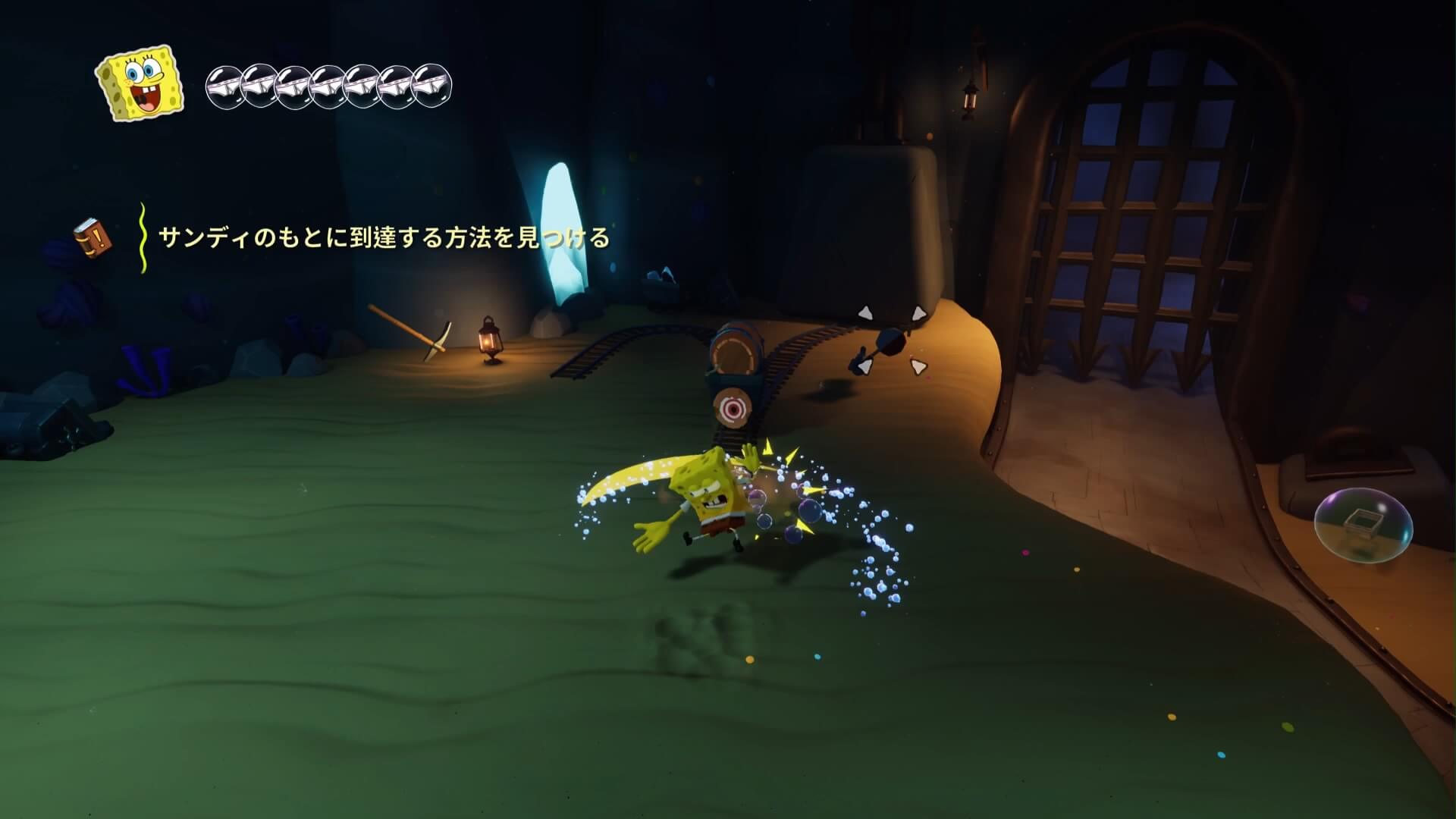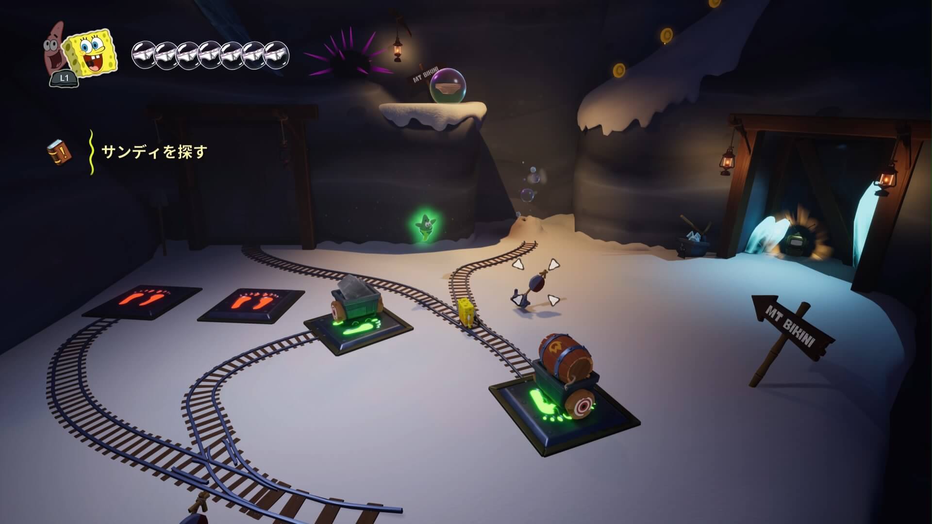 道なりに進むと「トロッコ」を使った簡単なパズル。トロッコを叩いて中央に移動させ、線路を右に切り替えた後、トロッコを進めて岩を爆破させればOK。(パトリック用の「引っ張る用のターゲット」は無視)