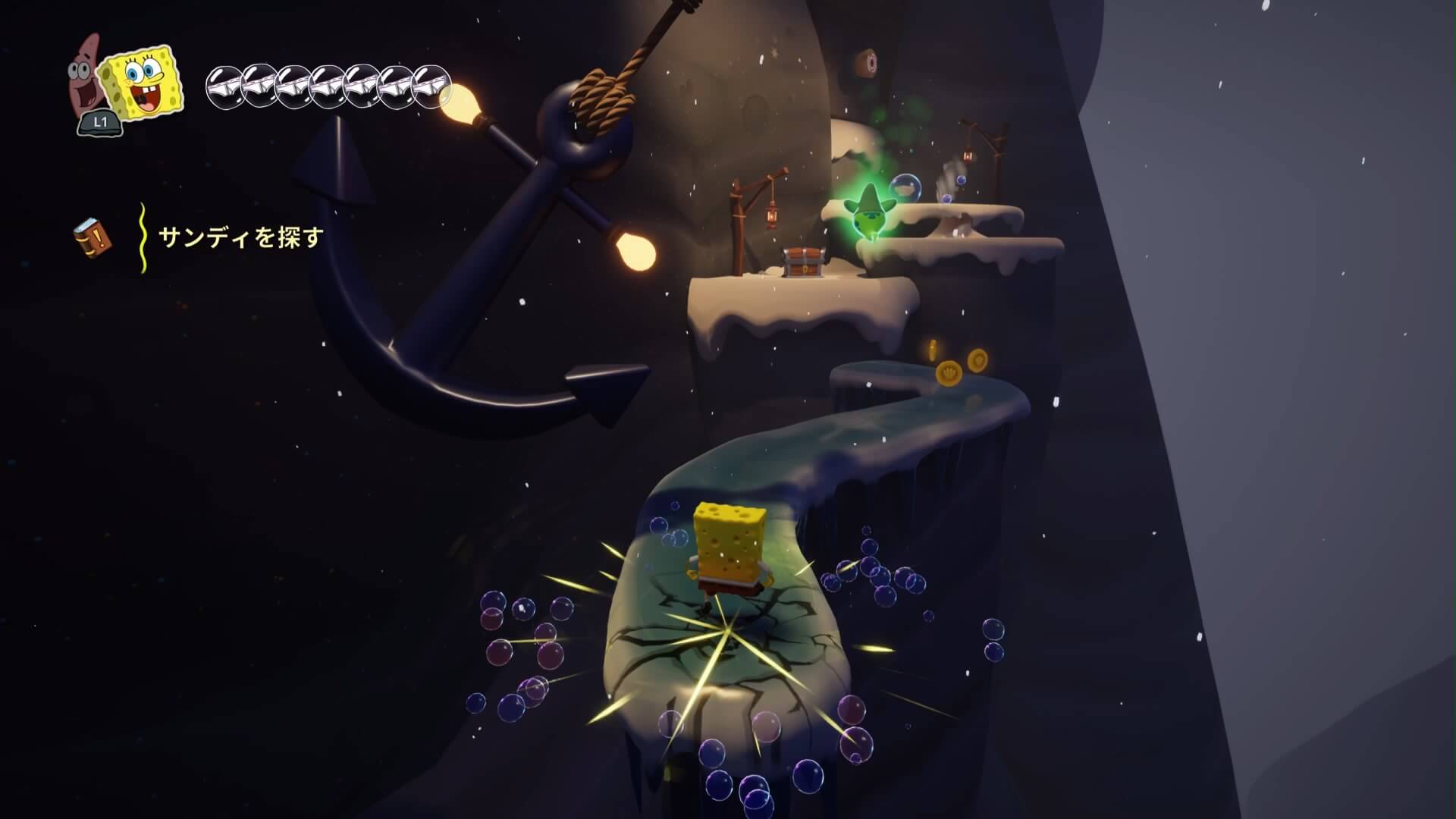 おばけ軍団を倒した後、シャボンでレバーを下ろしてリフトへ。シャボンを割って上昇し、重りを壊せば「緑の電球」を点灯させられる。
