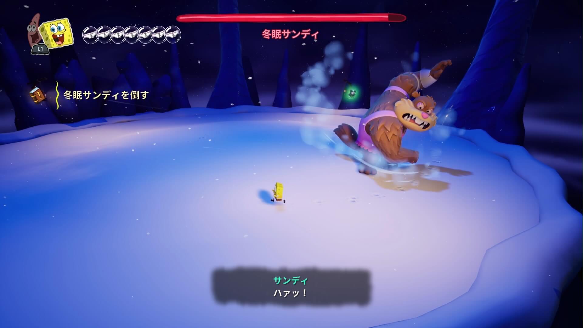 HPが「1/3」になると、サンディが倒れ込む際に「氷の波」が広がるようになる。ジャンプで簡単に避けられるが、飛び掛かりに限らず、引っ掻き後の「気絶しながら倒れ込む際にも広がる」ので注意!)