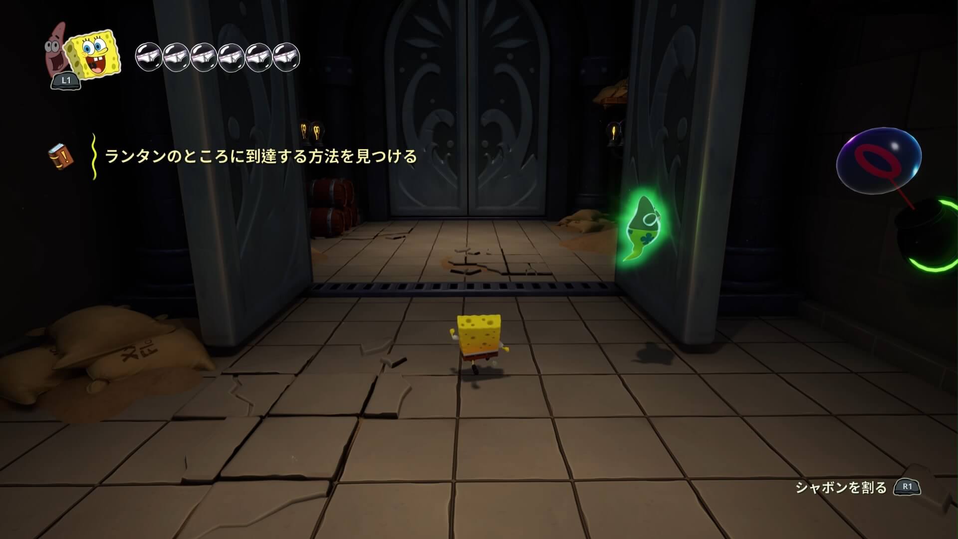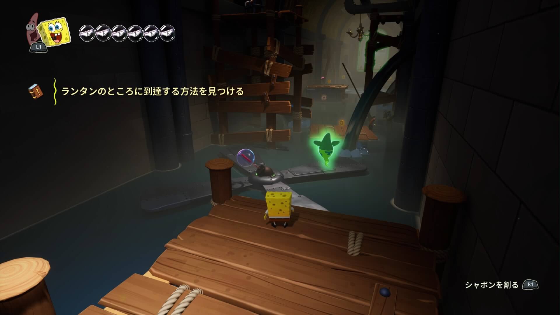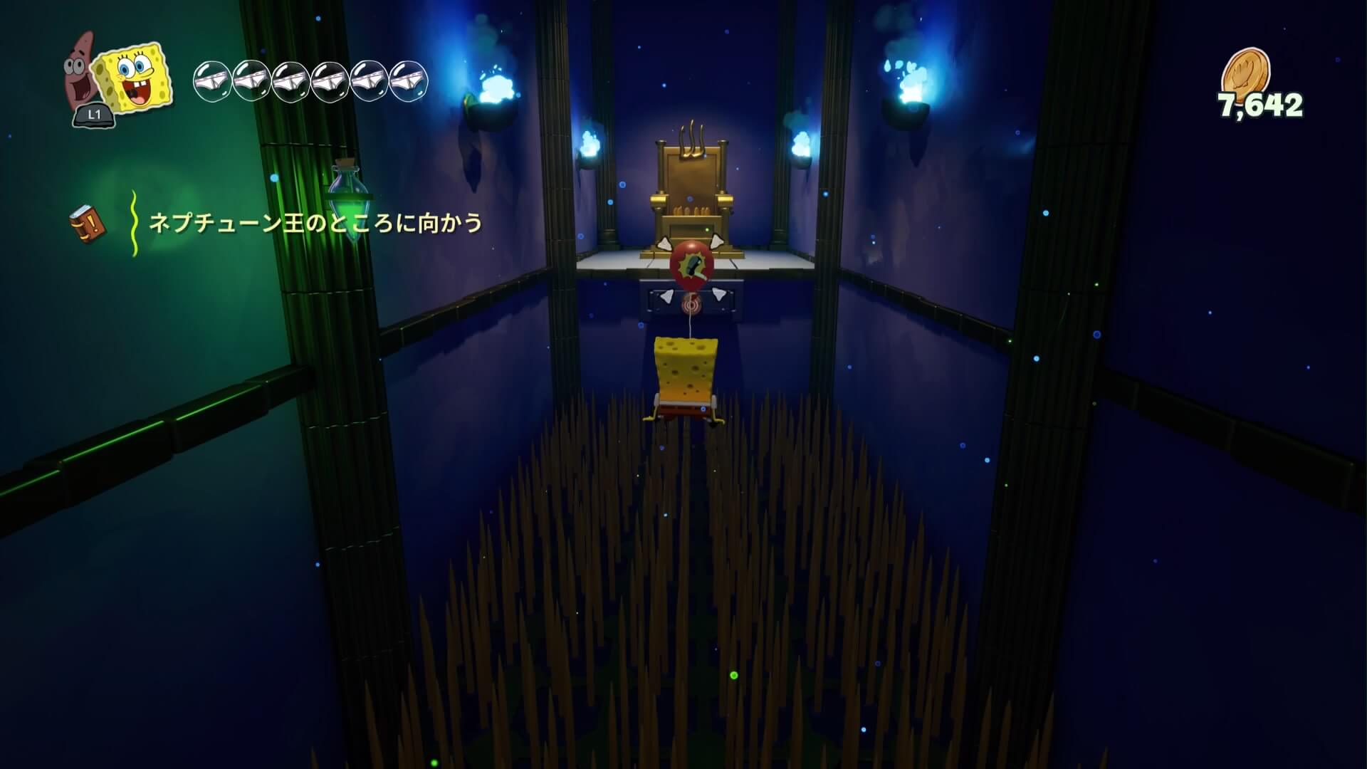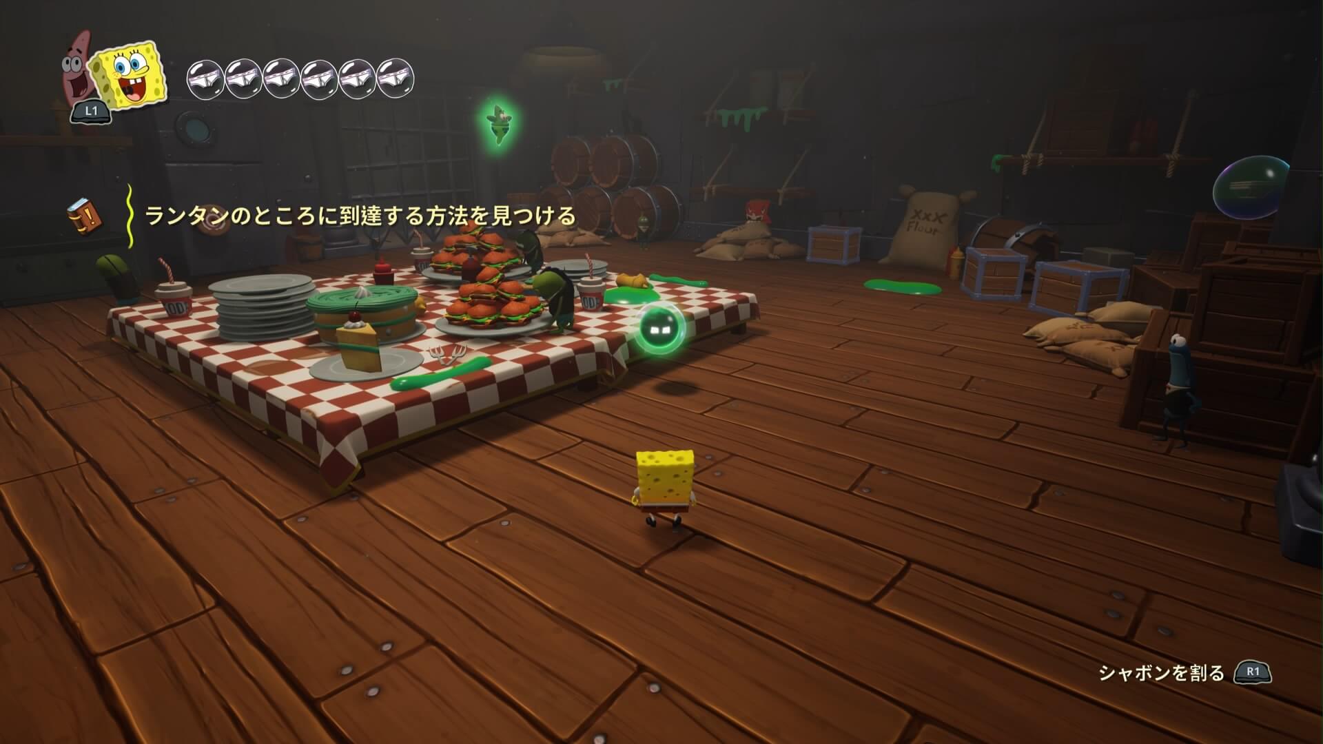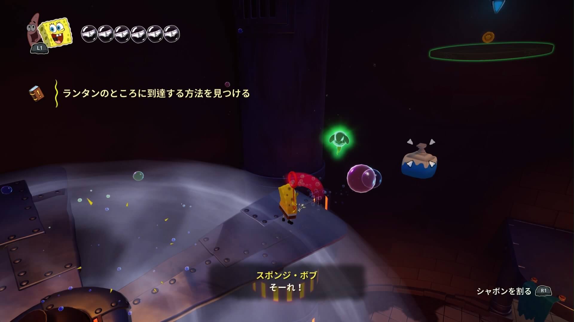 スポンジ・ボブの専用武器「シャボン玉スティック」を入手後、R1ボタンで「シャボン」が撃てるようになる。シャンプーに撃つと少しの間だけ「足場」に変えられるので、足場で跳ねてバスルームから出よう!