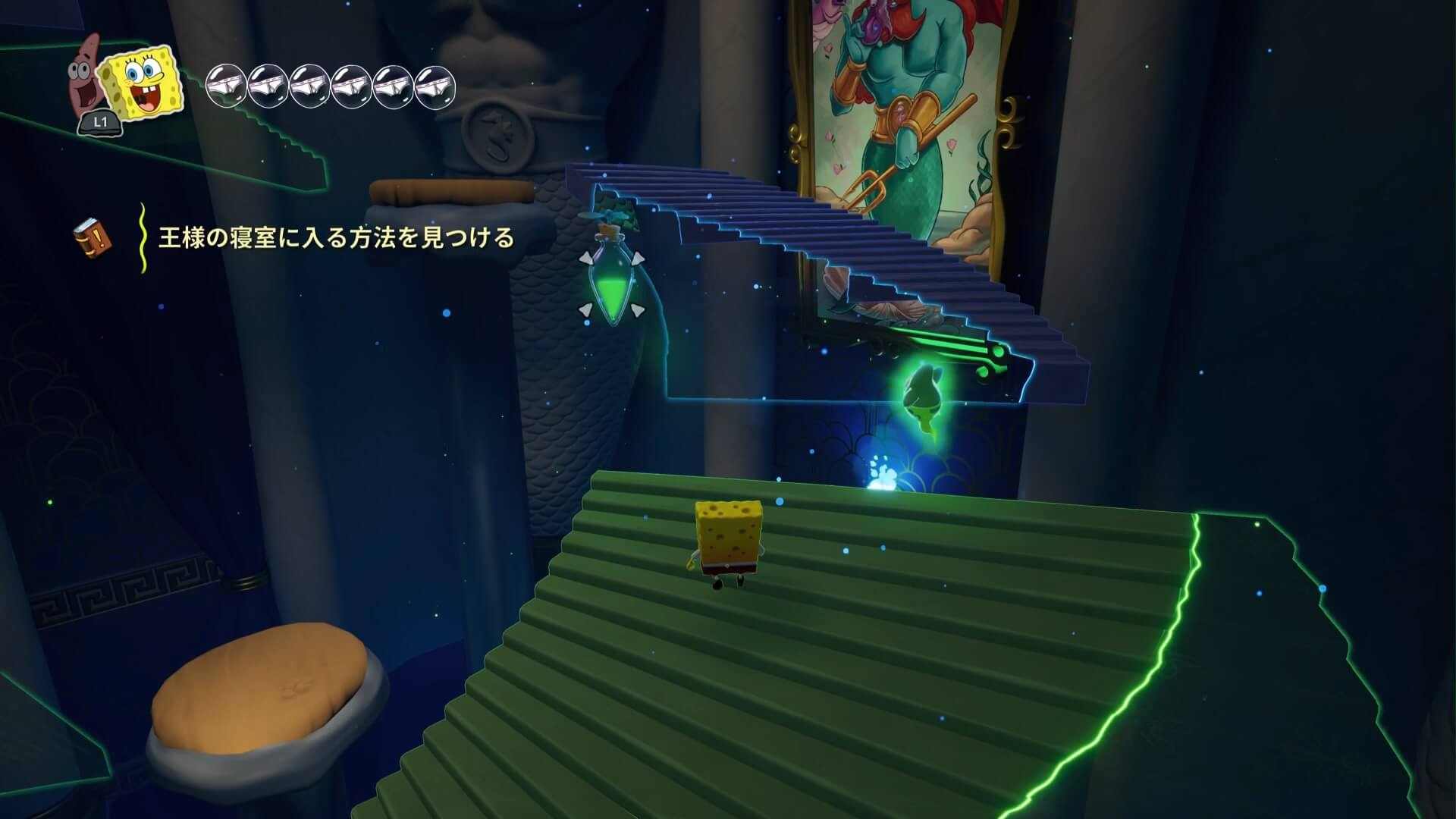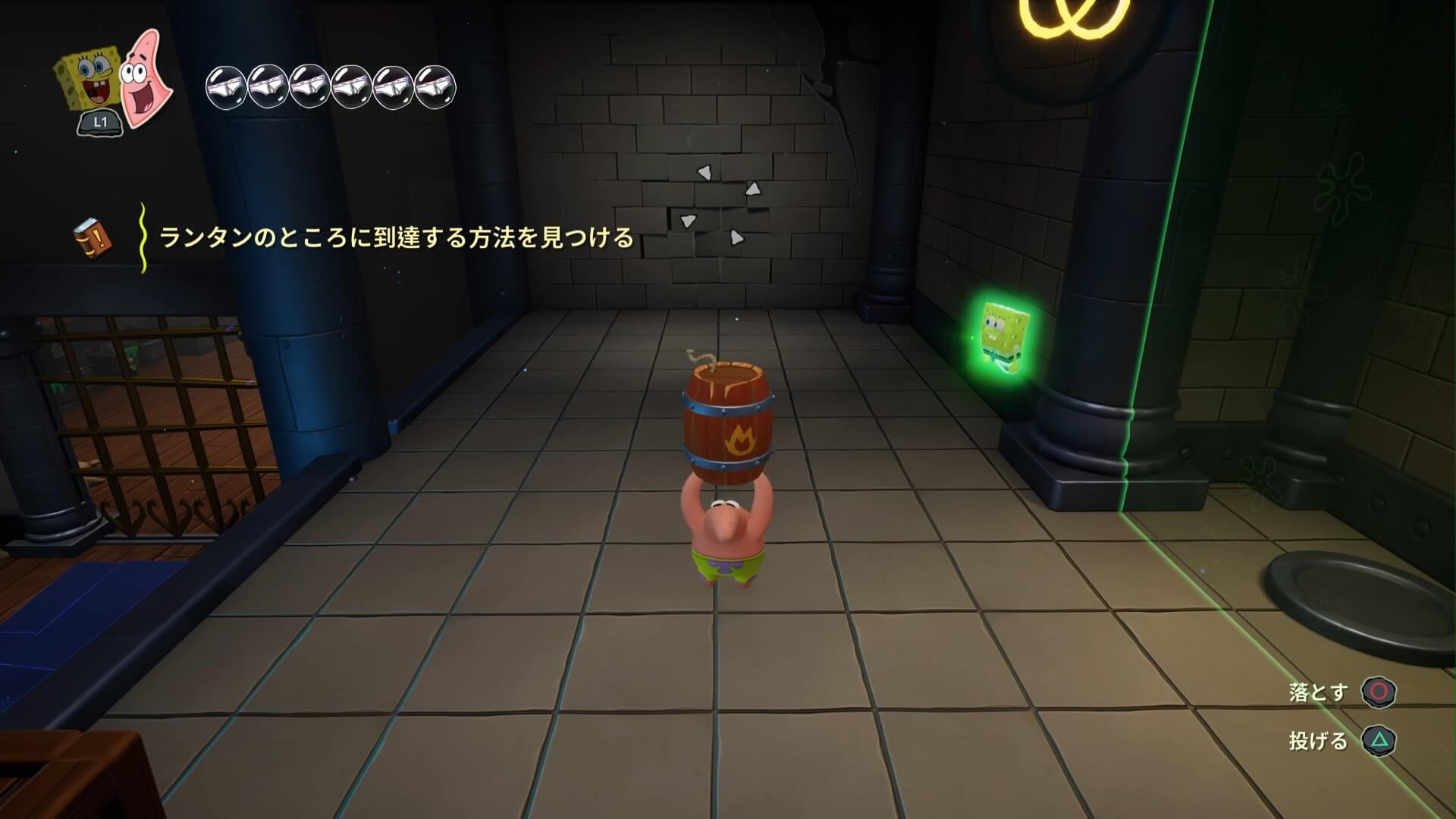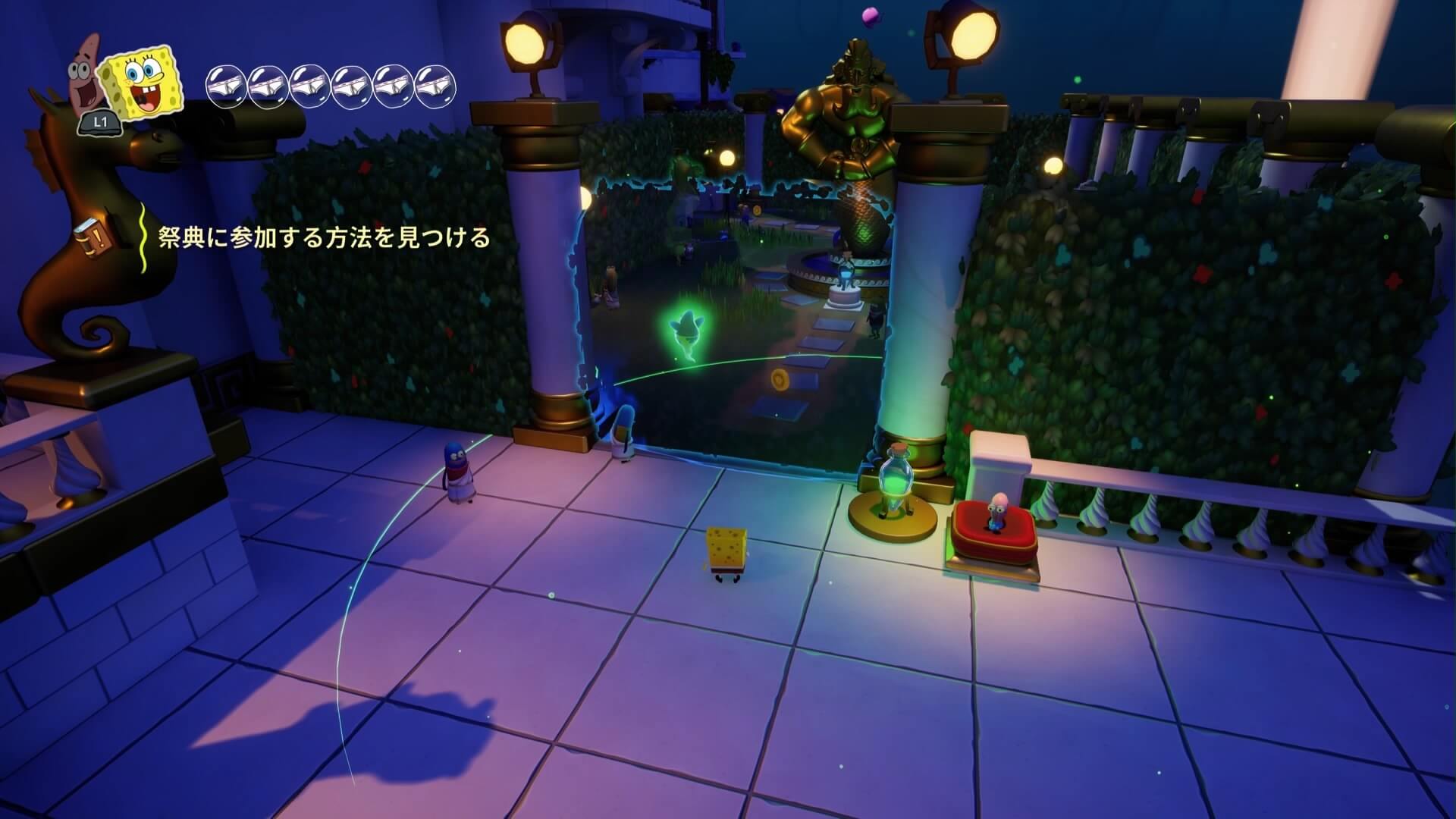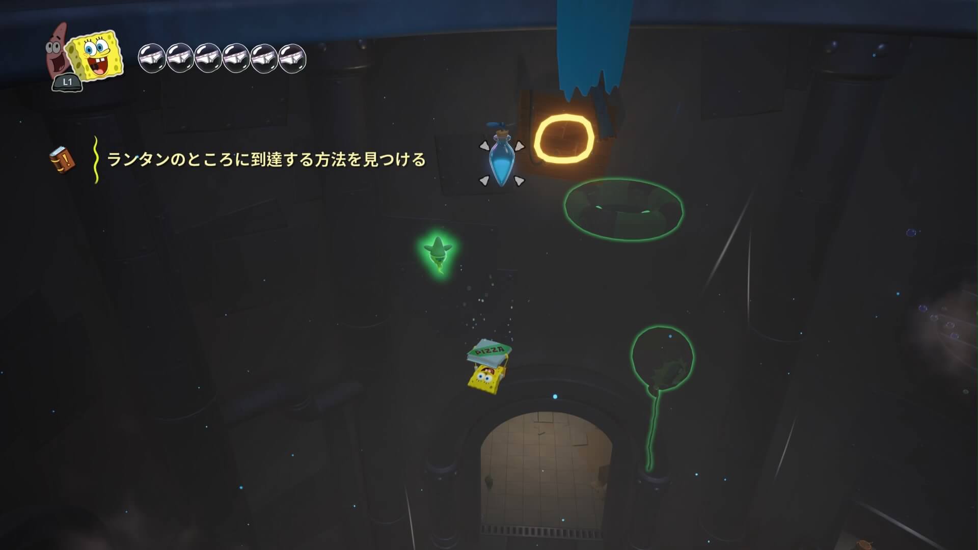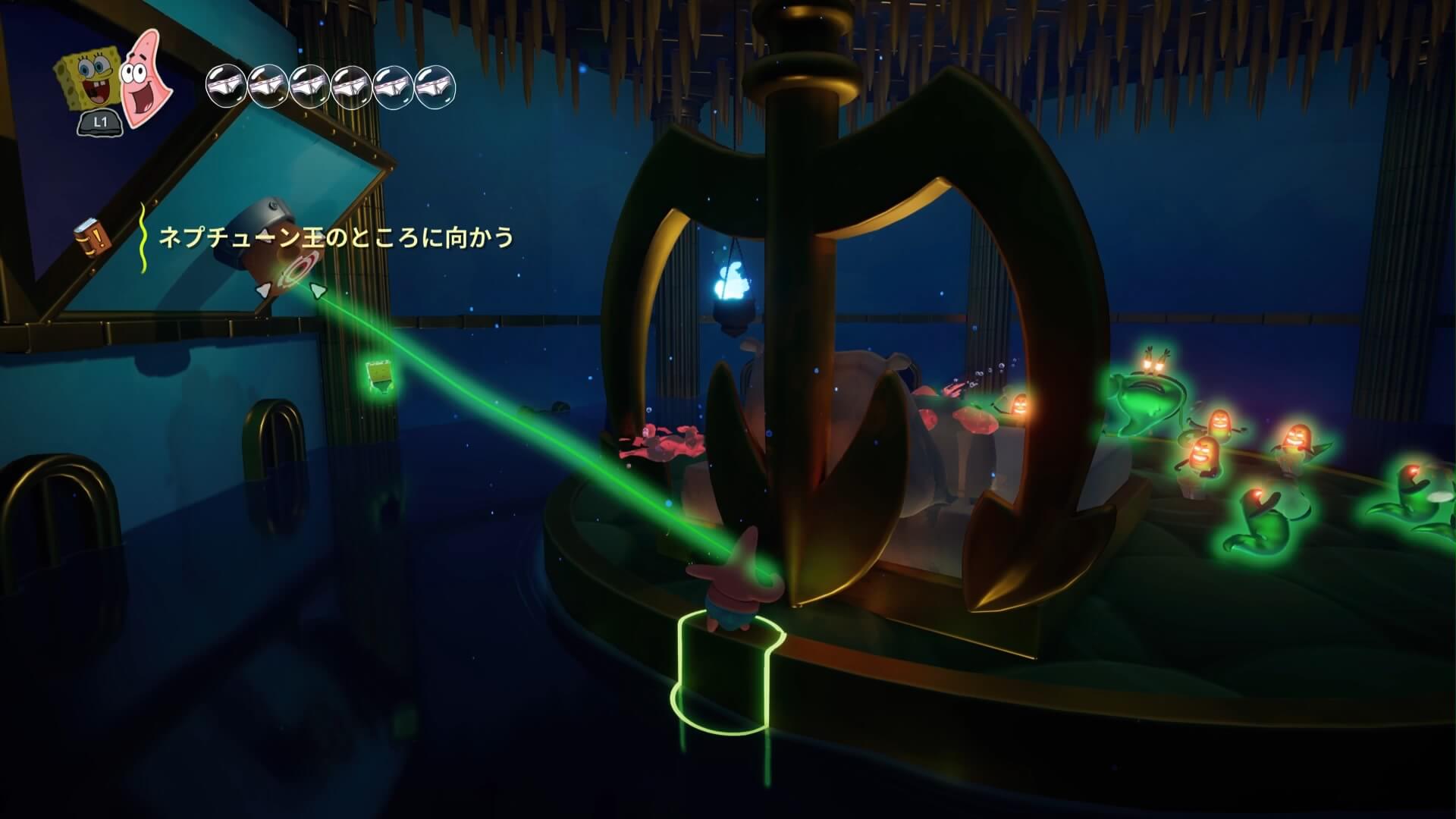 スポンジ・ボブの専用武器「シャボン玉スティック」を入手後、R1ボタンで「シャボン」が撃てるようになる。シャンプーに撃つと少しの間だけ「足場」に変えられるので、足場で跳ねてバスルームから出よう!
