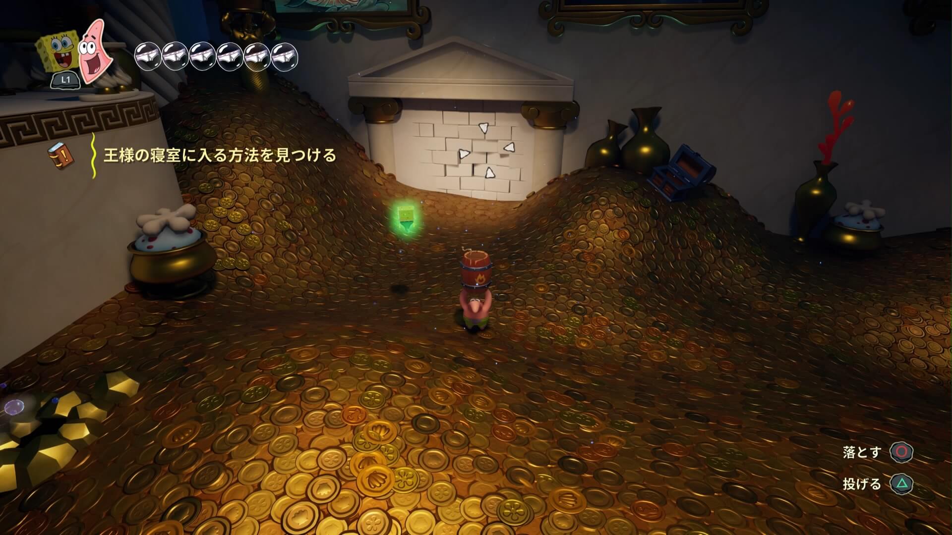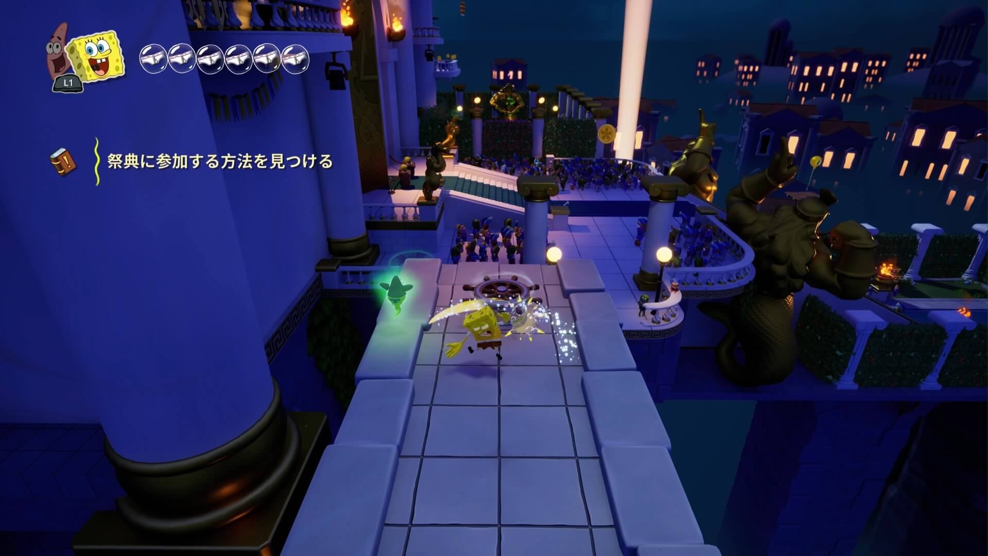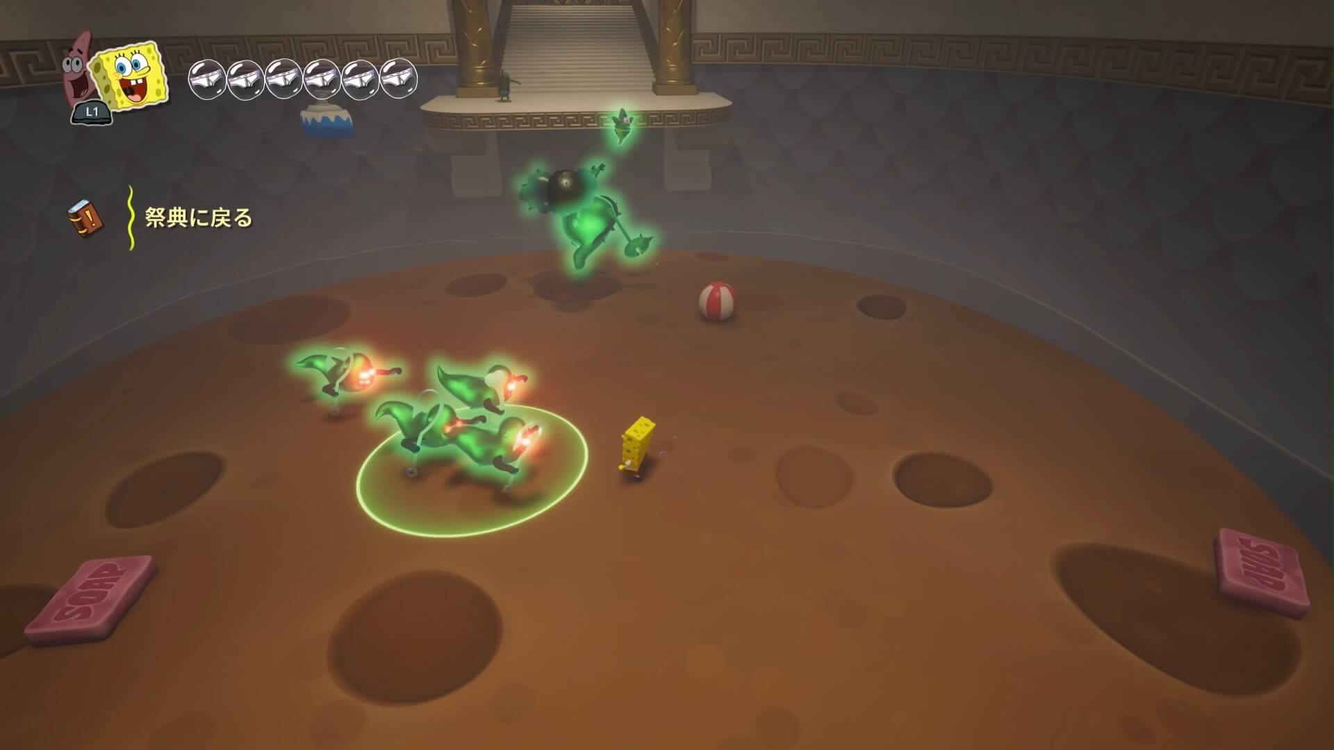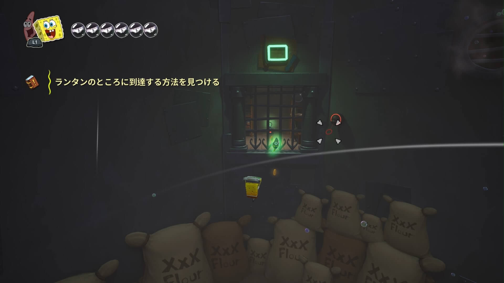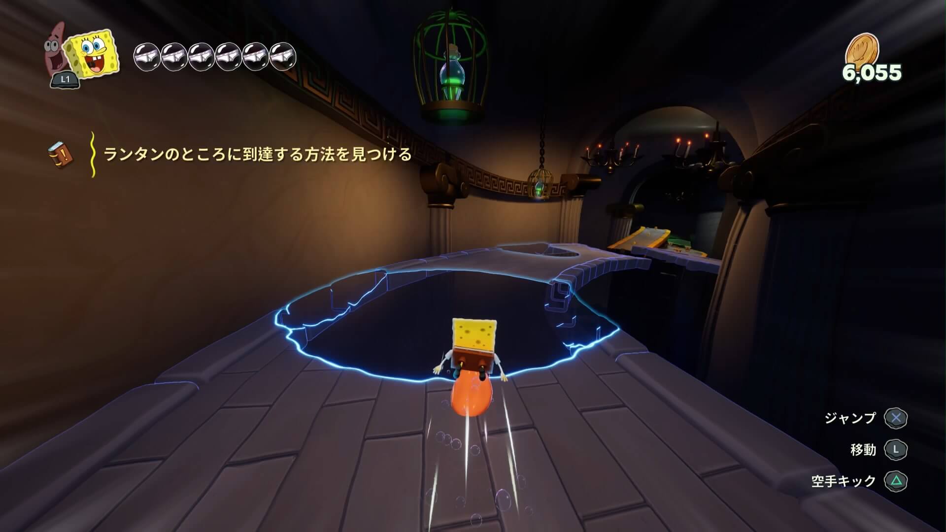 スポンジ・ボブの専用武器「シャボン玉スティック」を入手後、R1ボタンで「シャボン」が撃てるようになる。シャンプーに撃つと少しの間だけ「足場」に変えられるので、足場で跳ねてバスルームから出よう!