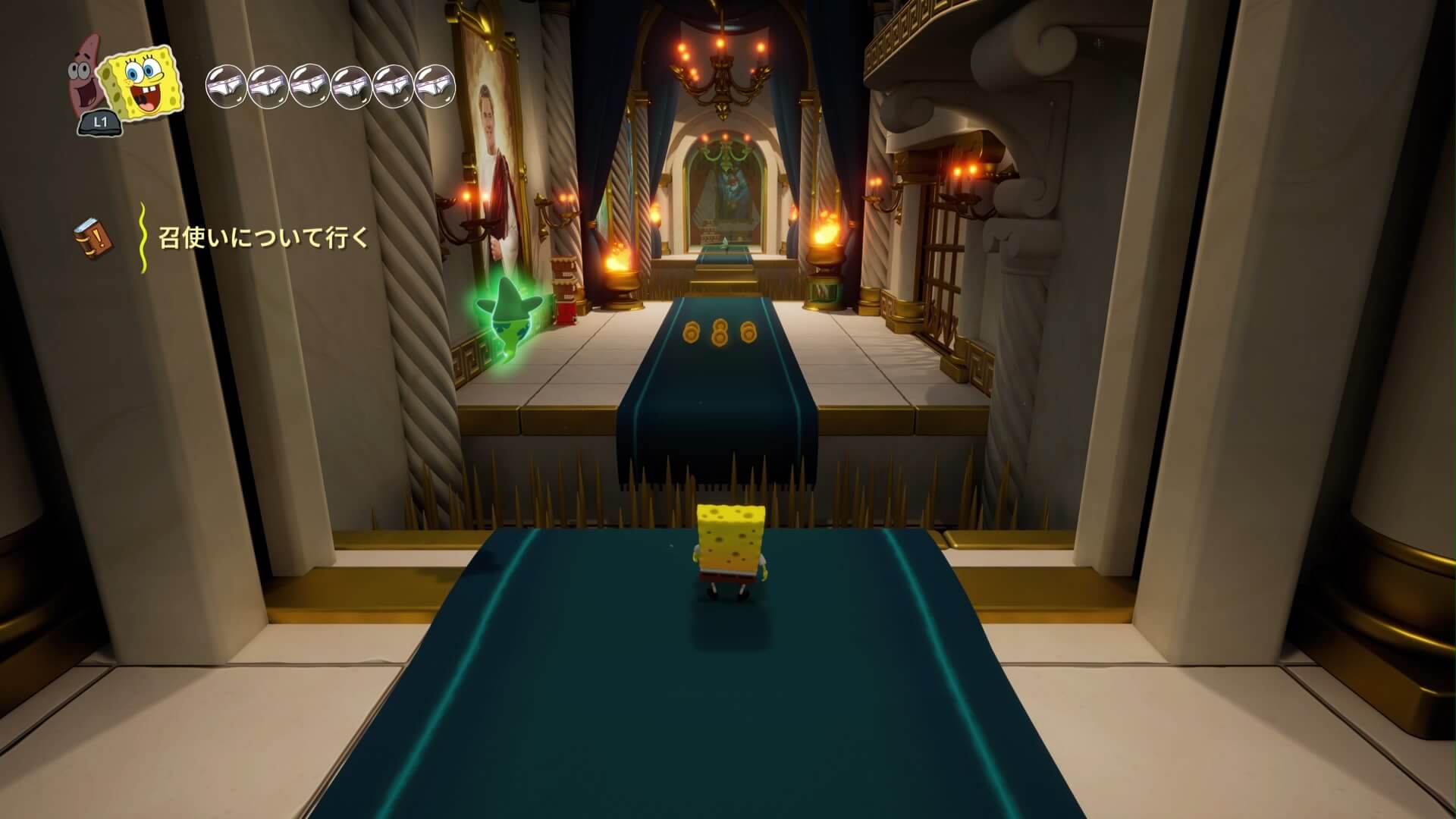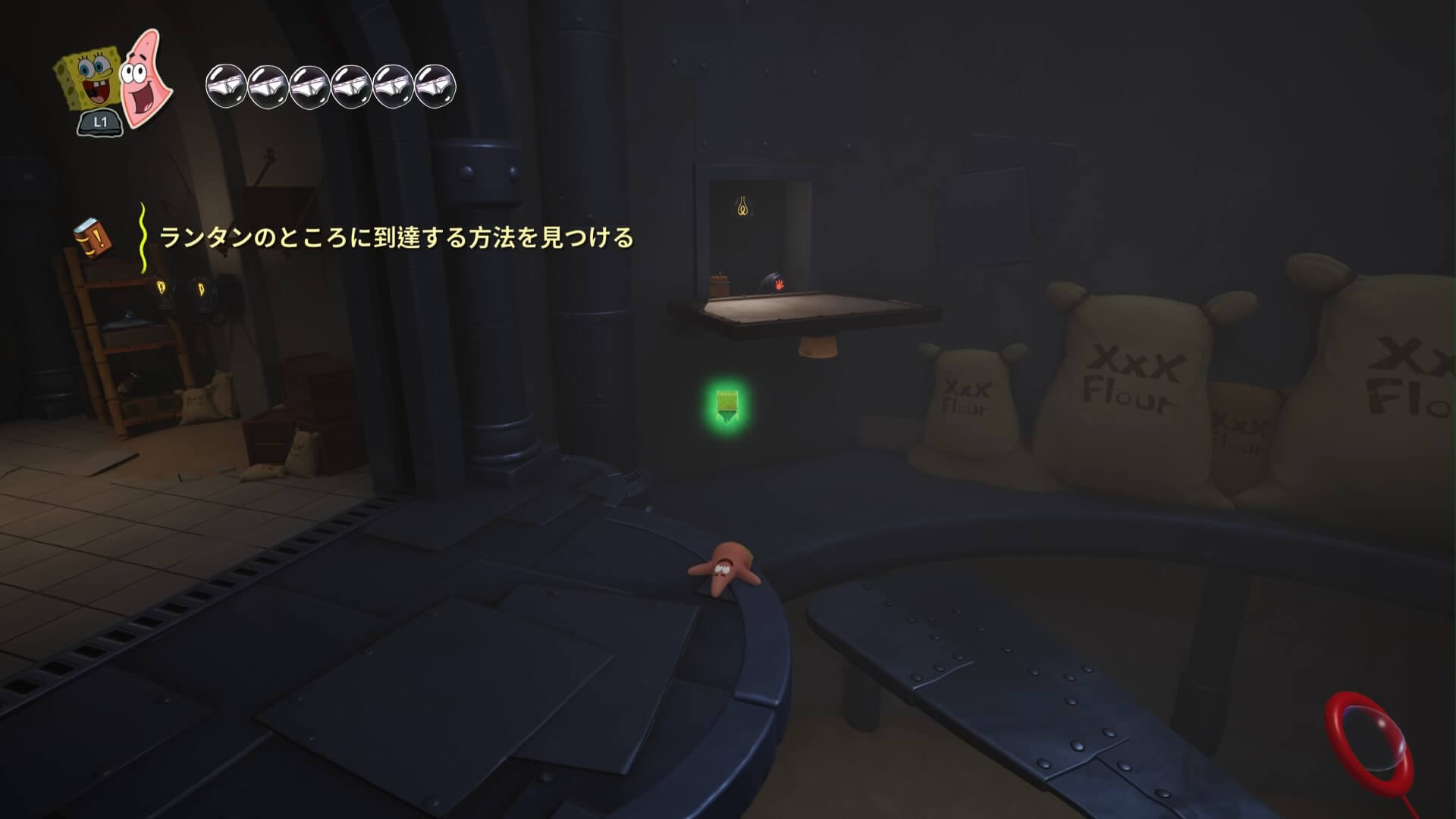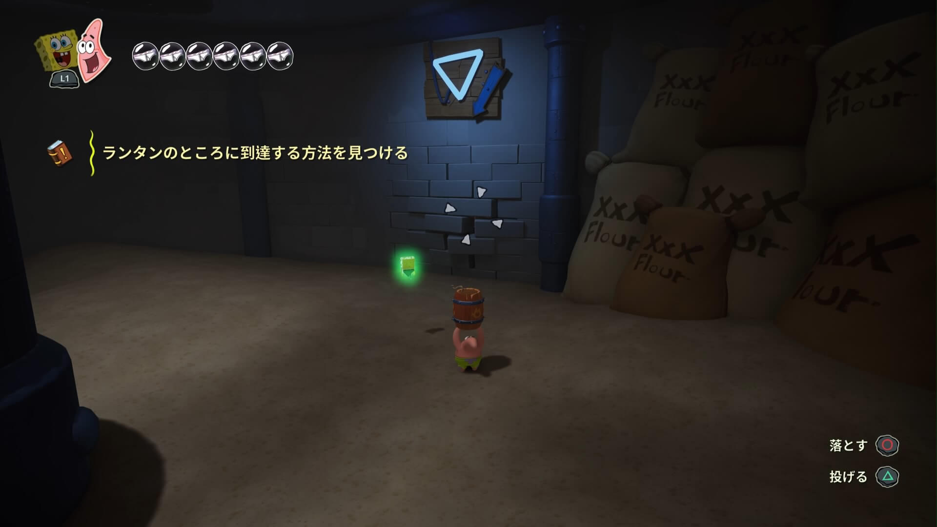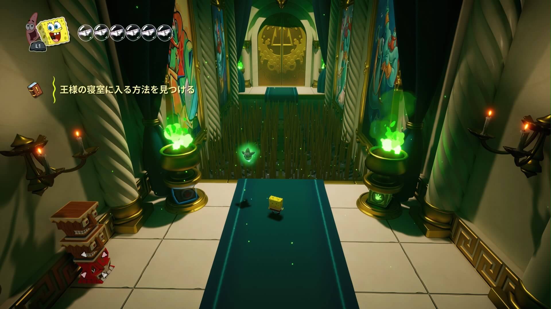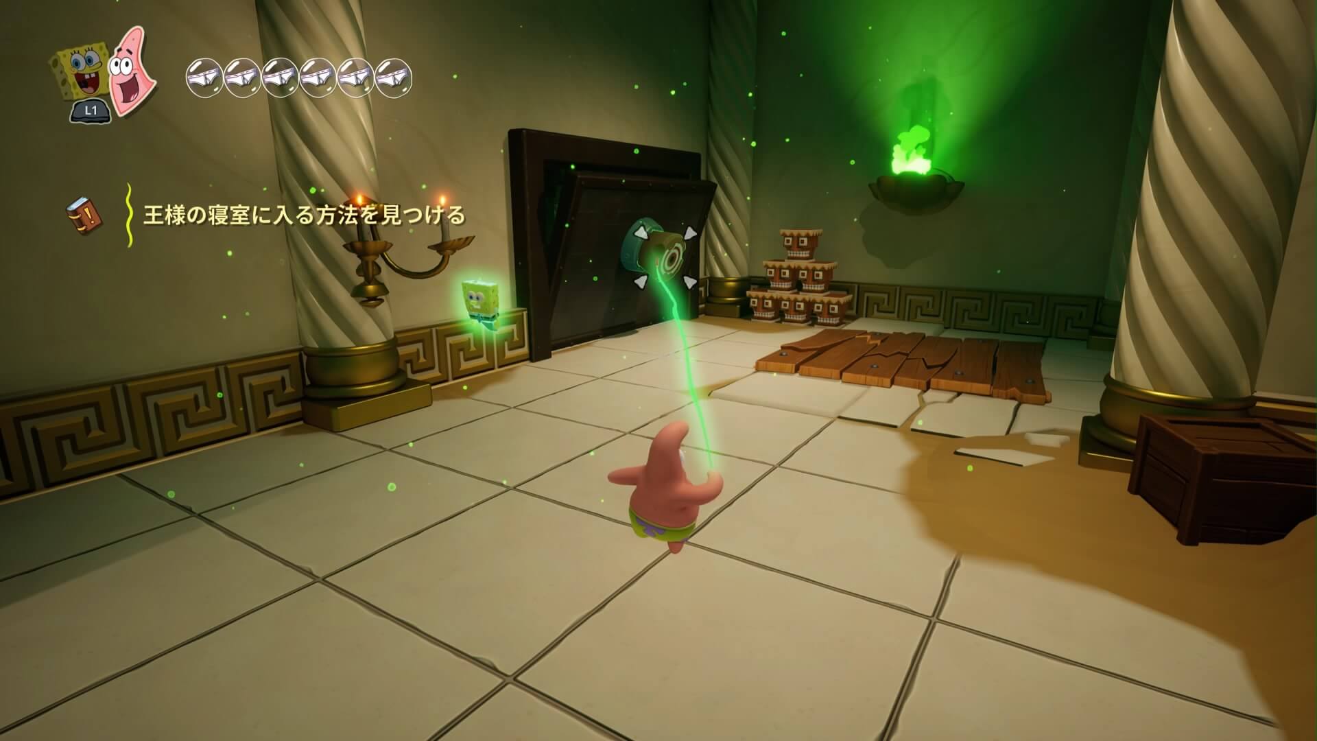 スポンジ・ボブの専用武器「シャボン玉スティック」を入手後、R1ボタンで「シャボン」が撃てるようになる。シャンプーに撃つと少しの間だけ「足場」に変えられるので、足場で跳ねてバスルームから出よう!
