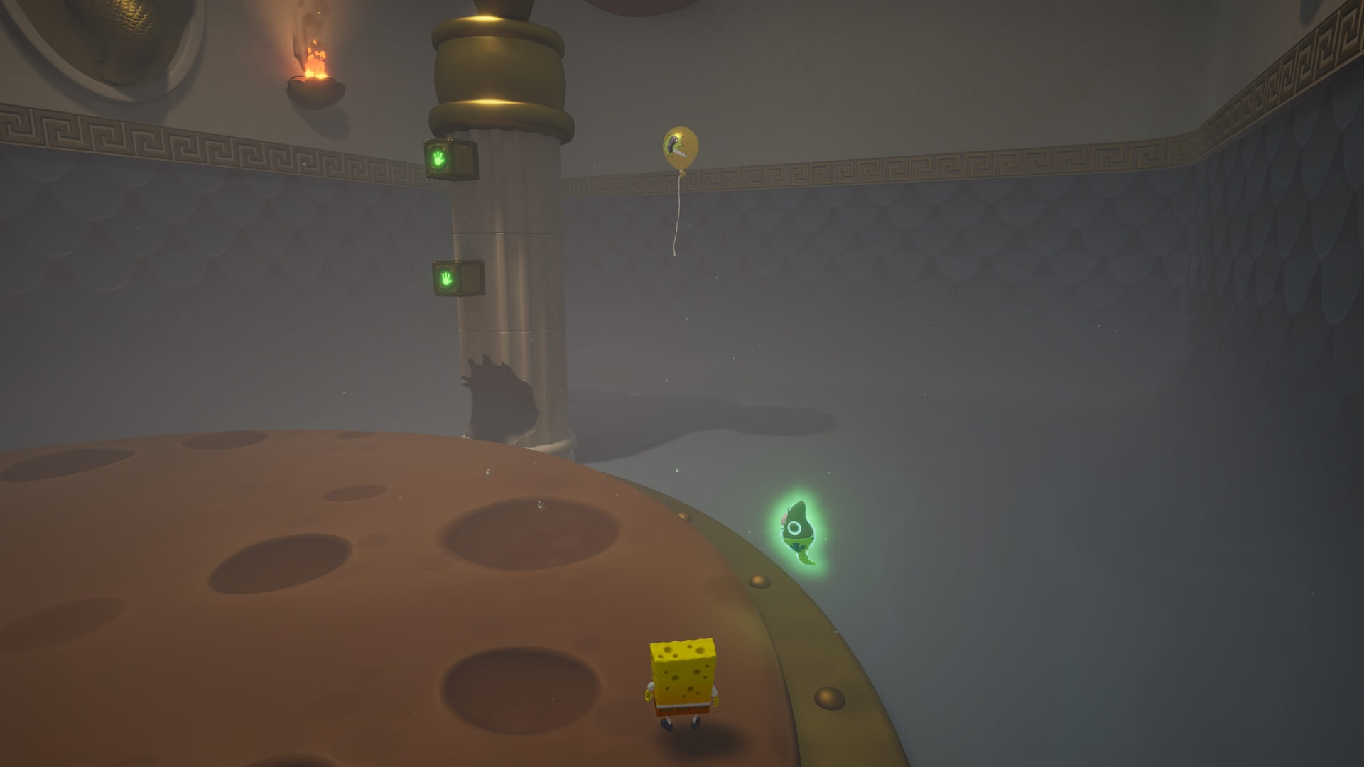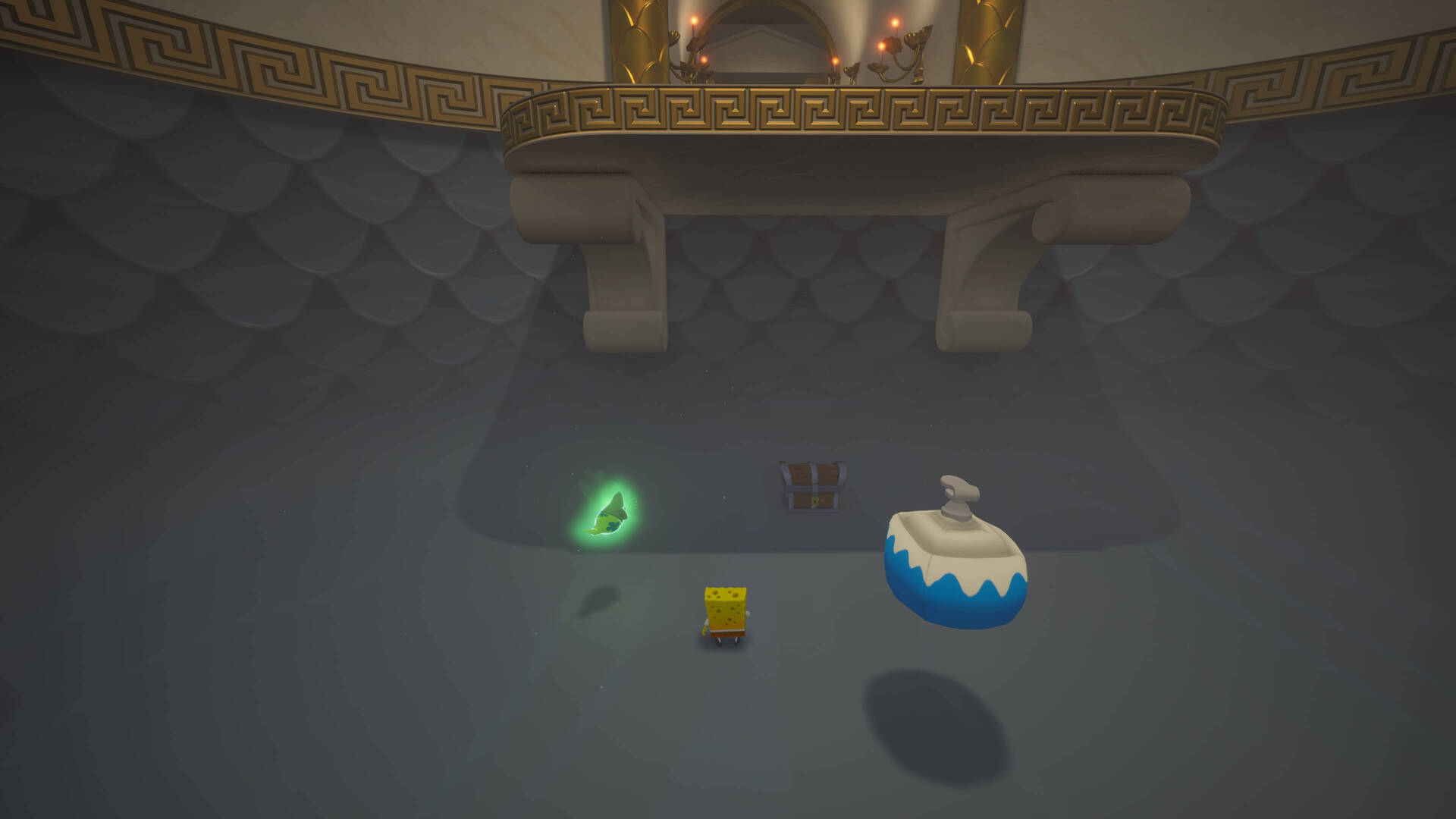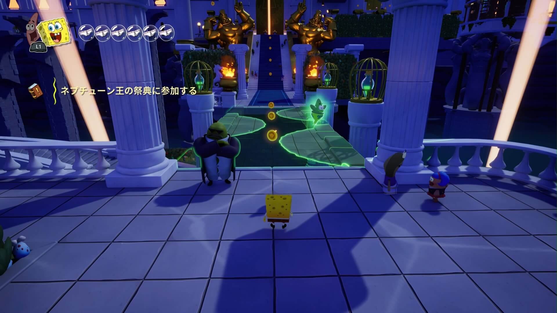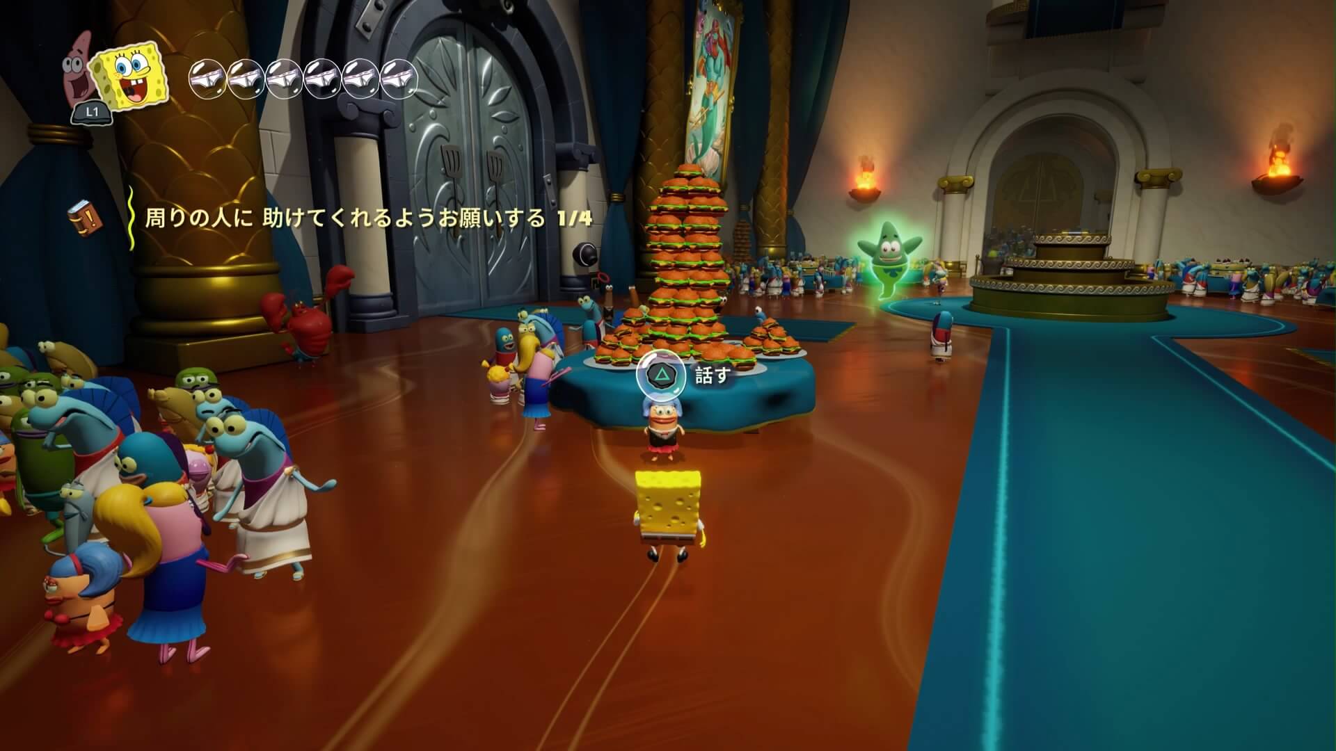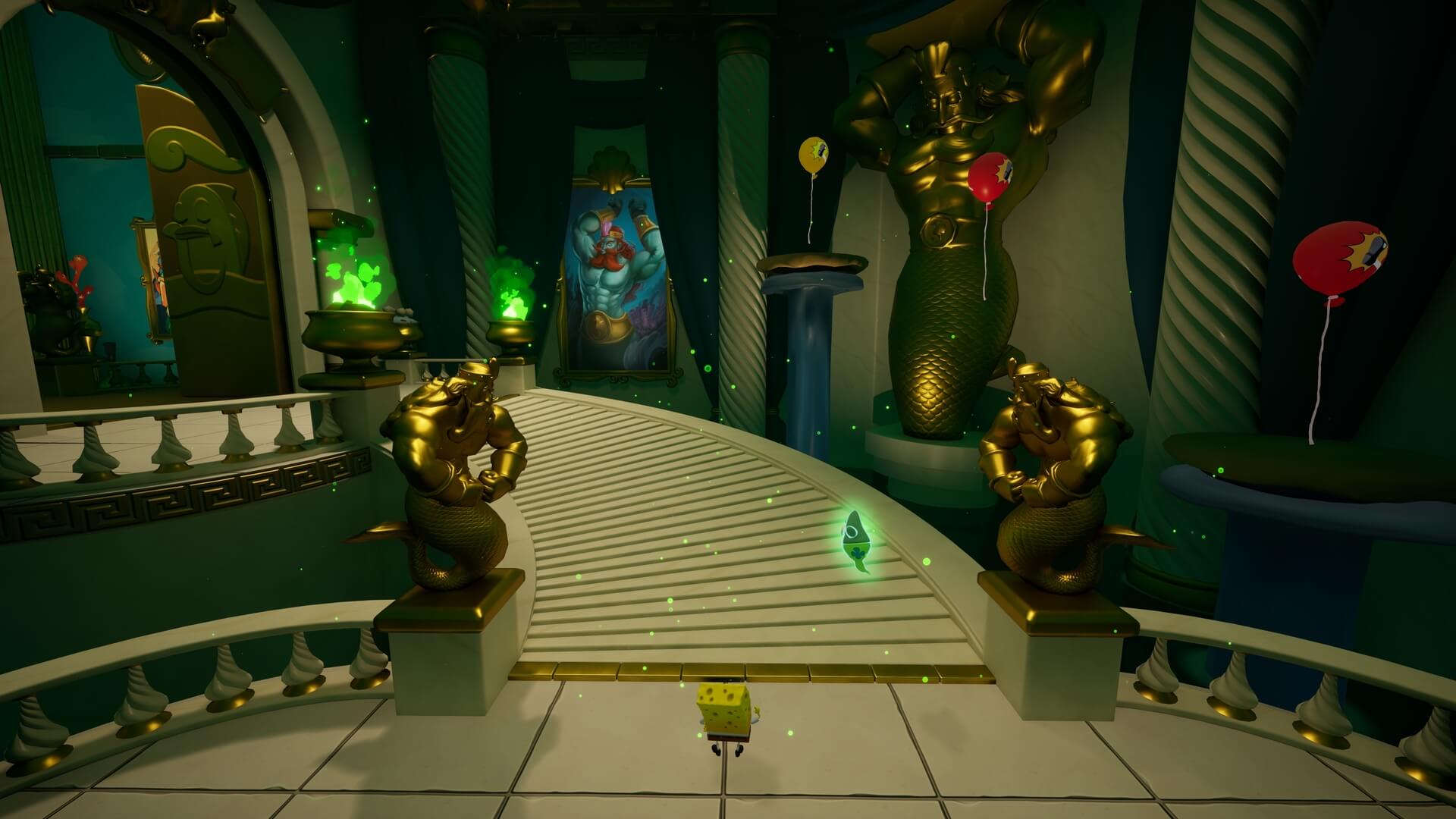 スポンジ・ボブの専用武器「シャボン玉スティック」を入手後、R1ボタンで「シャボン」が撃てるようになる。シャンプーに撃つと少しの間だけ「足場」に変えられるので、足場で跳ねてバスルームから出よう!