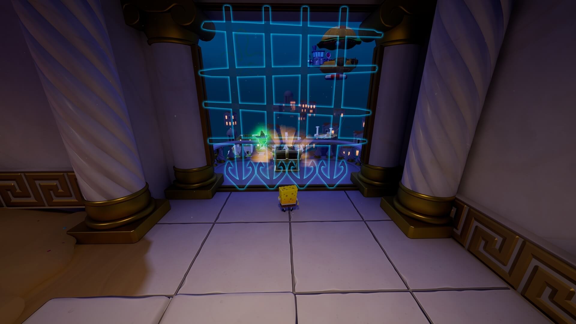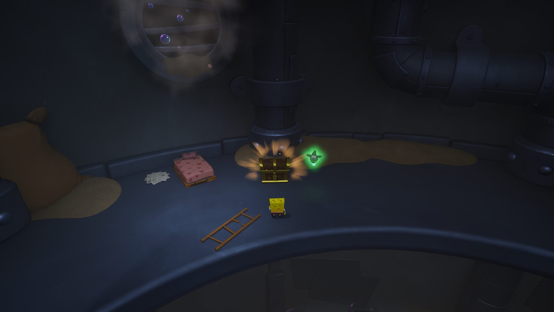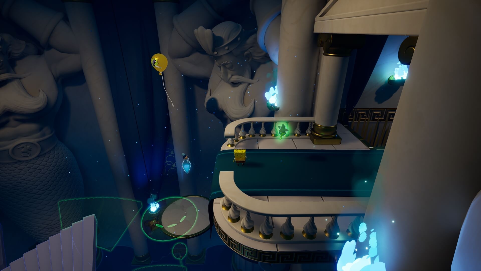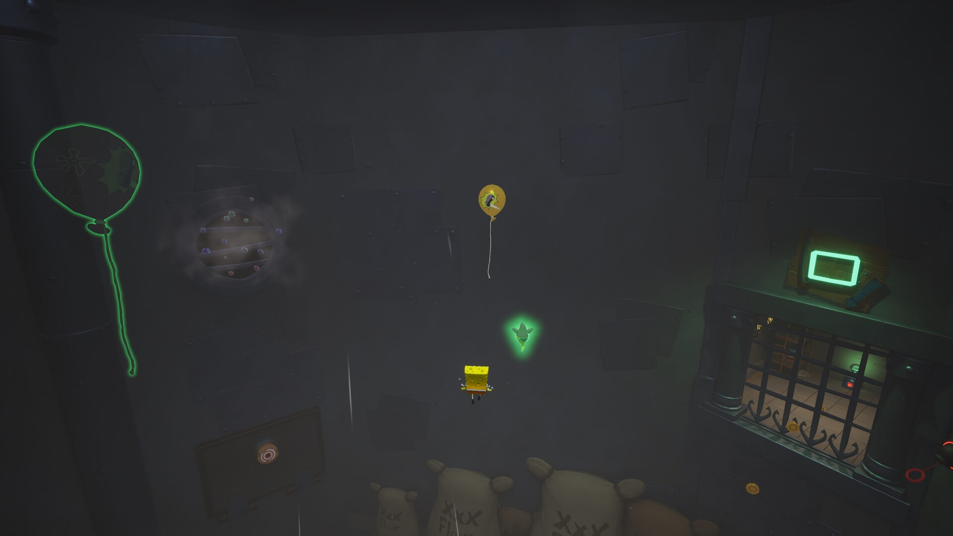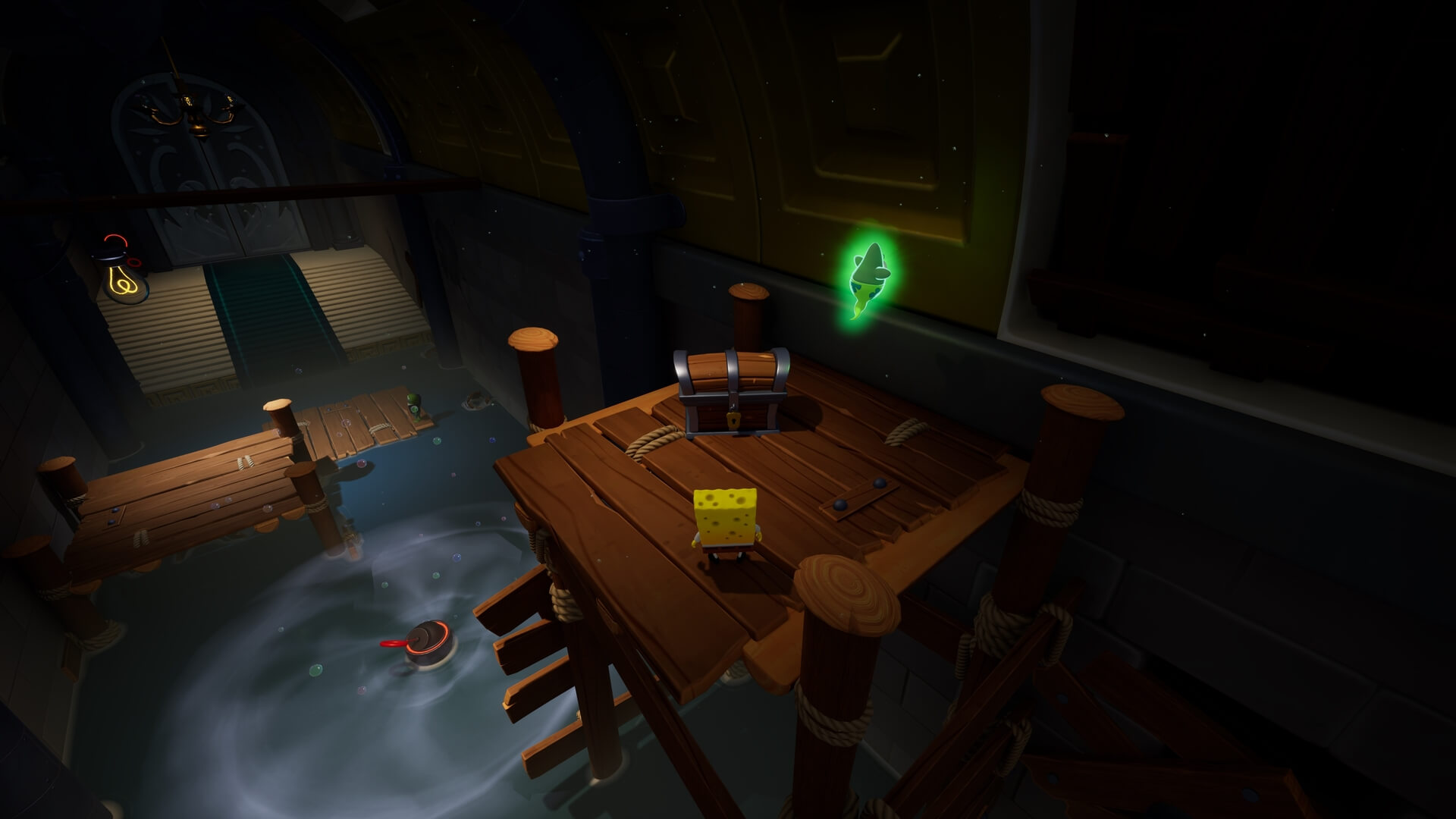 スポンジ・ボブの専用武器「シャボン玉スティック」を入手後、R1ボタンで「シャボン」が撃てるようになる。シャンプーに撃つと少しの間だけ「足場」に変えられるので、足場で跳ねてバスルームから出よう!