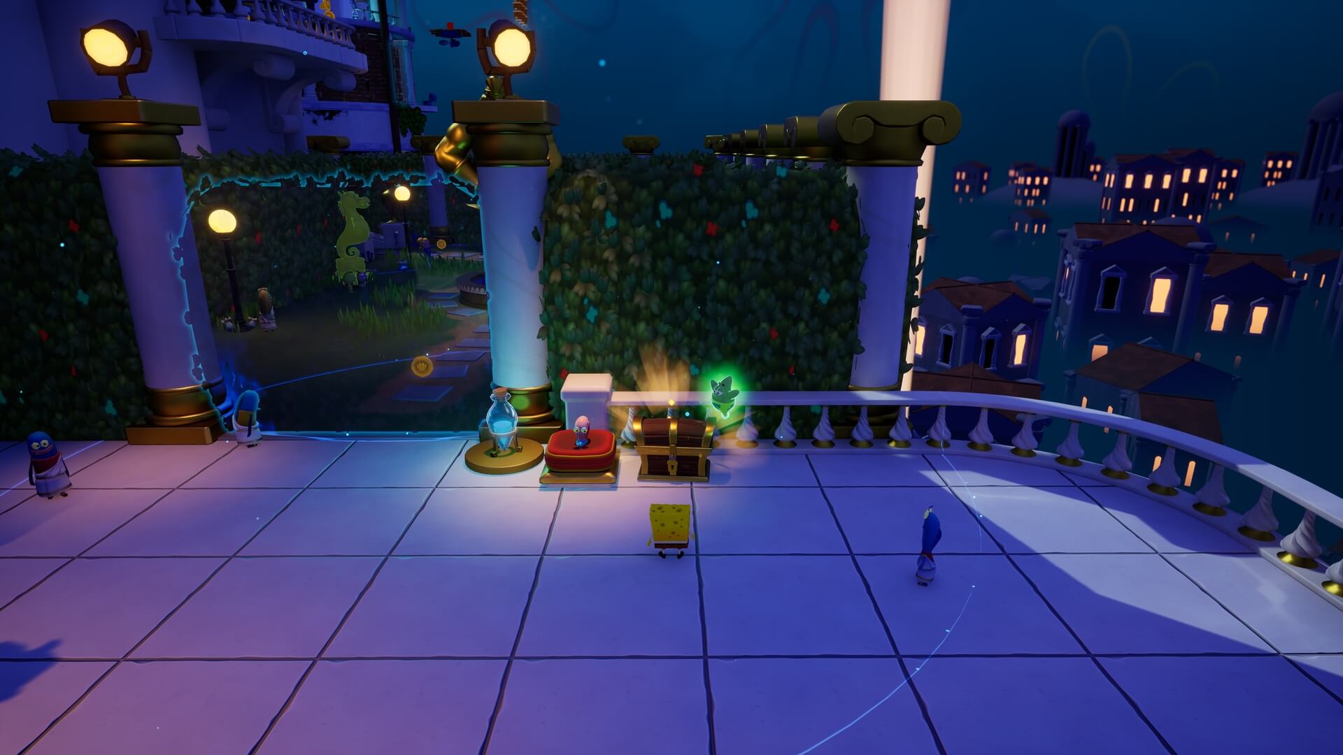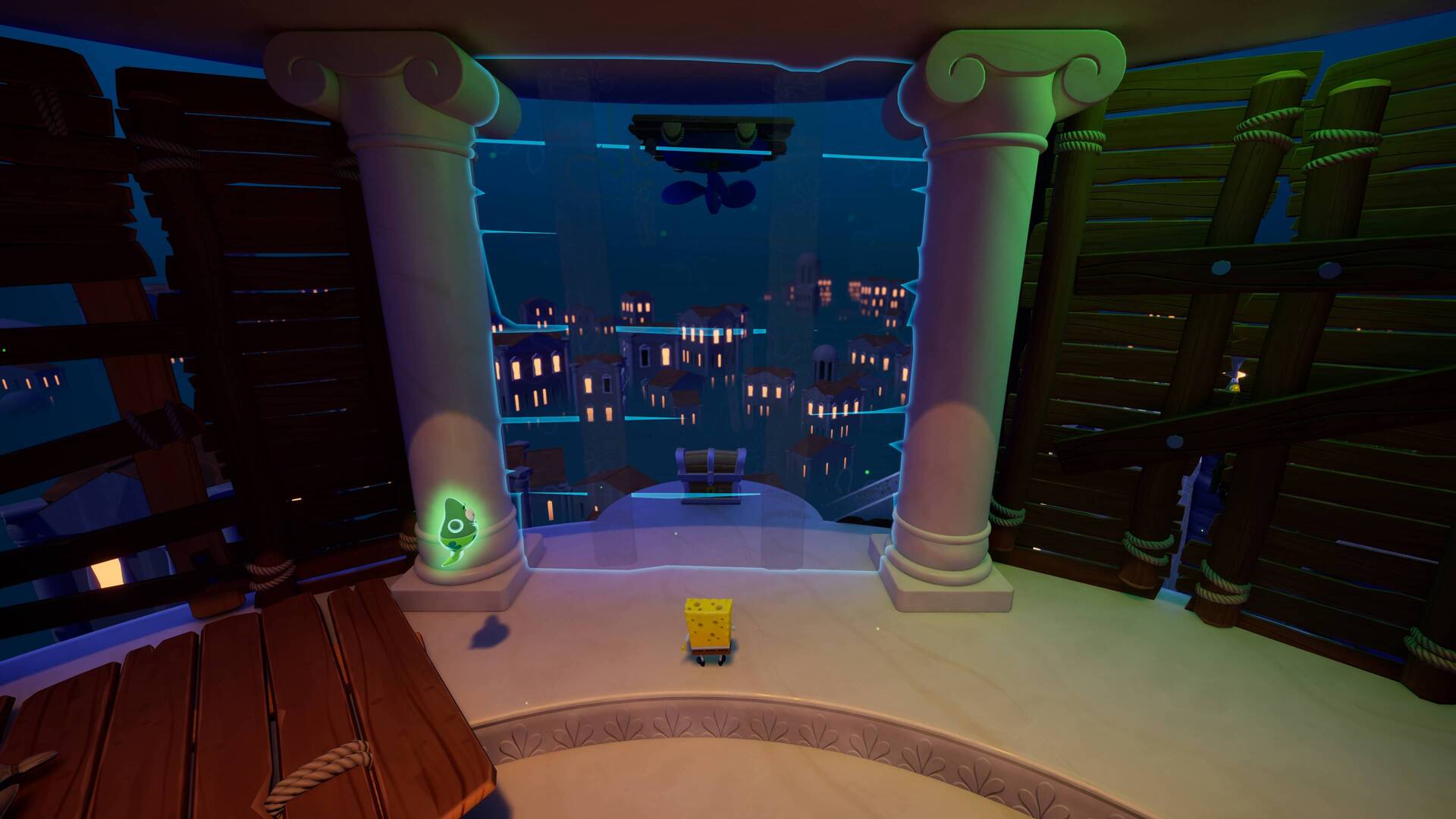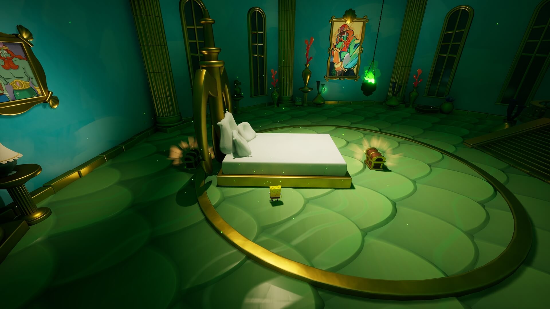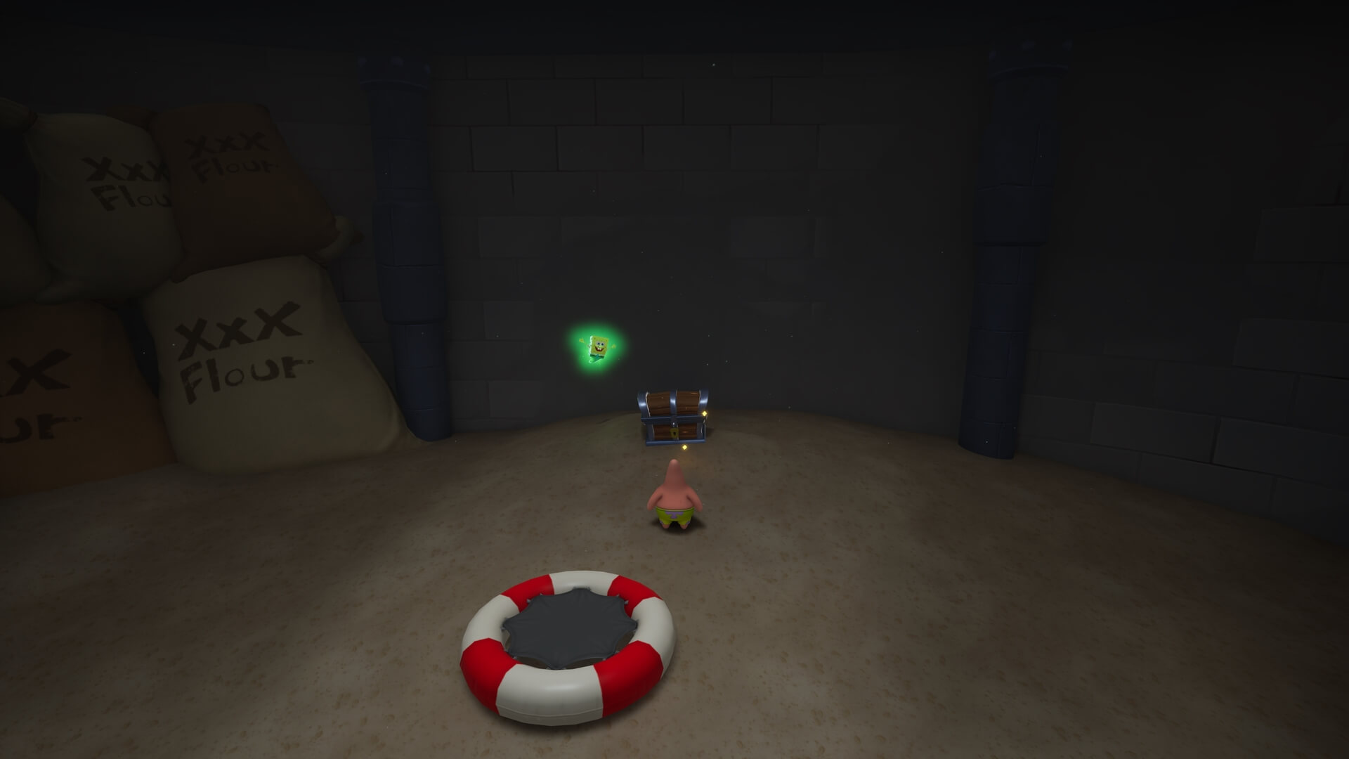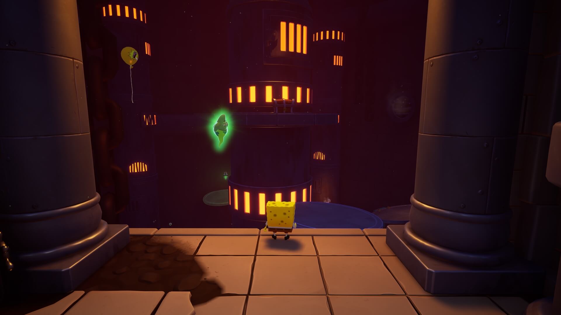 スポンジ・ボブの専用武器「シャボン玉スティック」を入手後、R1ボタンで「シャボン」が撃てるようになる。シャンプーに撃つと少しの間だけ「足場」に変えられるので、足場で跳ねてバスルームから出よう!