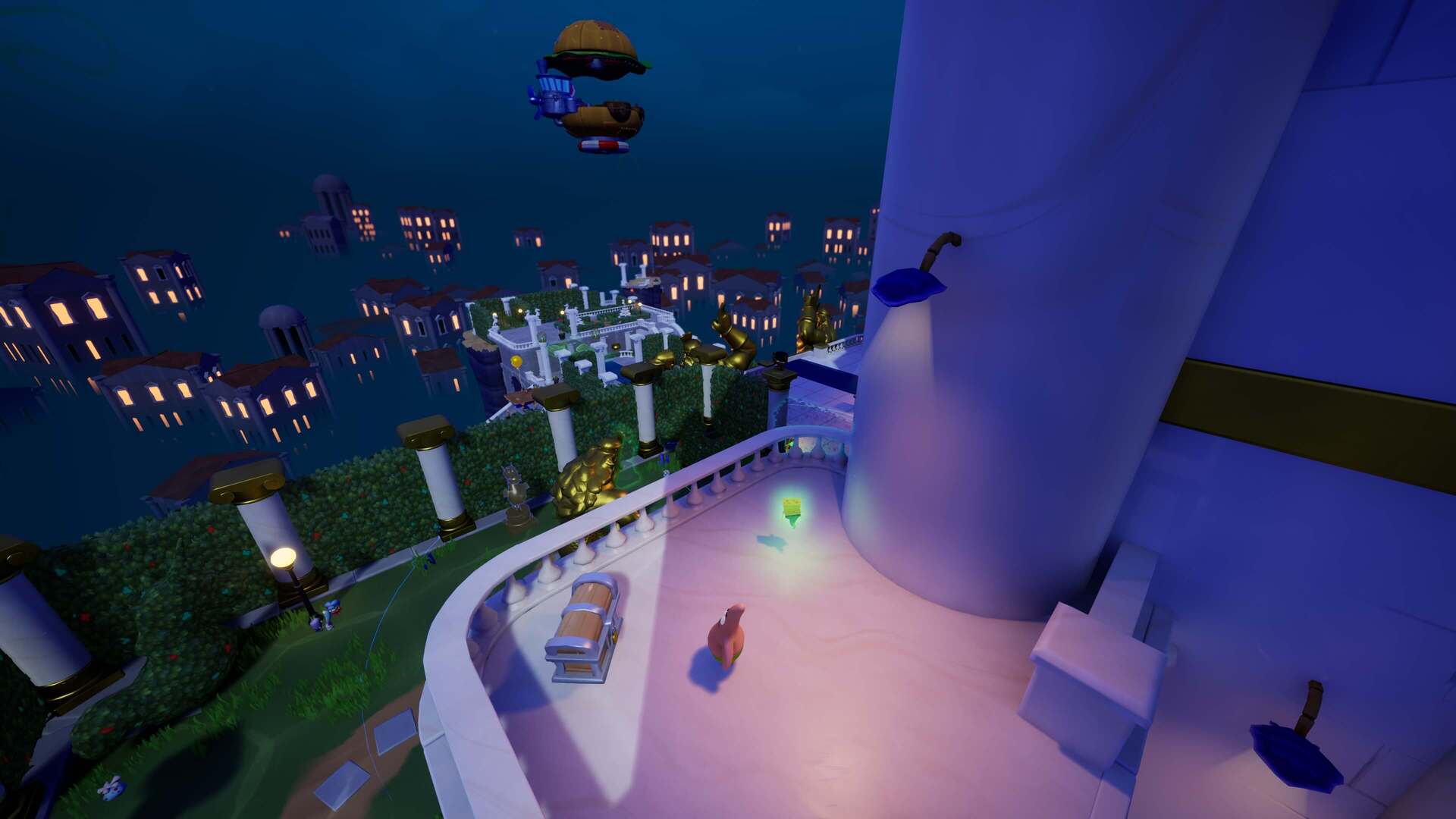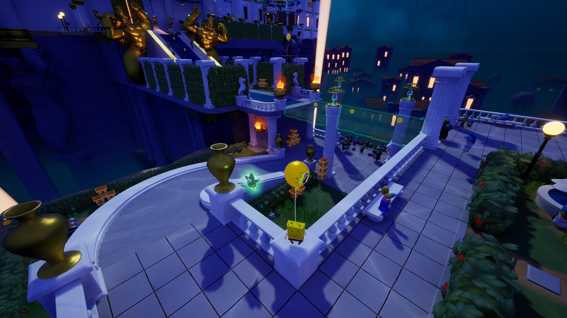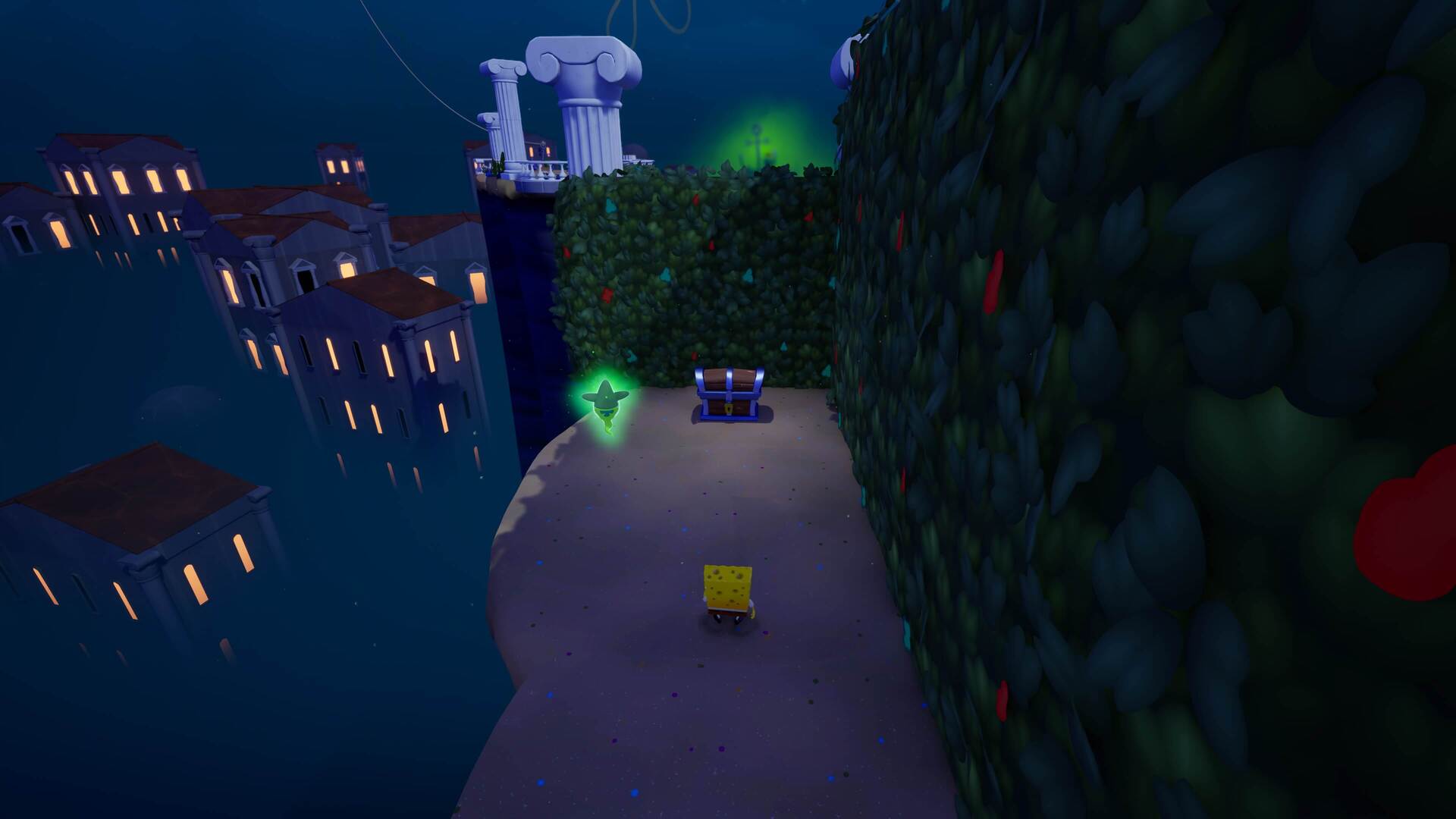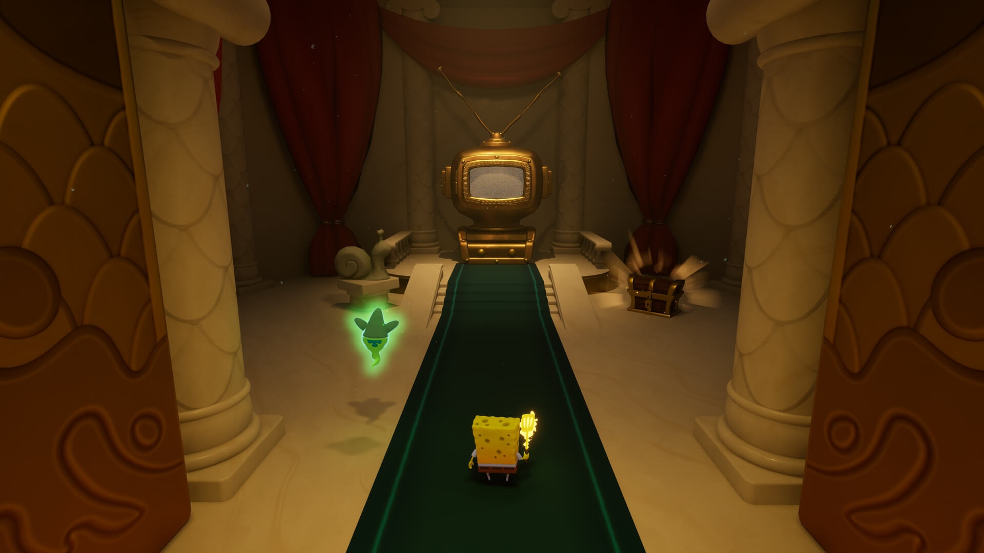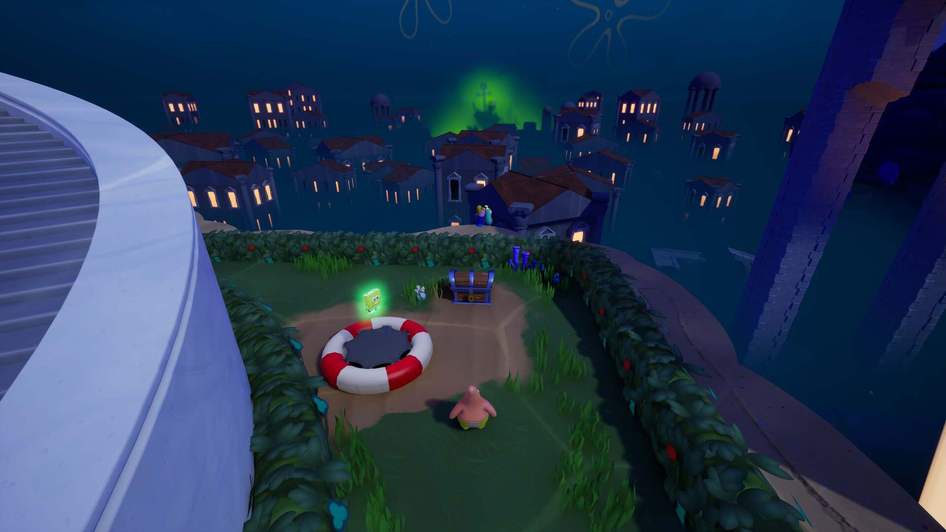 スポンジ・ボブの専用武器「シャボン玉スティック」を入手後、R1ボタンで「シャボン」が撃てるようになる。シャンプーに撃つと少しの間だけ「足場」に変えられるので、足場で跳ねてバスルームから出よう!