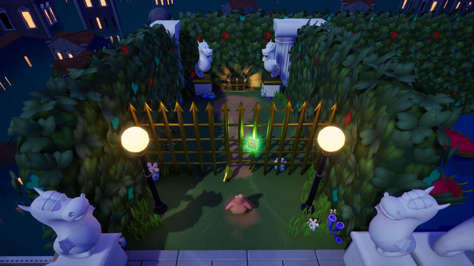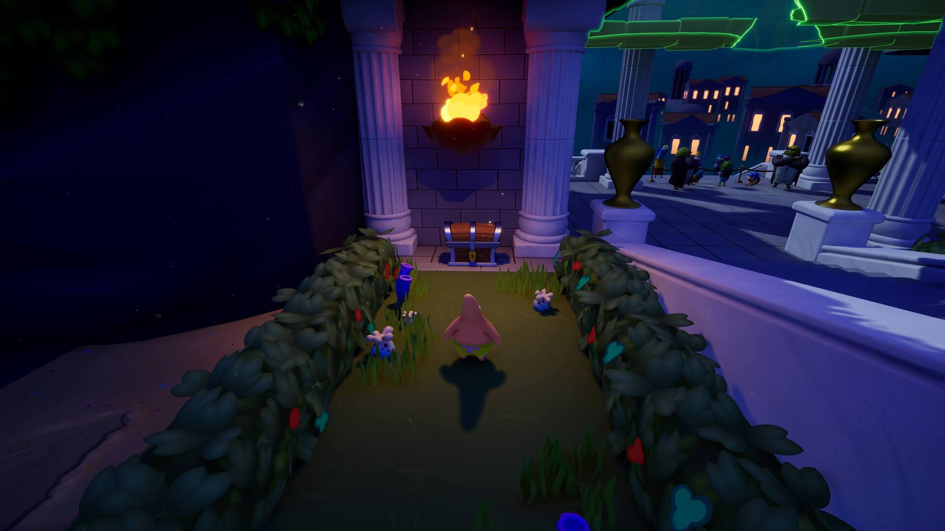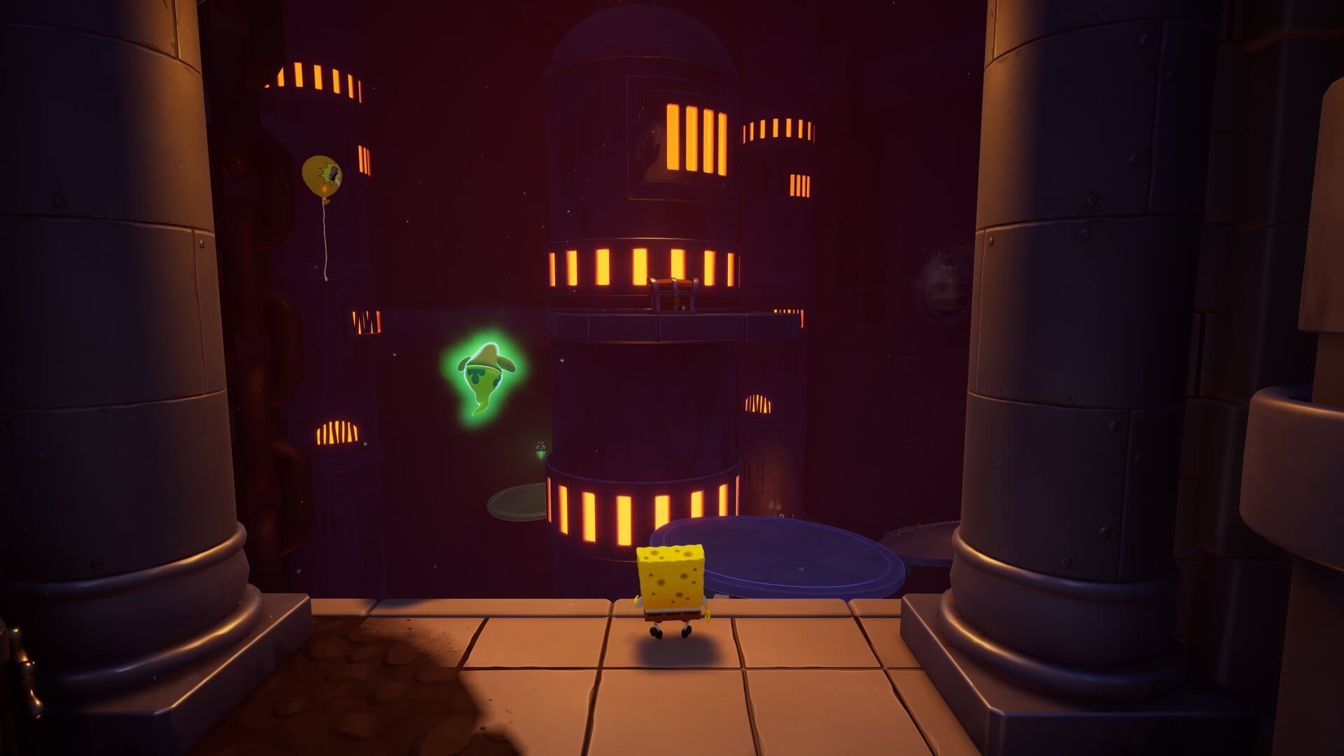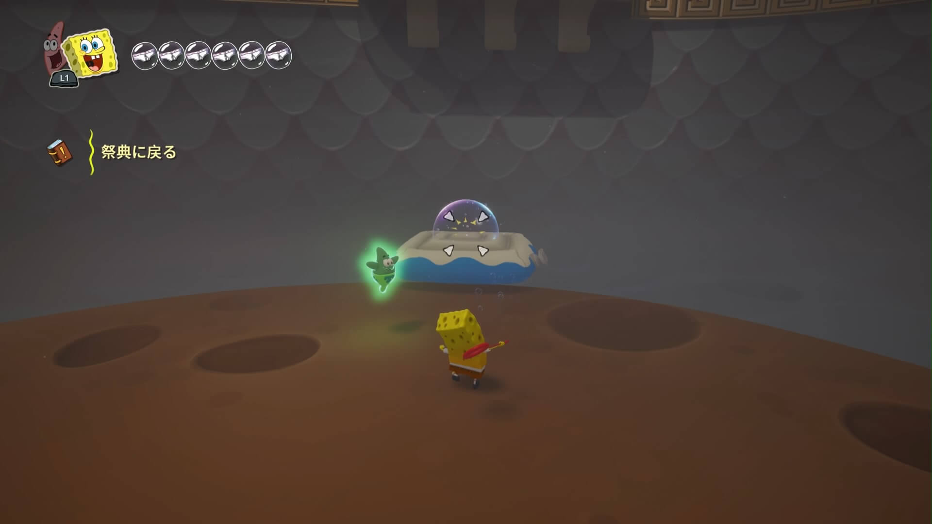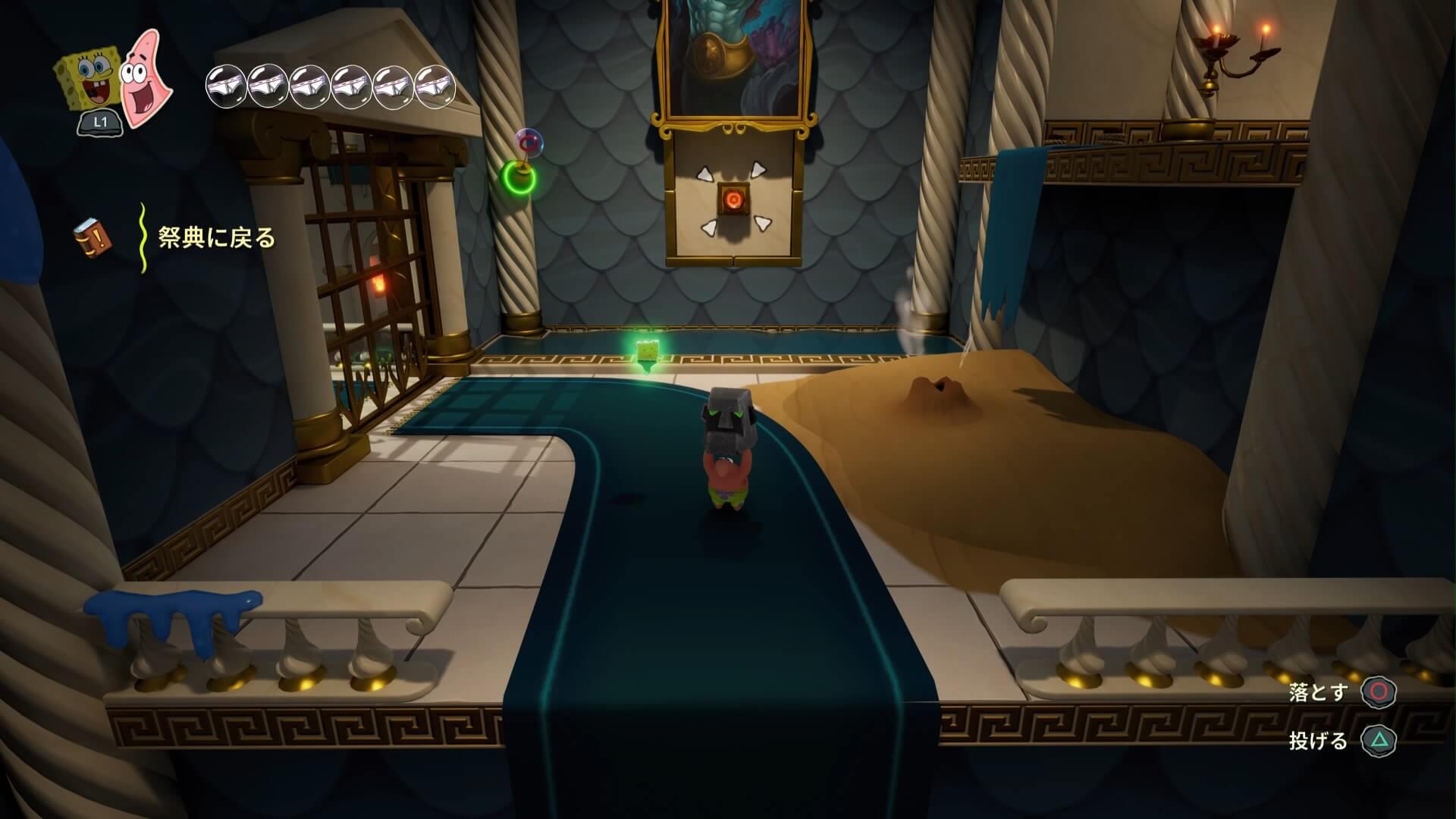 祭典に戻るには「鉄格子」を開かねばならず、レバーを「シャボン」で上げると、額の奥の「隠しスイッチ」を発見できる。パトリックで右の段差を登り、木の板の下に隠された「ストーンティキ」をぶつけよう!