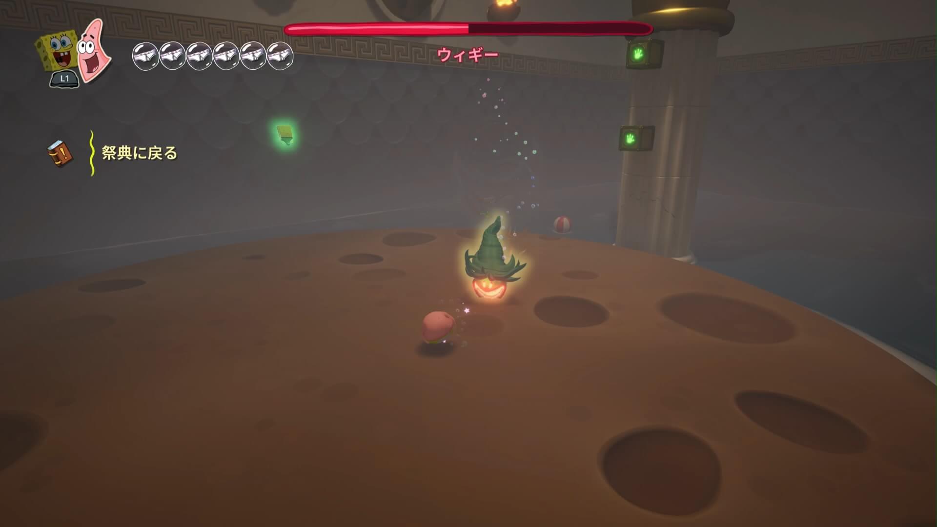 ウィギーは「進時のみ下降するので遠距離攻撃」が基本。パトリックに交代し、周囲の「ビーチボール・石鹸」をぶつけよう!遠くの水上に落ちても掴める距離なので、気にせずどんどん投げ付けて問題ない。