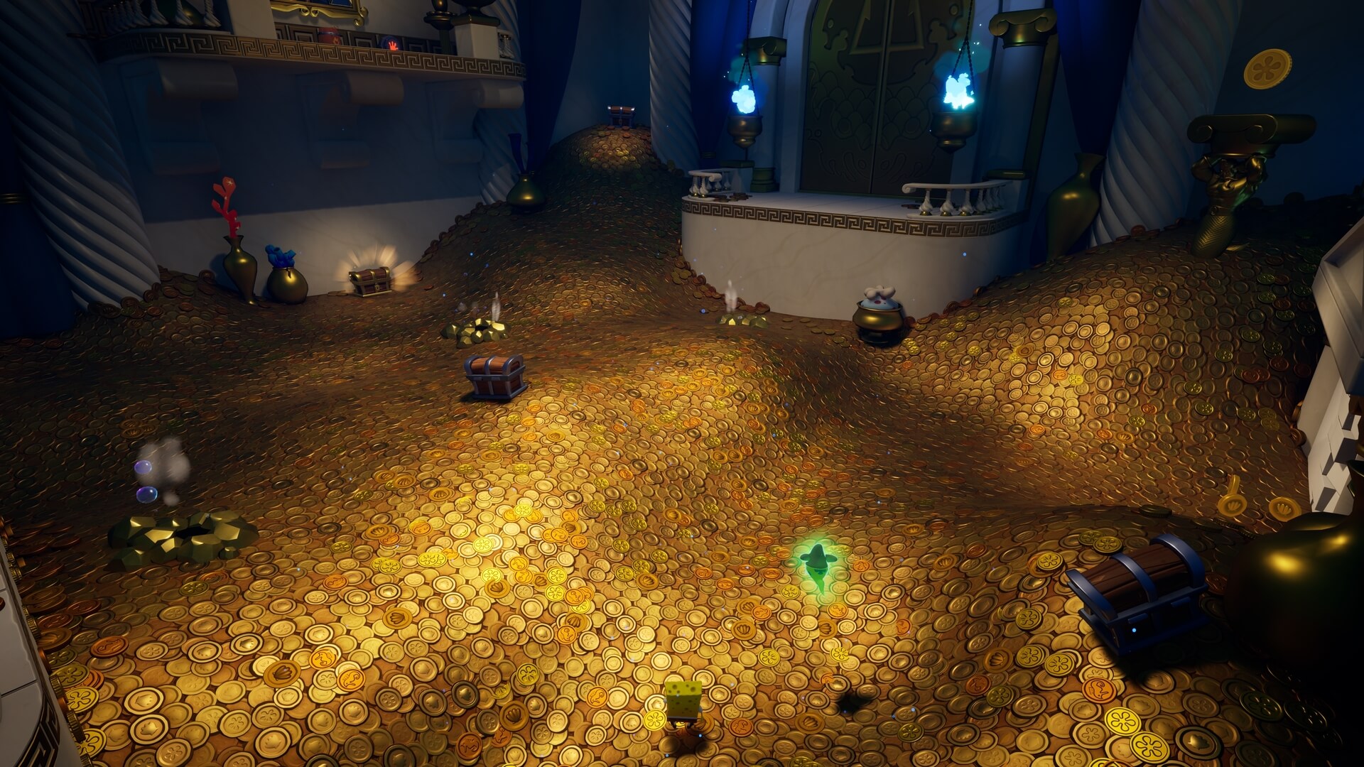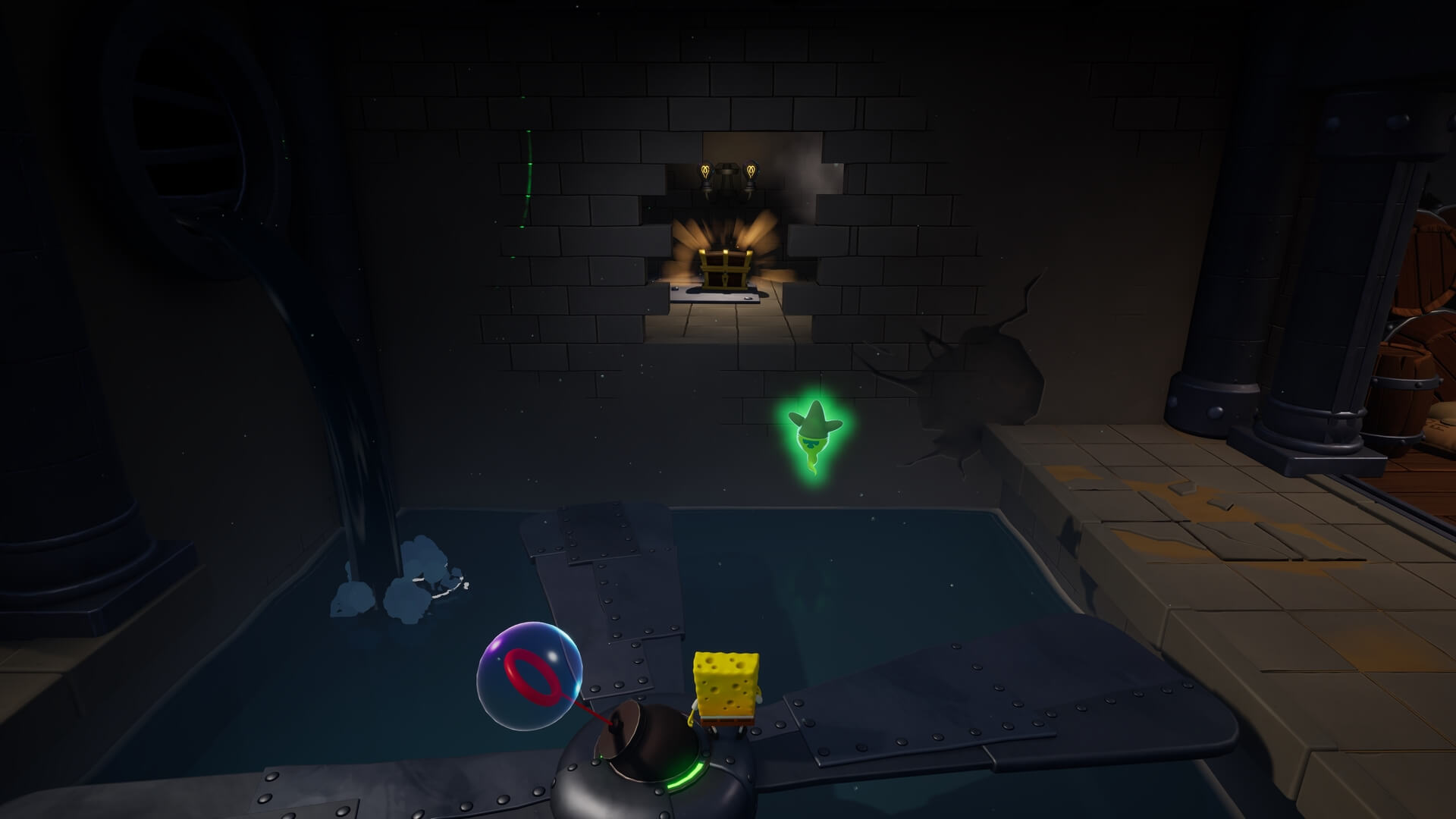 右の足場にある「爆弾」を使って壁を壊し、リフトに乗って下へ。巨大ランタンを「緑」に切り替えた後、リフトに乗って宝物庫に戻れば、扉が開いて先へ進めるようになっている。(リフト用のスイッチは不要)
