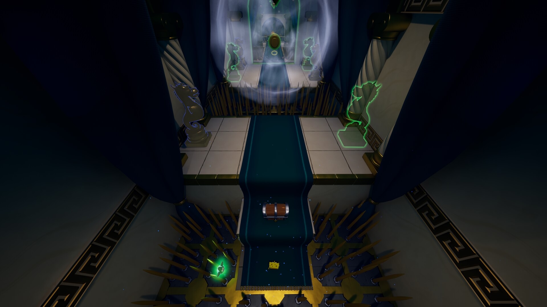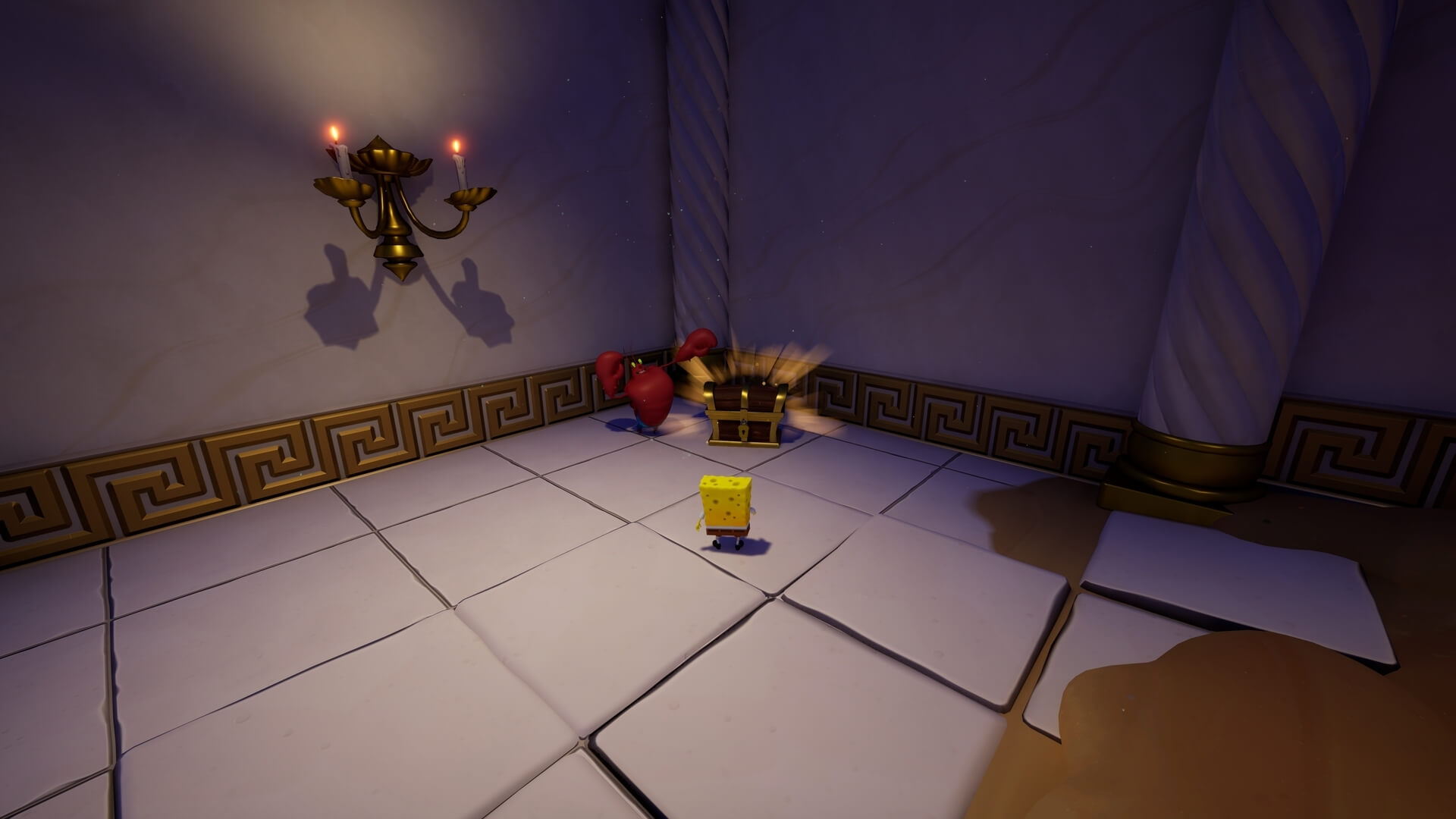 天井裏に入った後は「天井からトゲ」が接近するトラップが作動。急げば何度か挑戦可能だが、トゲに接触する時点でほぼ詰み。仕掛け全ての作動は不要で、単純に「スポンジ・ボブ」だけで進めば失敗しにくい。