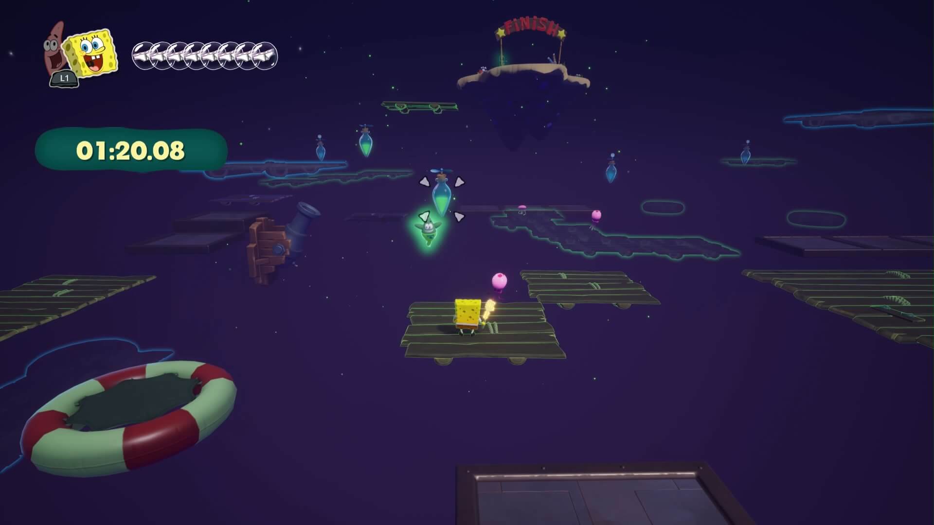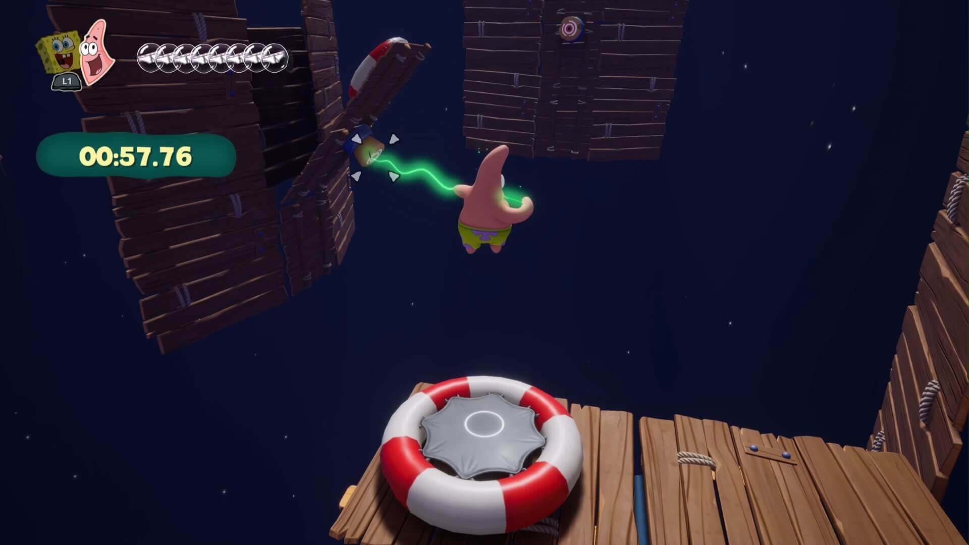 3戦目はパトリック。掴んでぶつけるの繰り返し。クリア後なら「黄金のフライ返しグランドスラマー」は一撃。届かない「高所にいるおばけ」は下からぶつけて倒そう!(近過ぎると照準が出ないので注意)