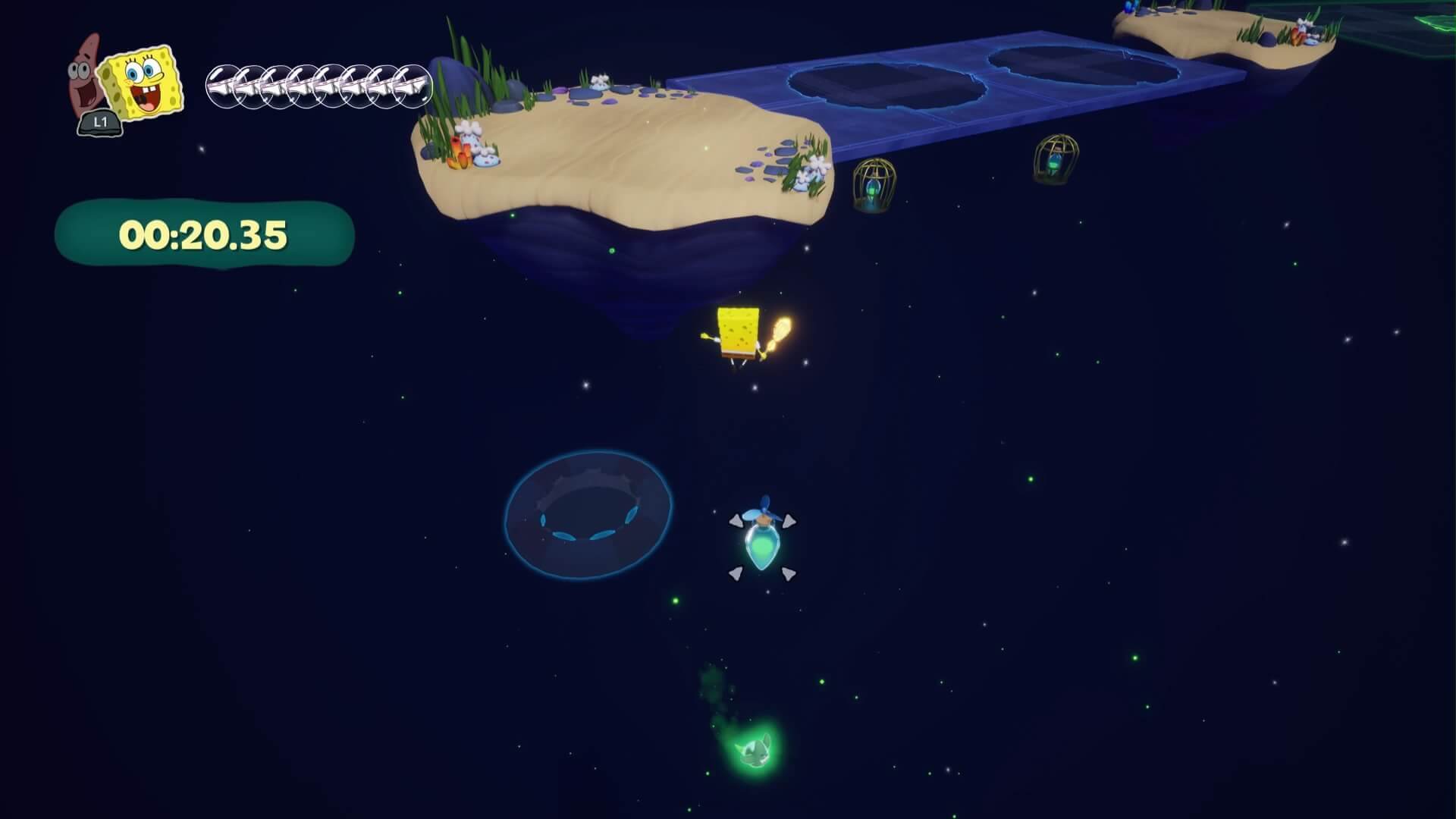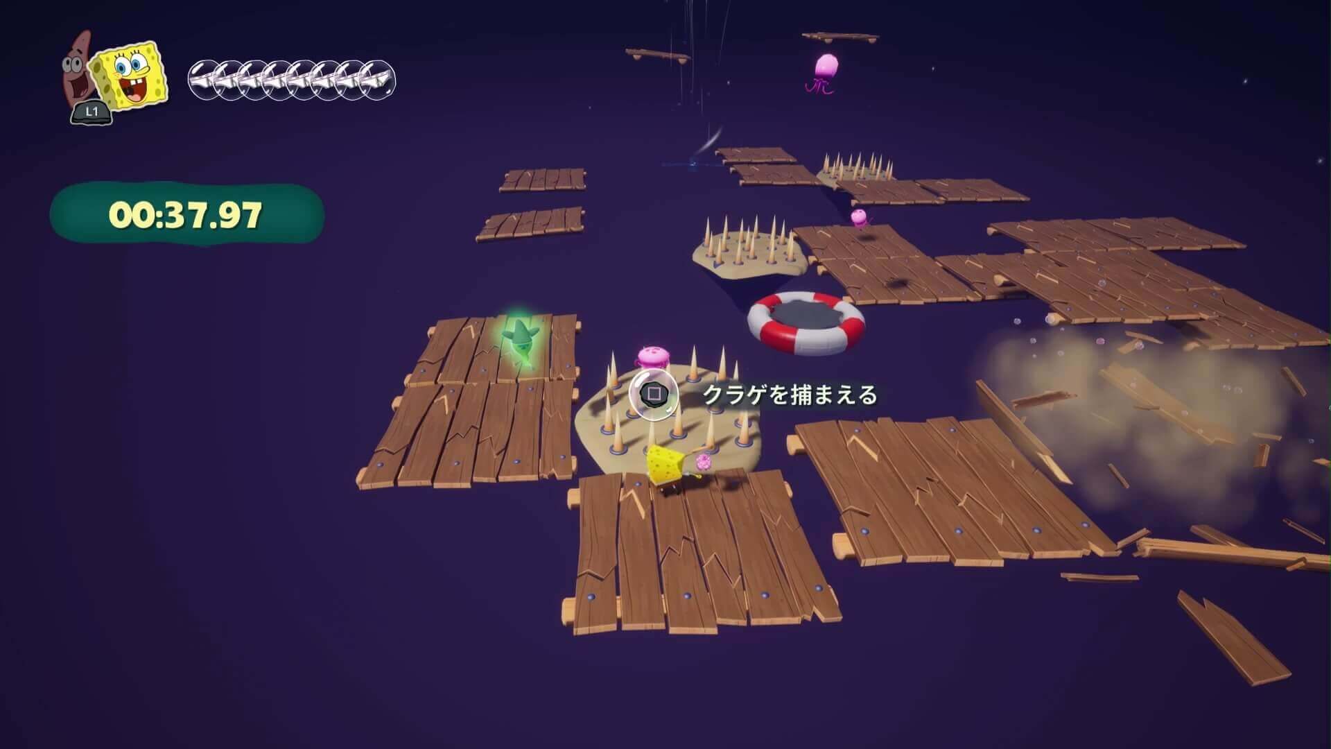 右に曲がって1匹と、ジャンプパッド周囲にいる3匹のクラゲを捕まえる。