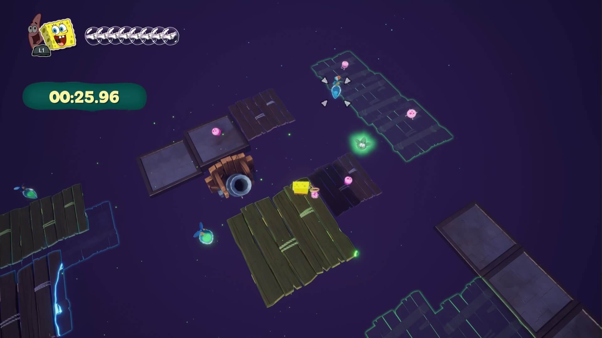 大砲がある方向に飛び下り、角に沿って4匹のクラゲを捕まえる。